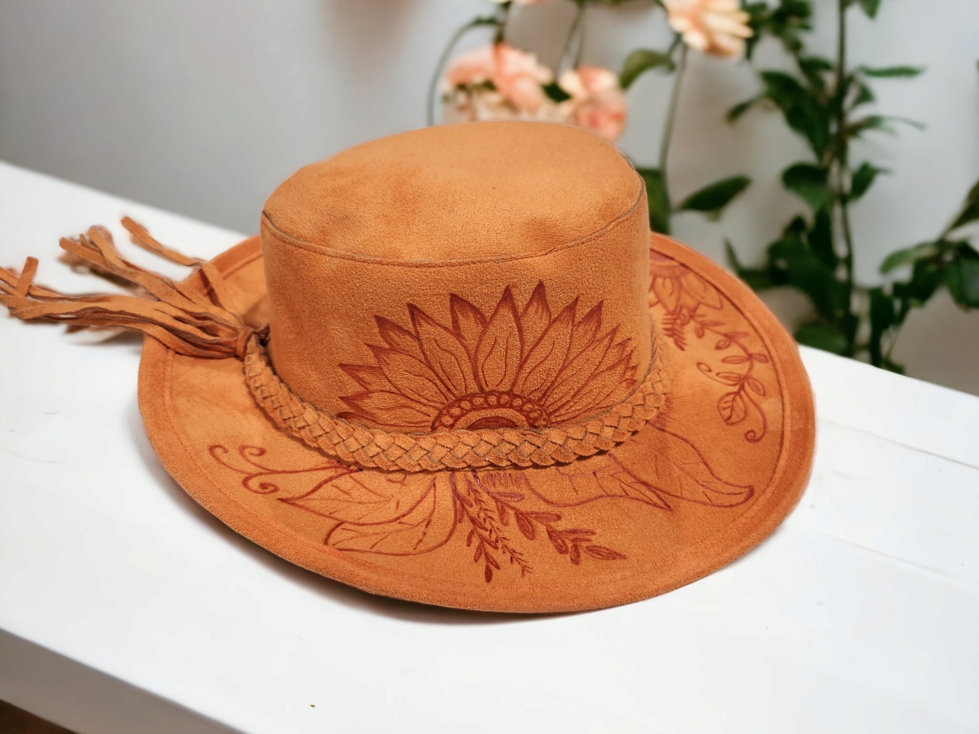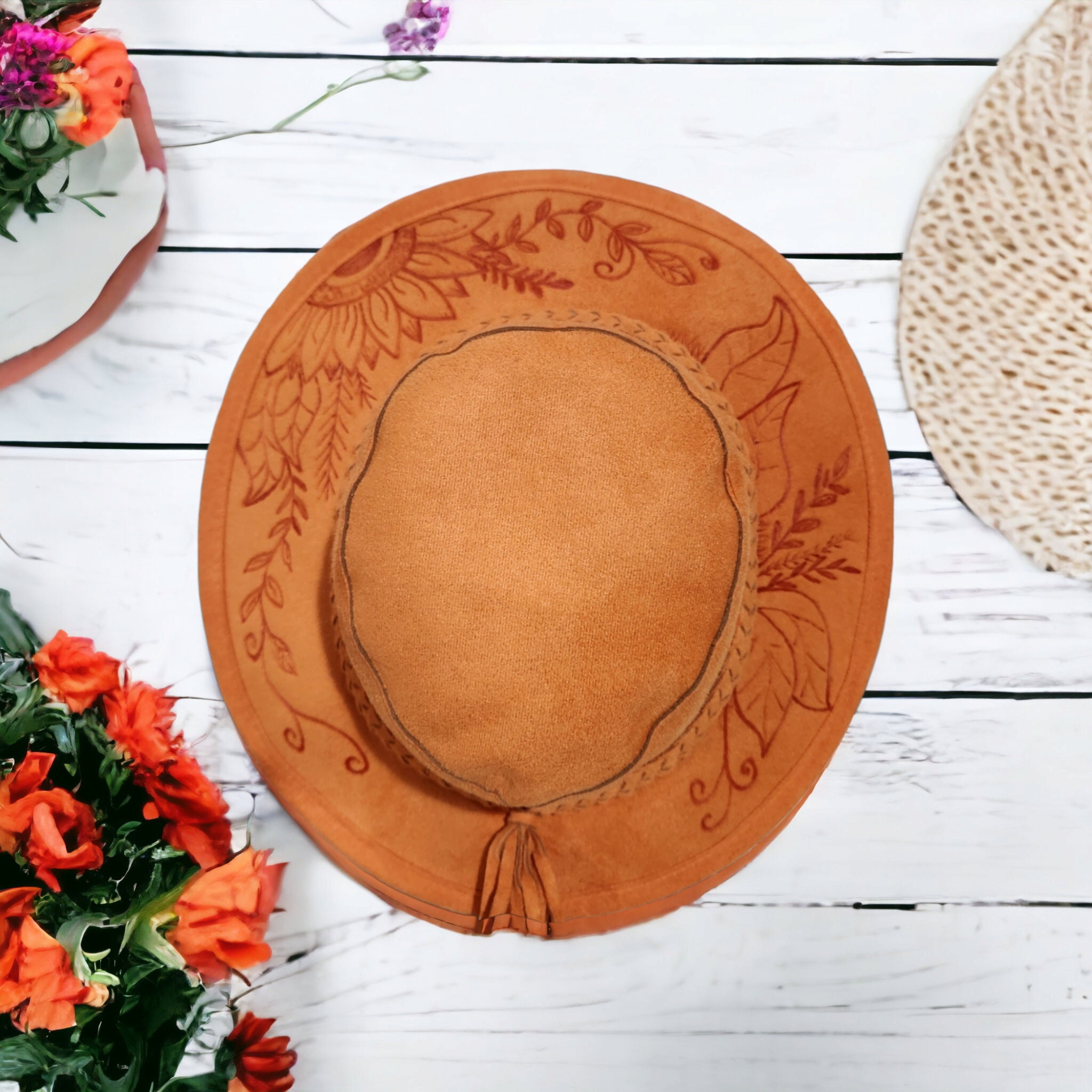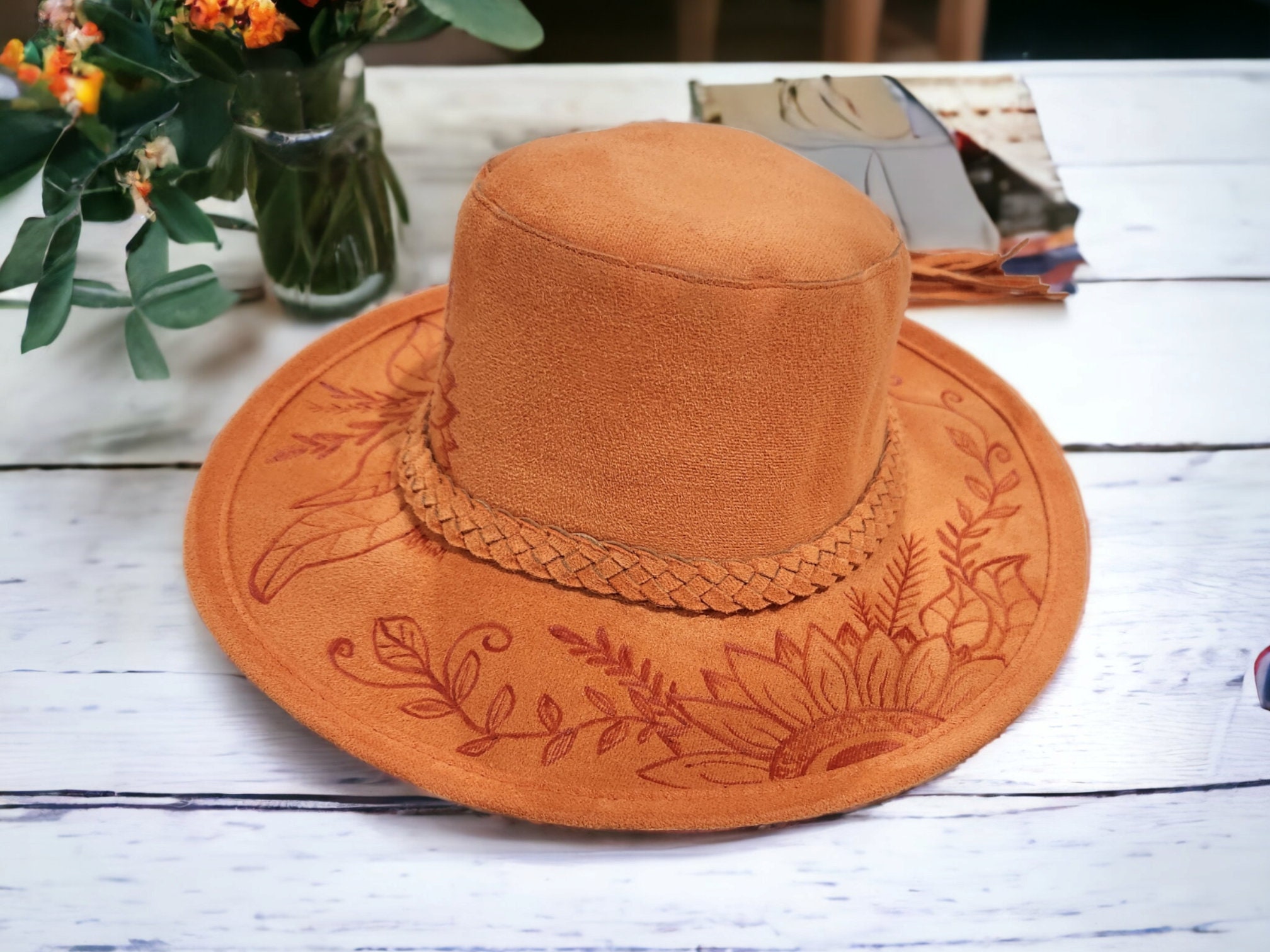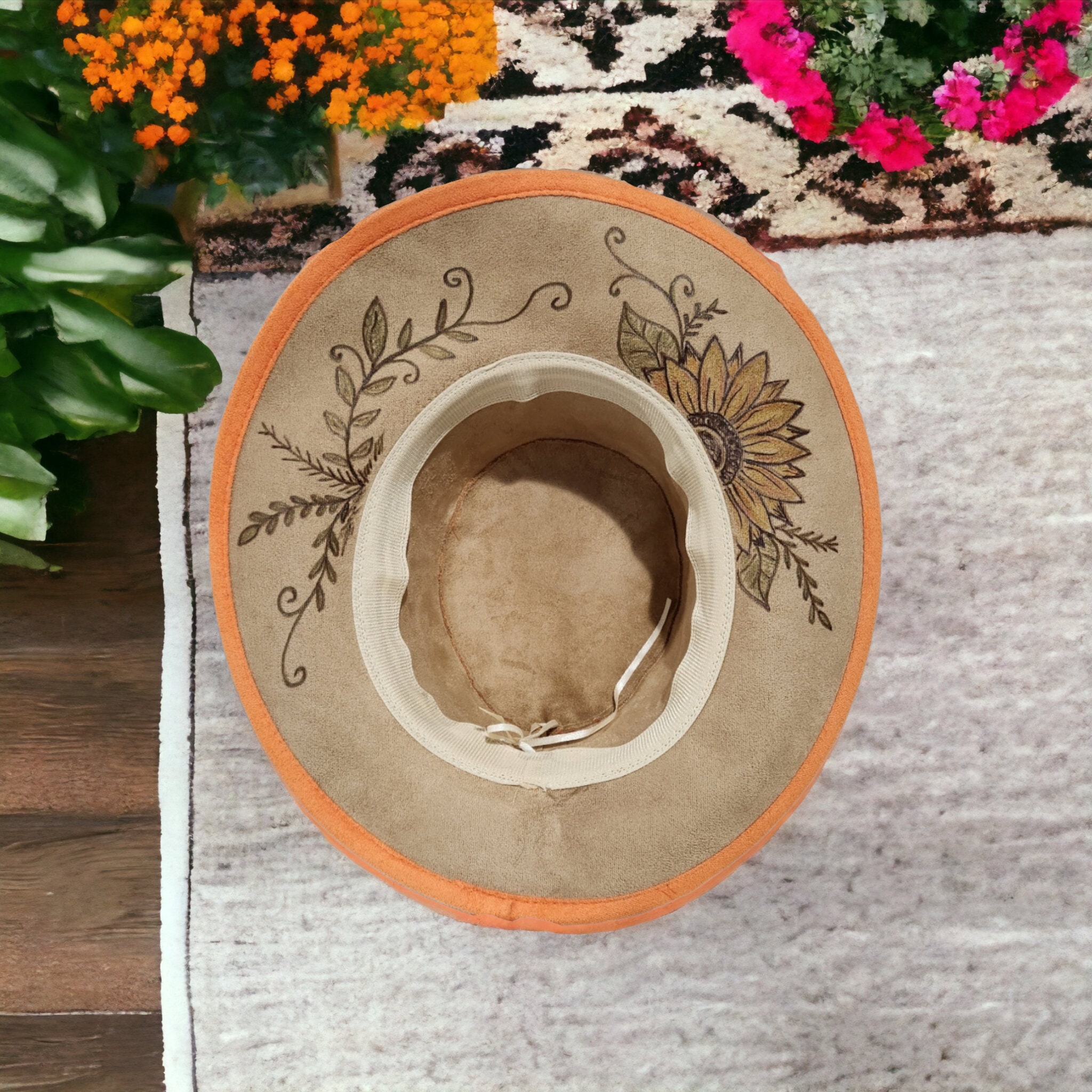 Really cute Sunshine Orange colored "faux"suede Panama - Fedora Hat. Hand burned. Super cute hat with a nice band.