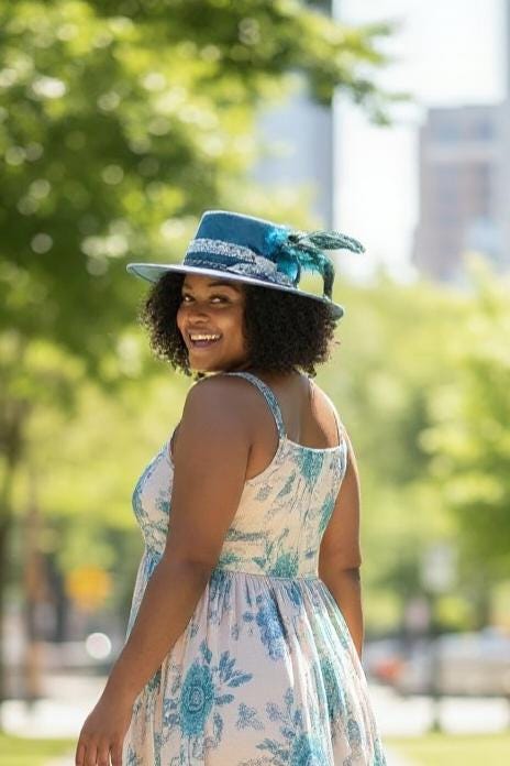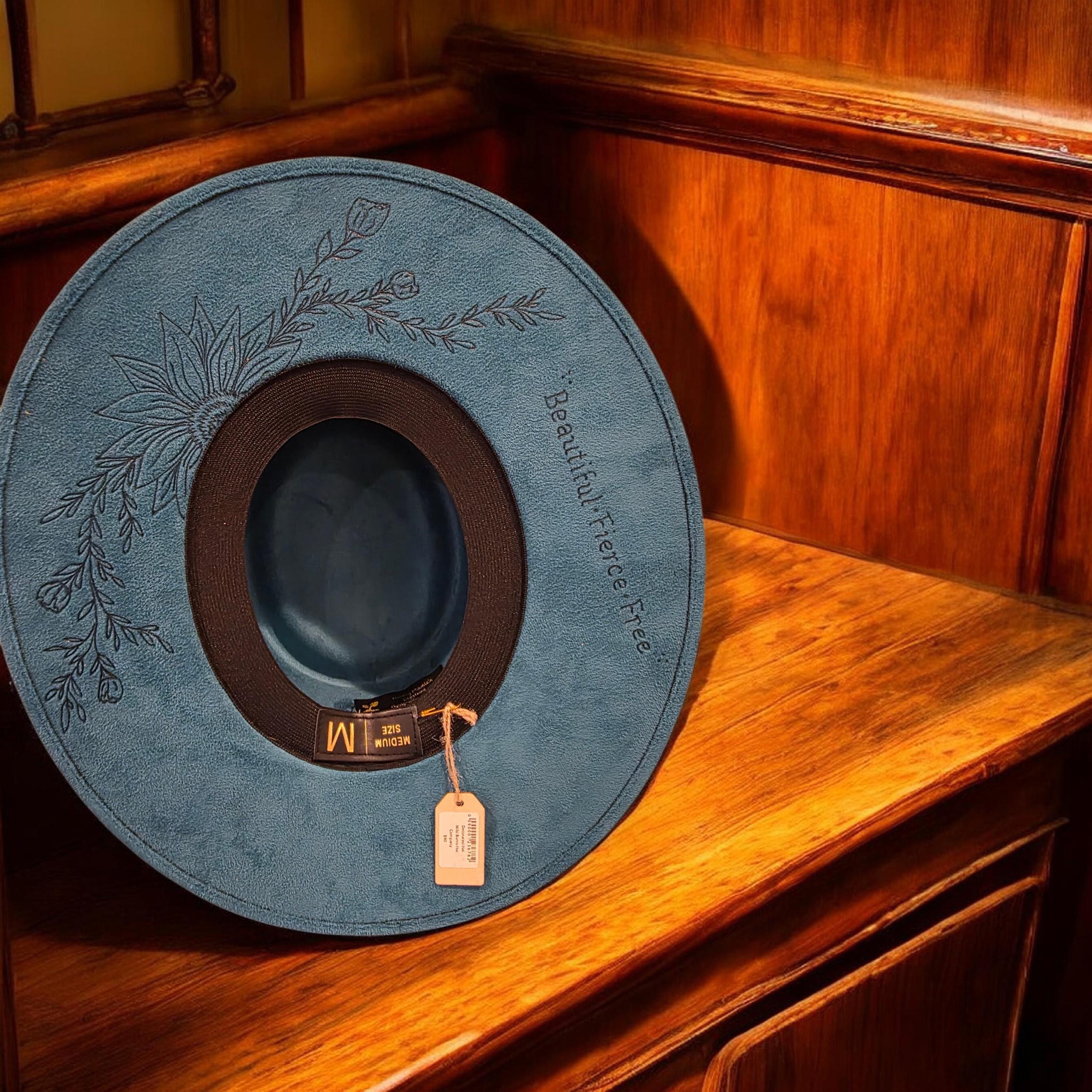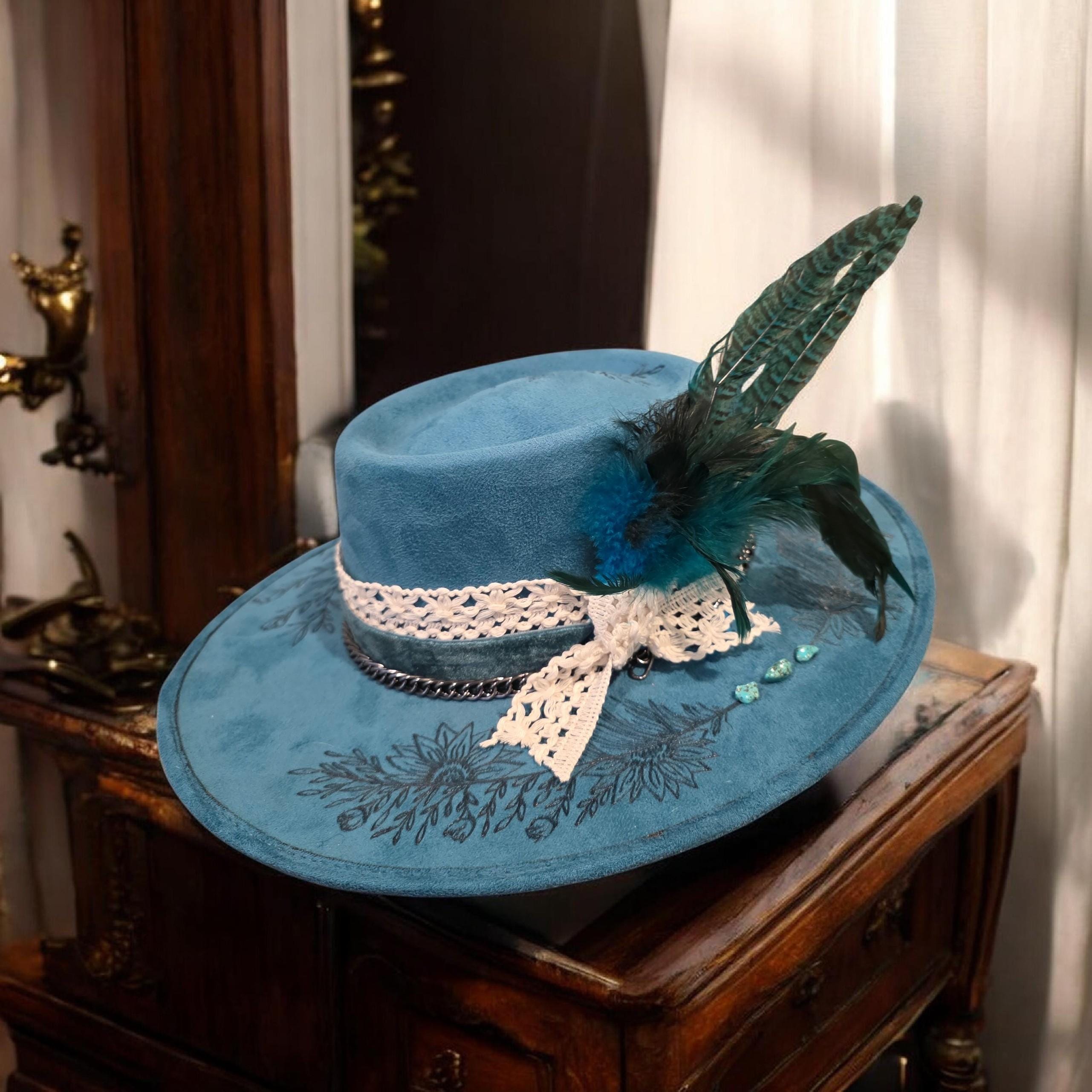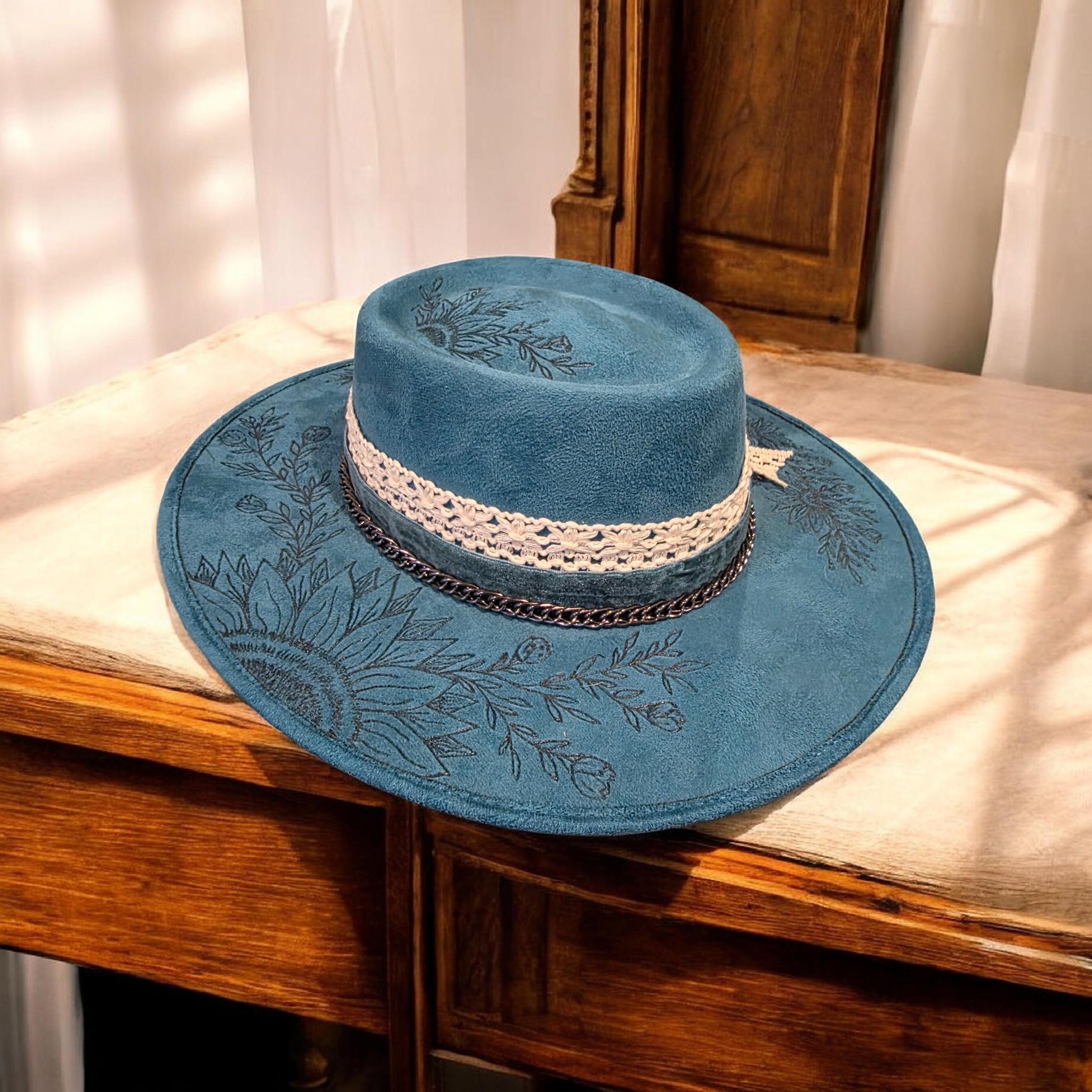 Really pretty teal colored wide brim Rancher Hat. Has flowers engraved throughout the hat. Is also Burned underneath the brim for extra style.