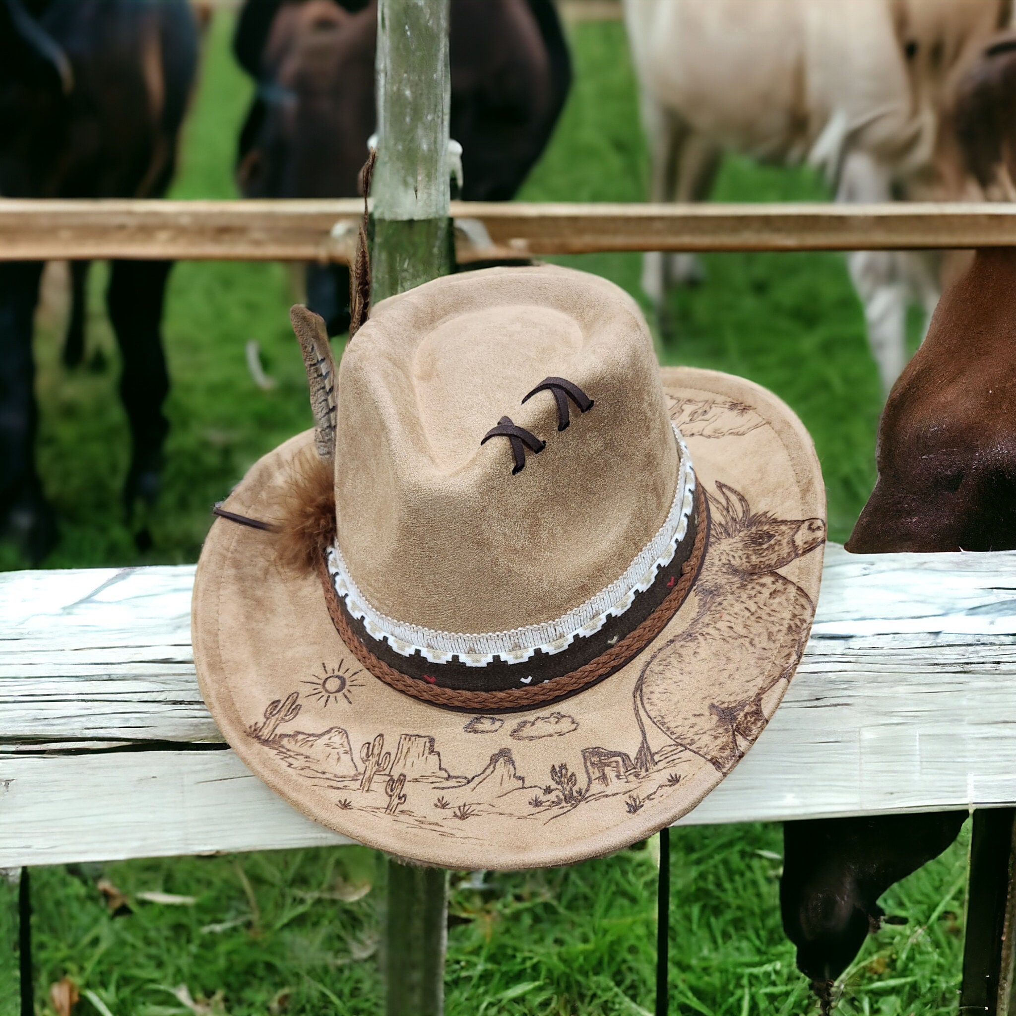 Hand Burned Tan / Light Brown faux suede cowboy style hat.