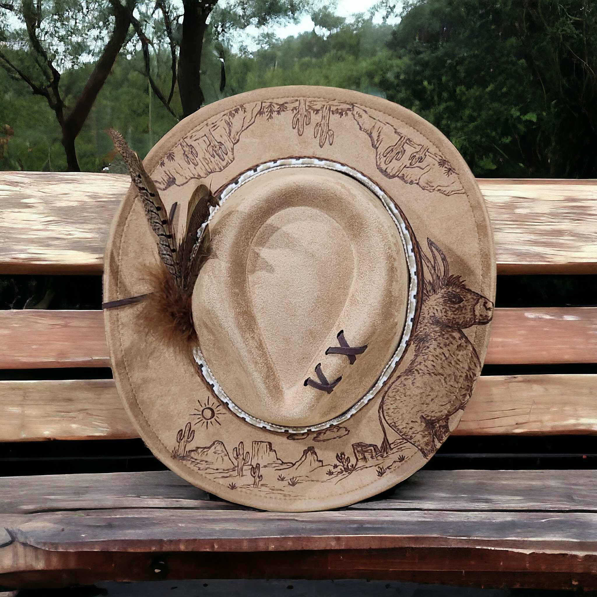 Has a desert scene and cute Wild and Free Roaming Burro around the brim and on crown front.