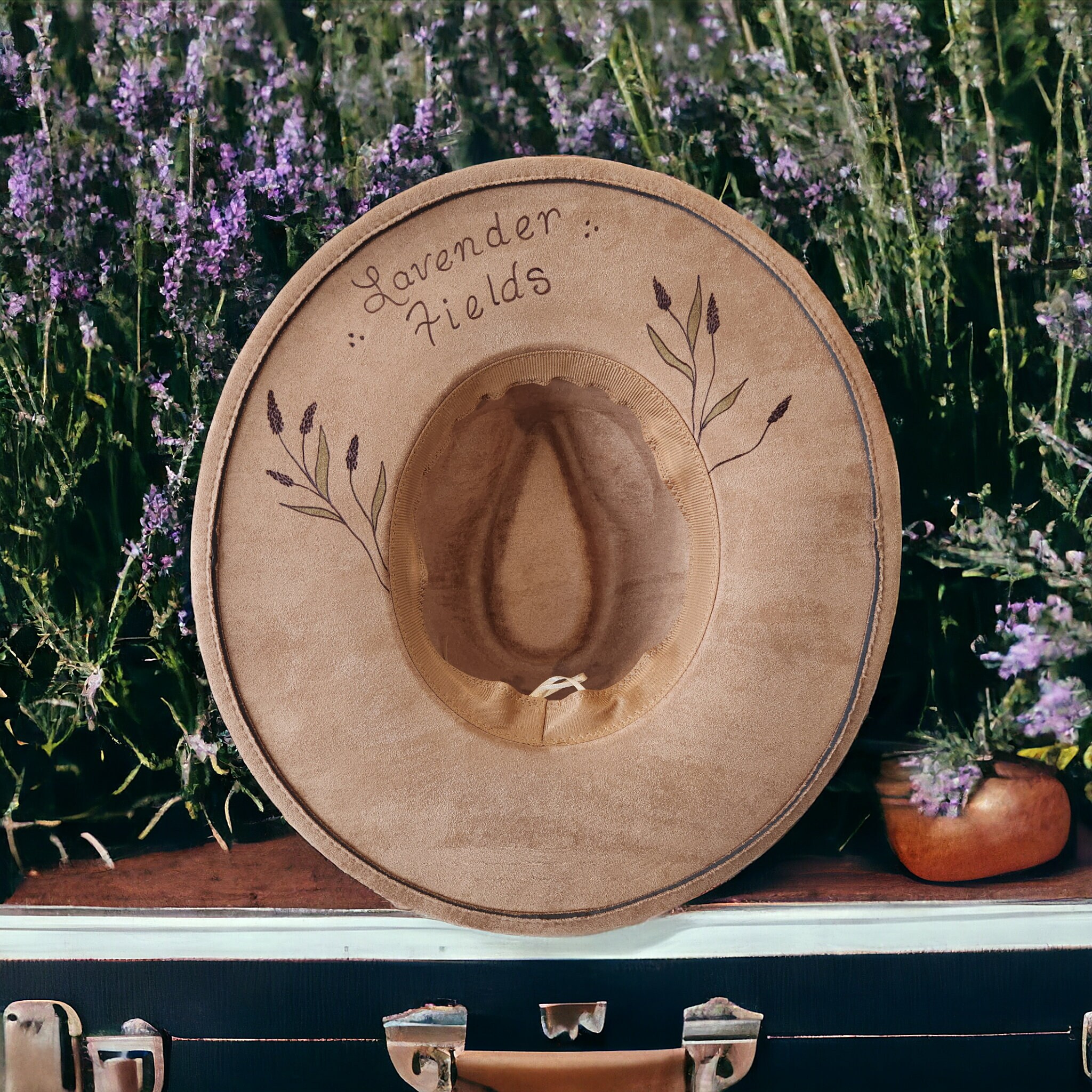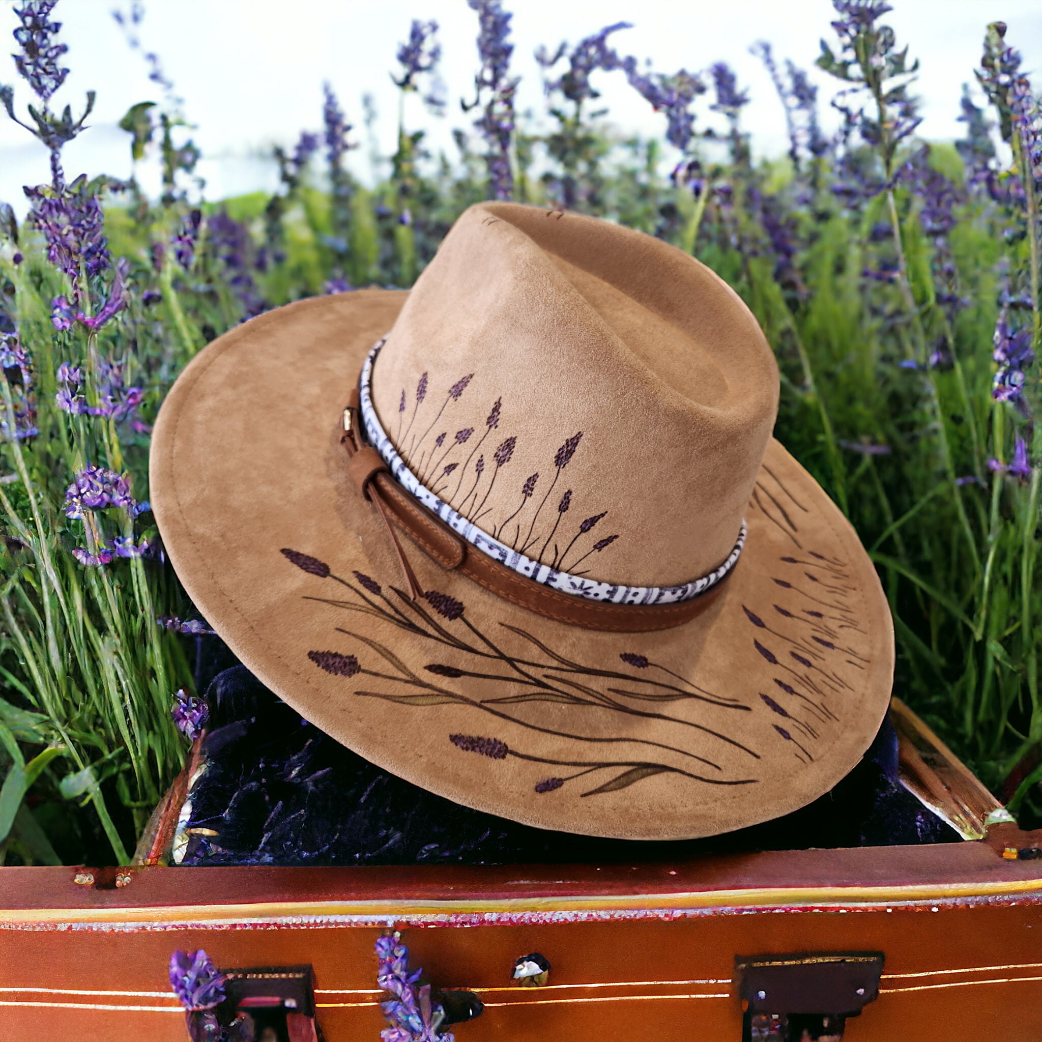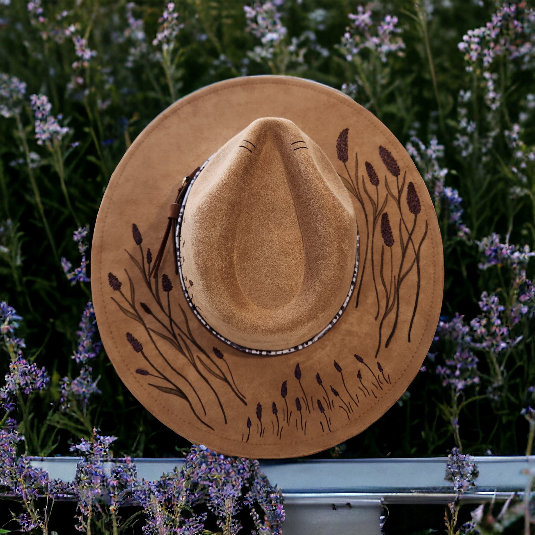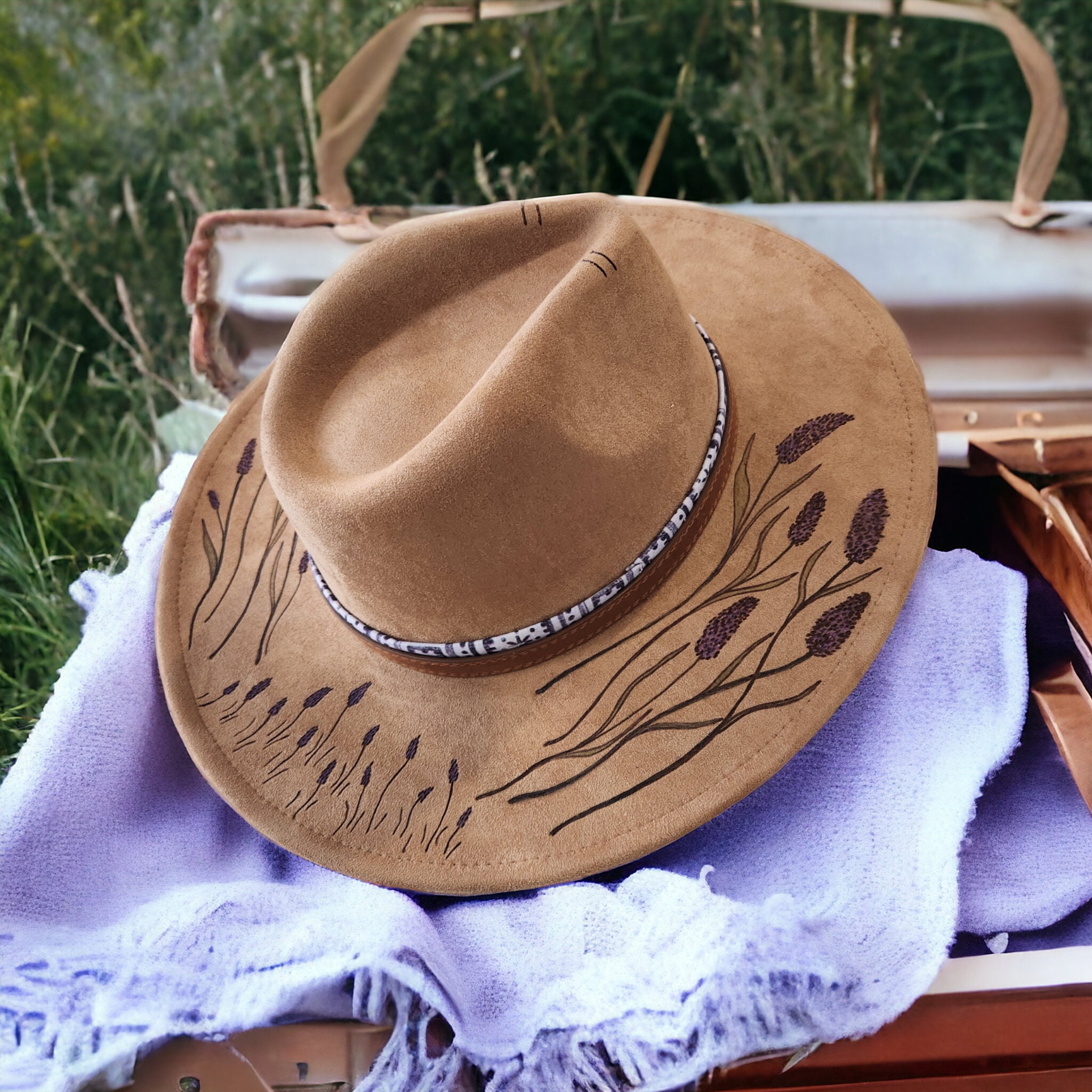 Simple and elegant - Really pretty brown colored "faux"suede Panama - Fedora Hat. Hand burned and painted with high quality products that will not chip or flake.