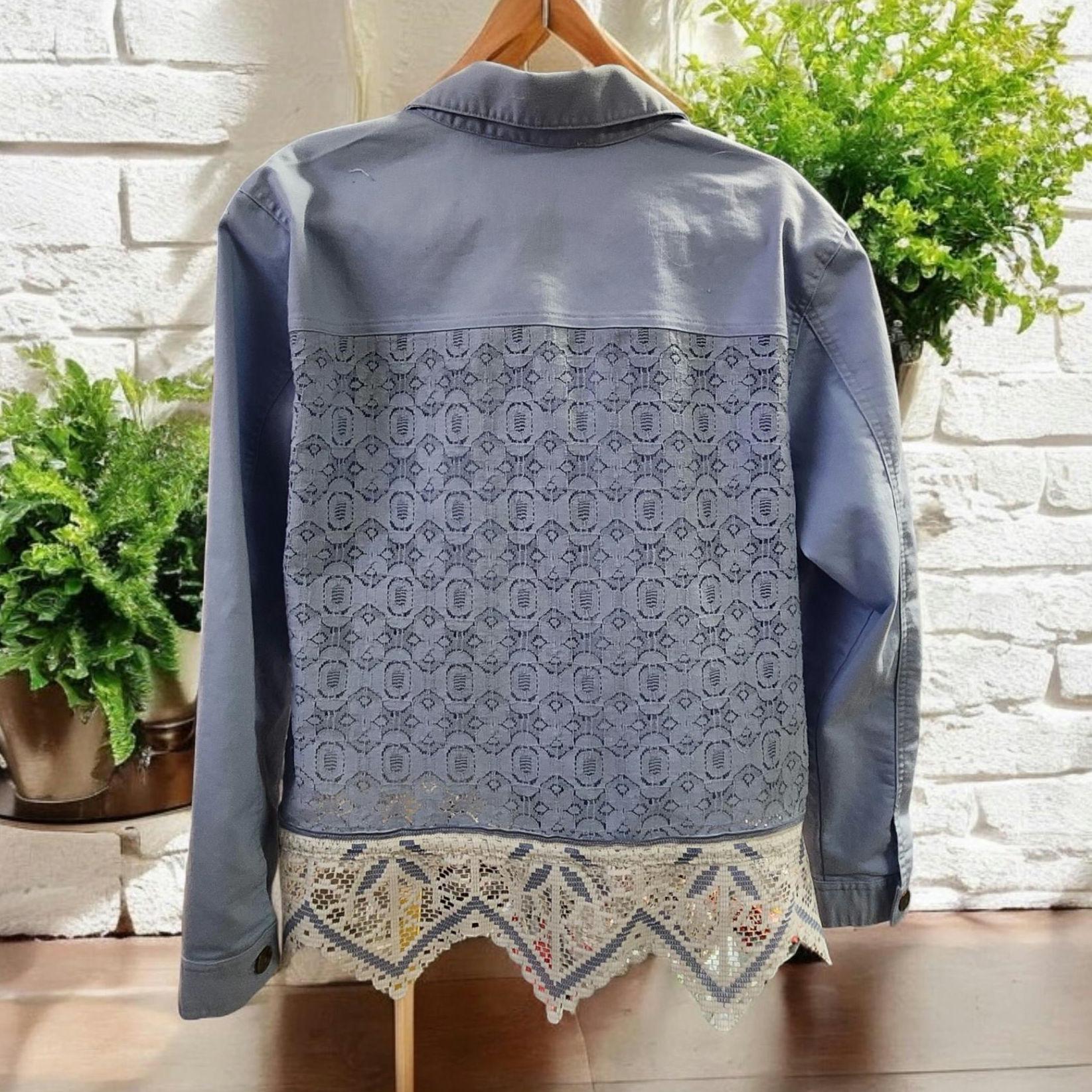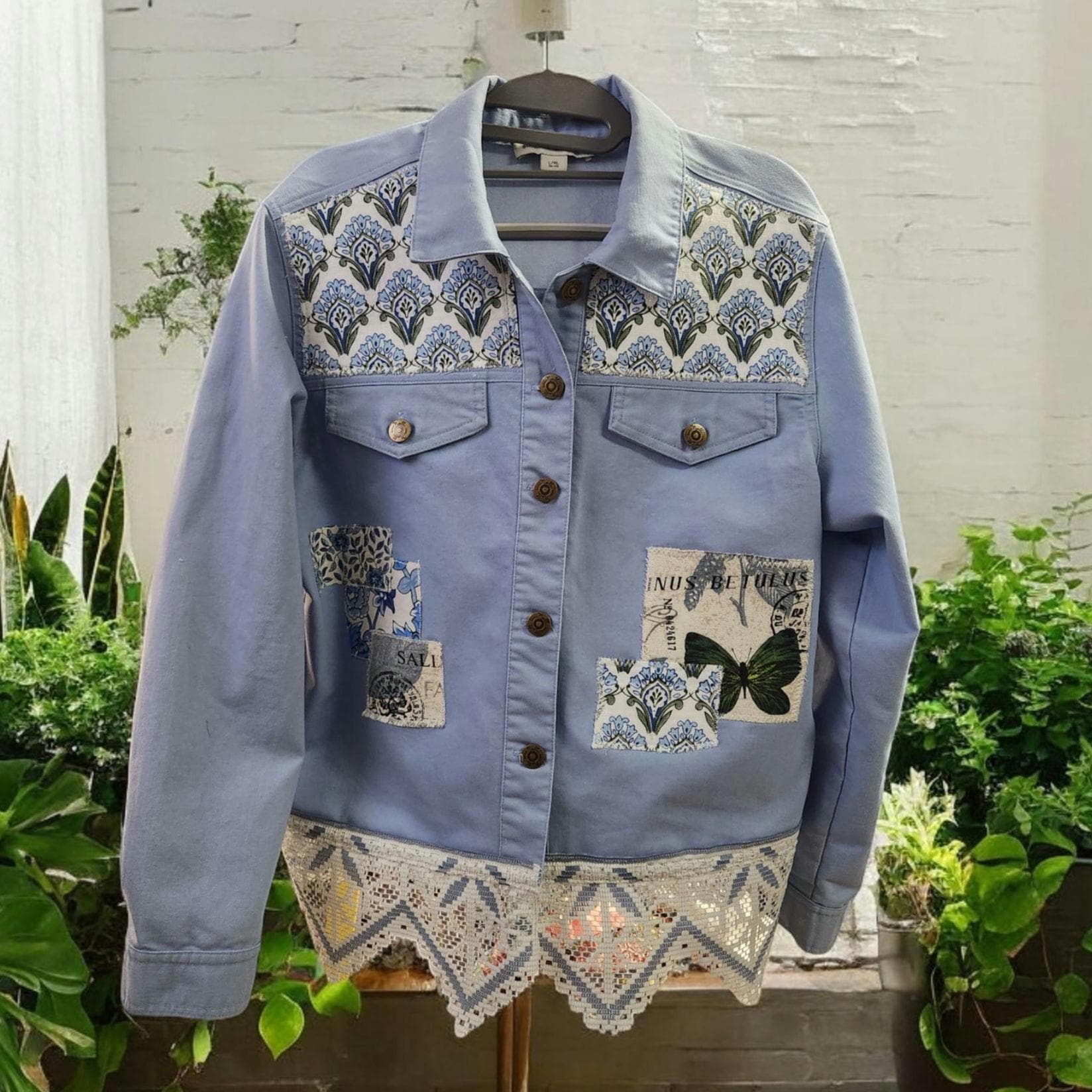 Upcycled light blue denim jacket using a really cool laces and fabrics.