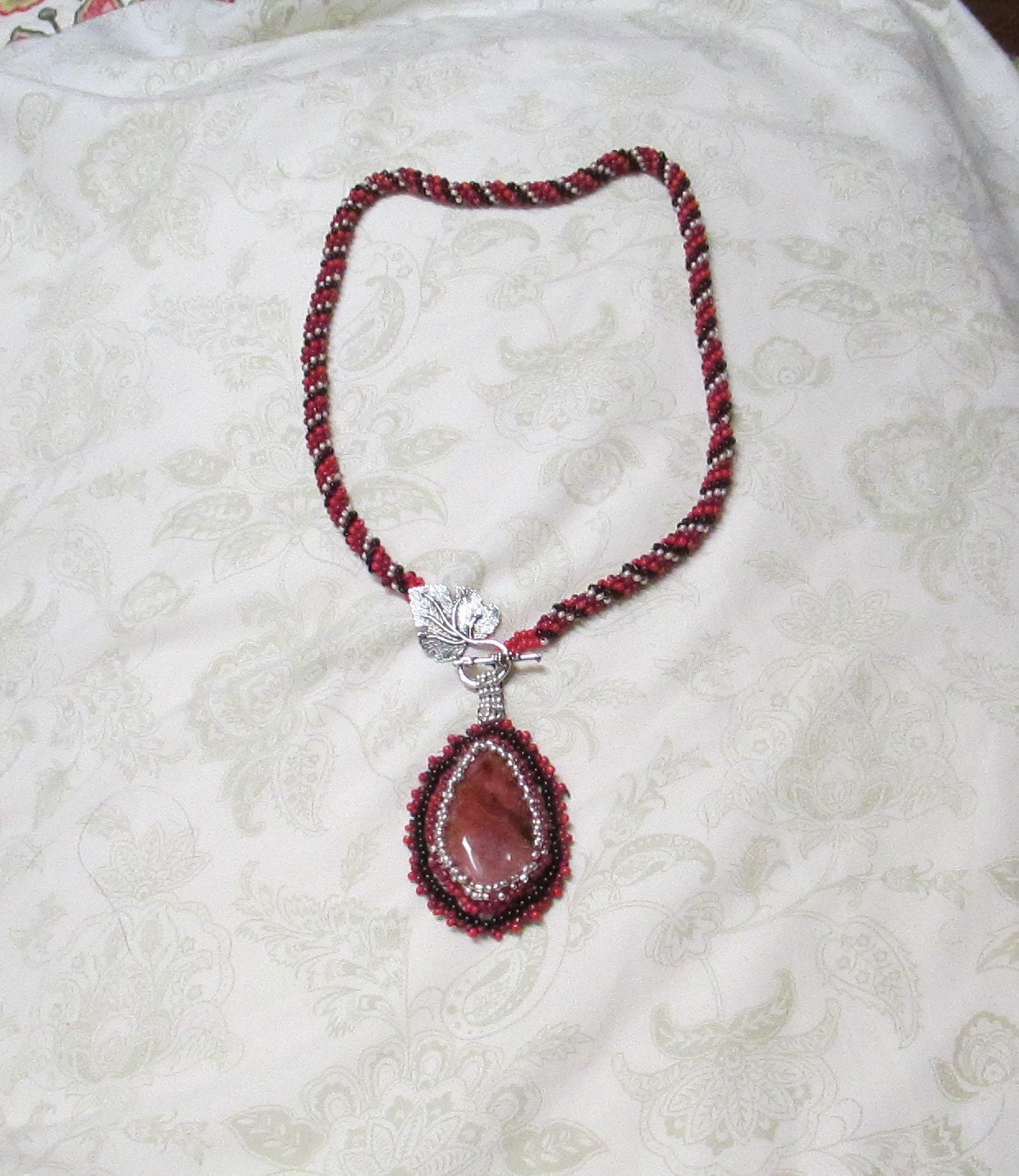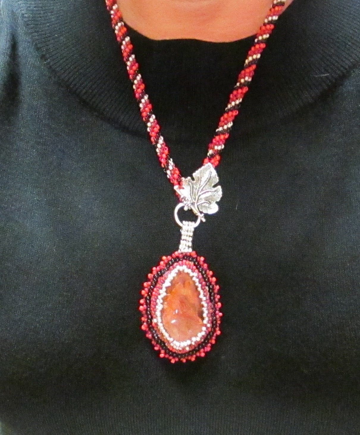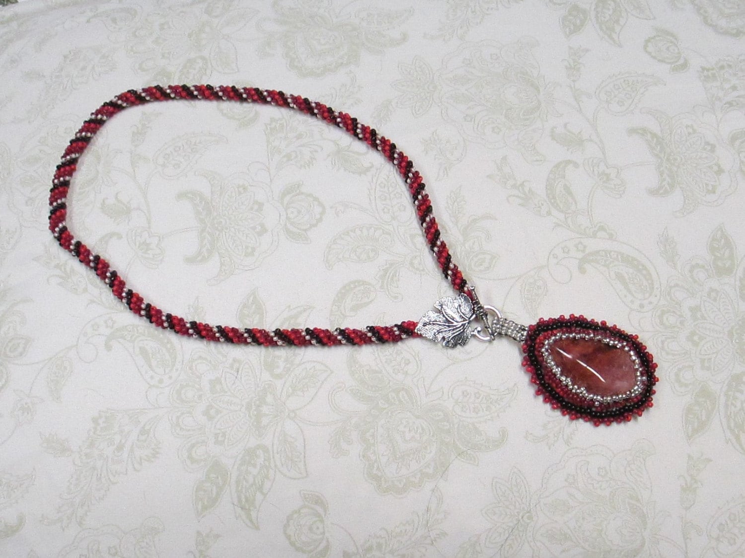 This pretty Orange and Black necklace was all hand beaded with a peyote stitch and attached to a beautiful silvertoned leaf toggle and has a beautiful multi shades of rust and orange polished stone with bead embroidery around it.