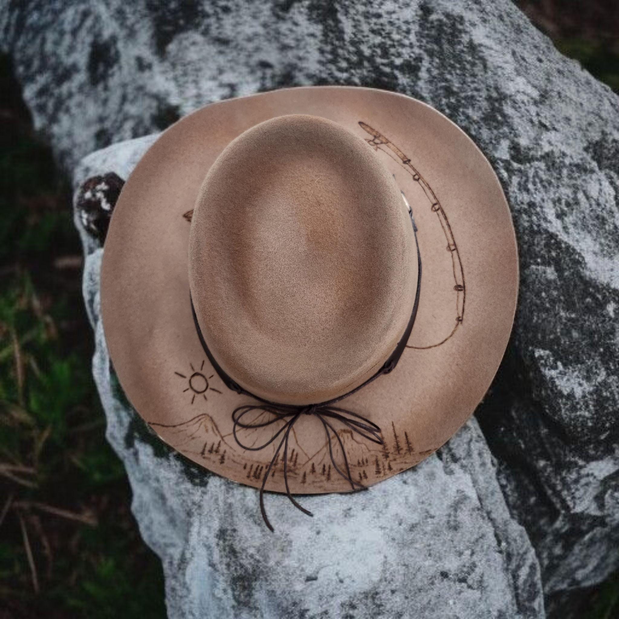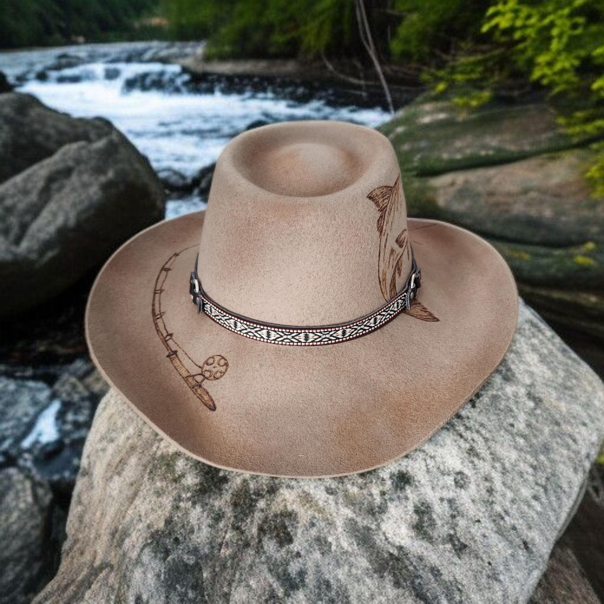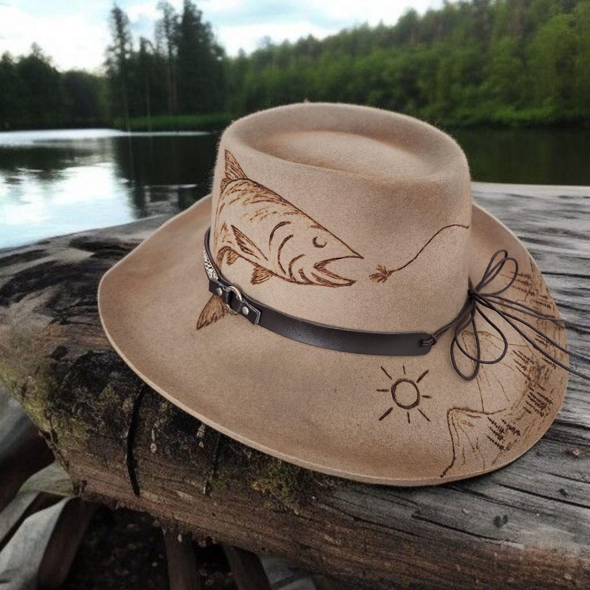 100% Australian Wool Fedora. Hand burned and painted with a distressed look. Has mountains and trees, and a fish going after his bait Burned into the hat.