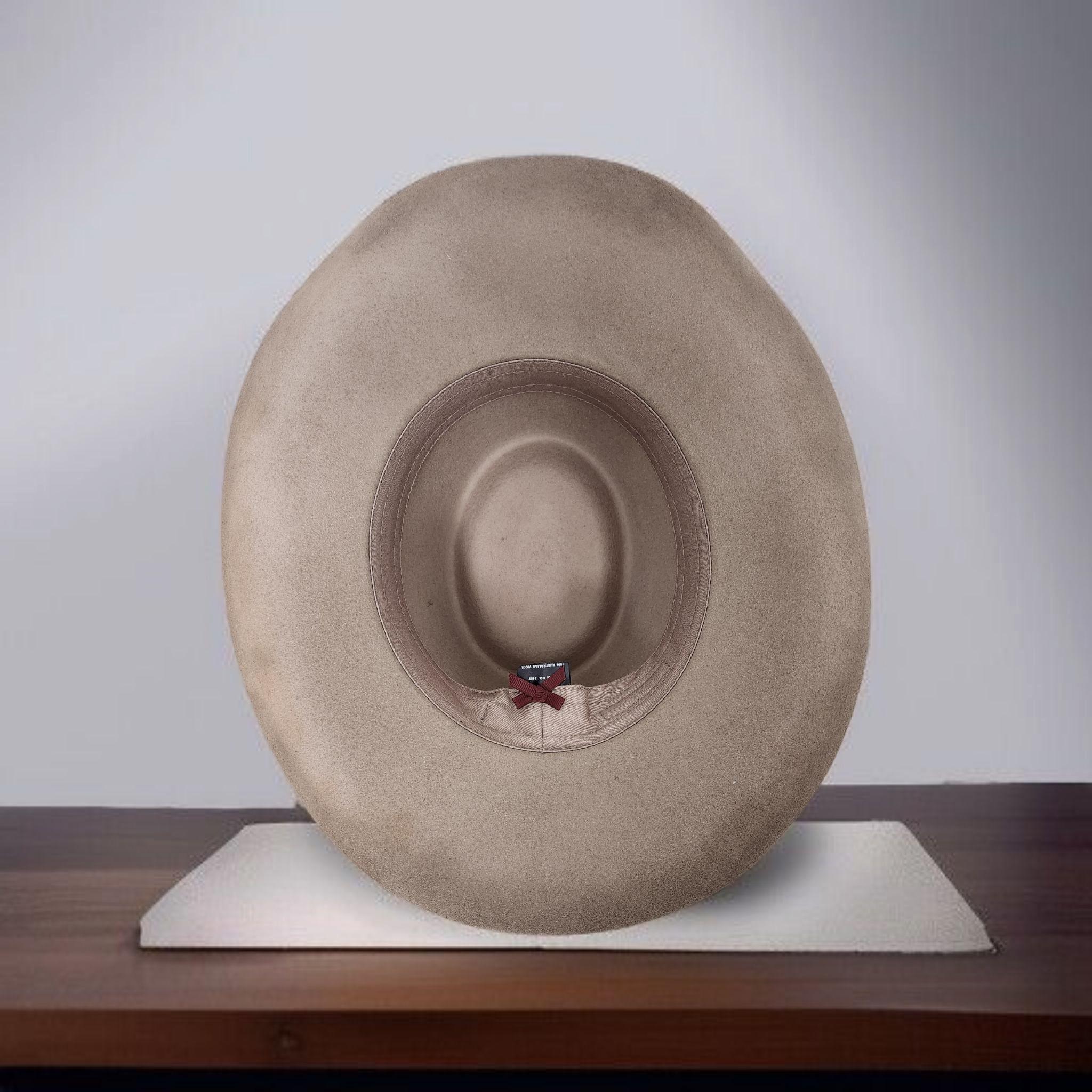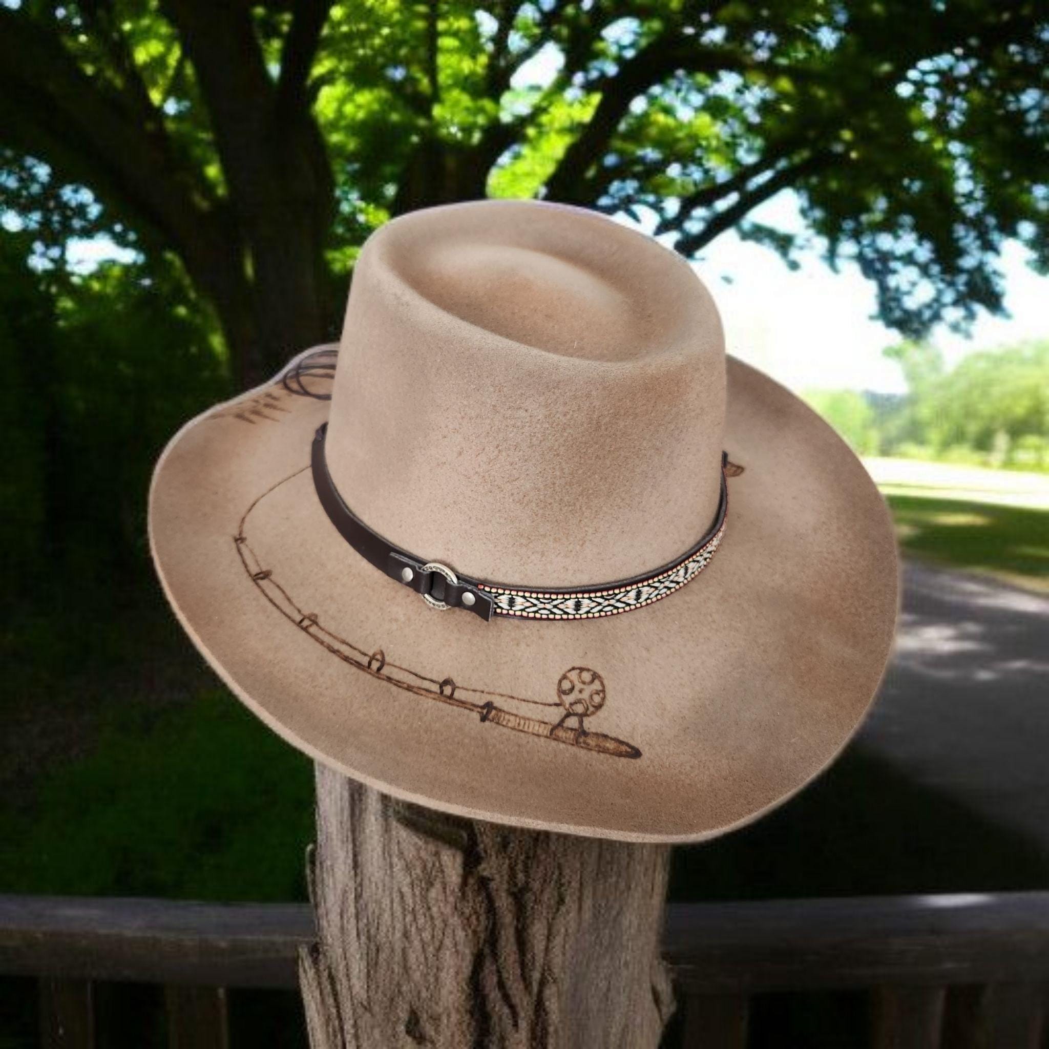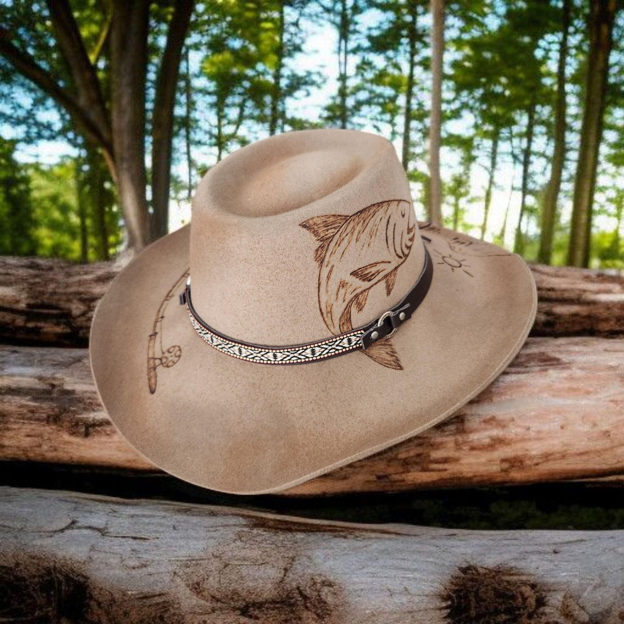 100% Australian Wool Fedora. Hand burned and painted with a distressed look. Has mountains and trees, and a fish going after his bait Burned into the hat.