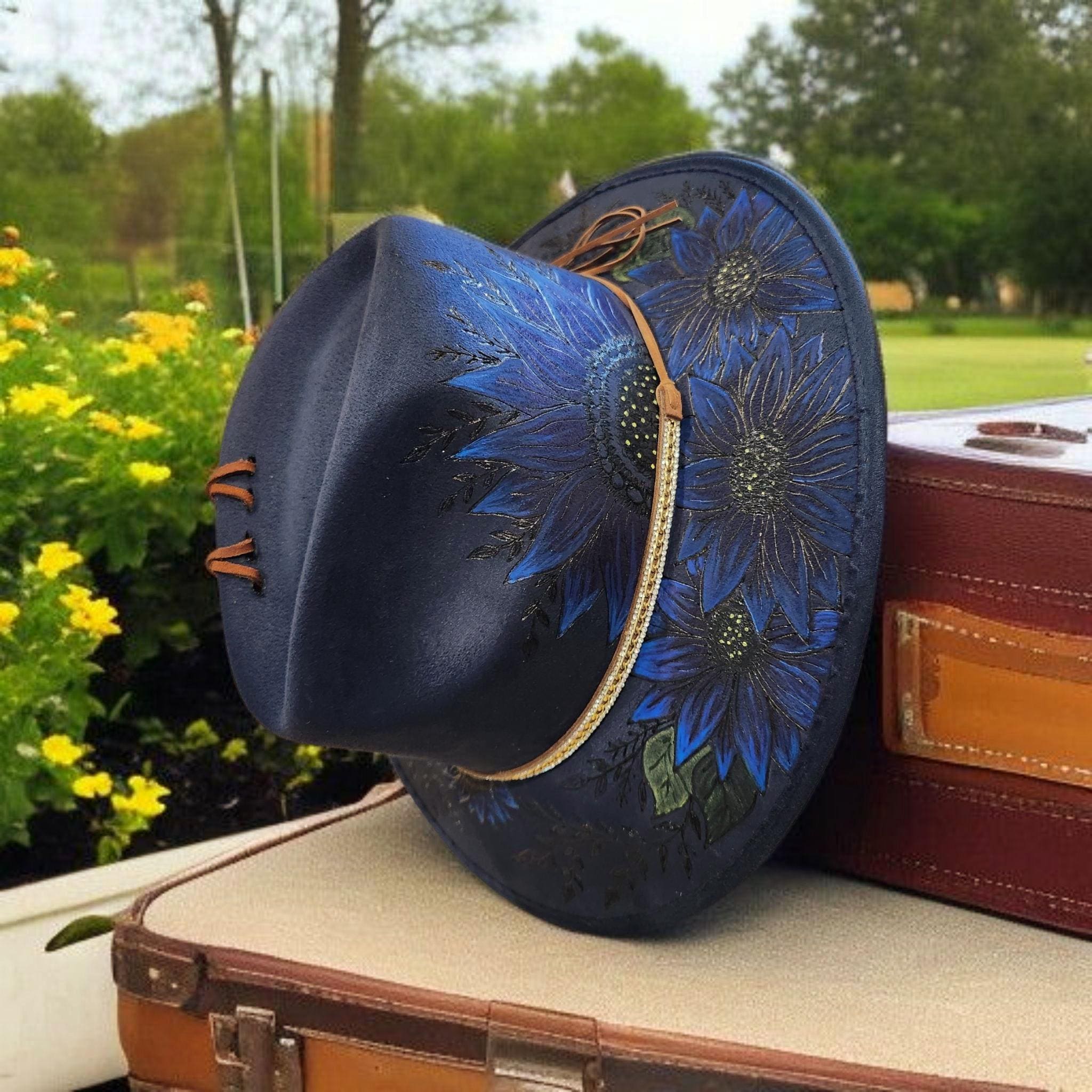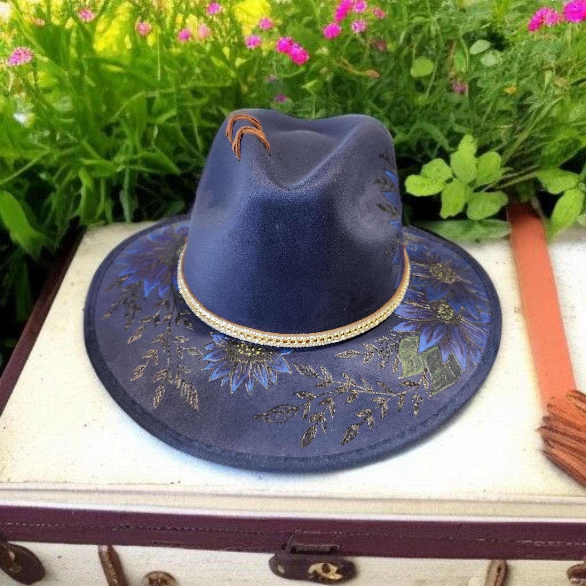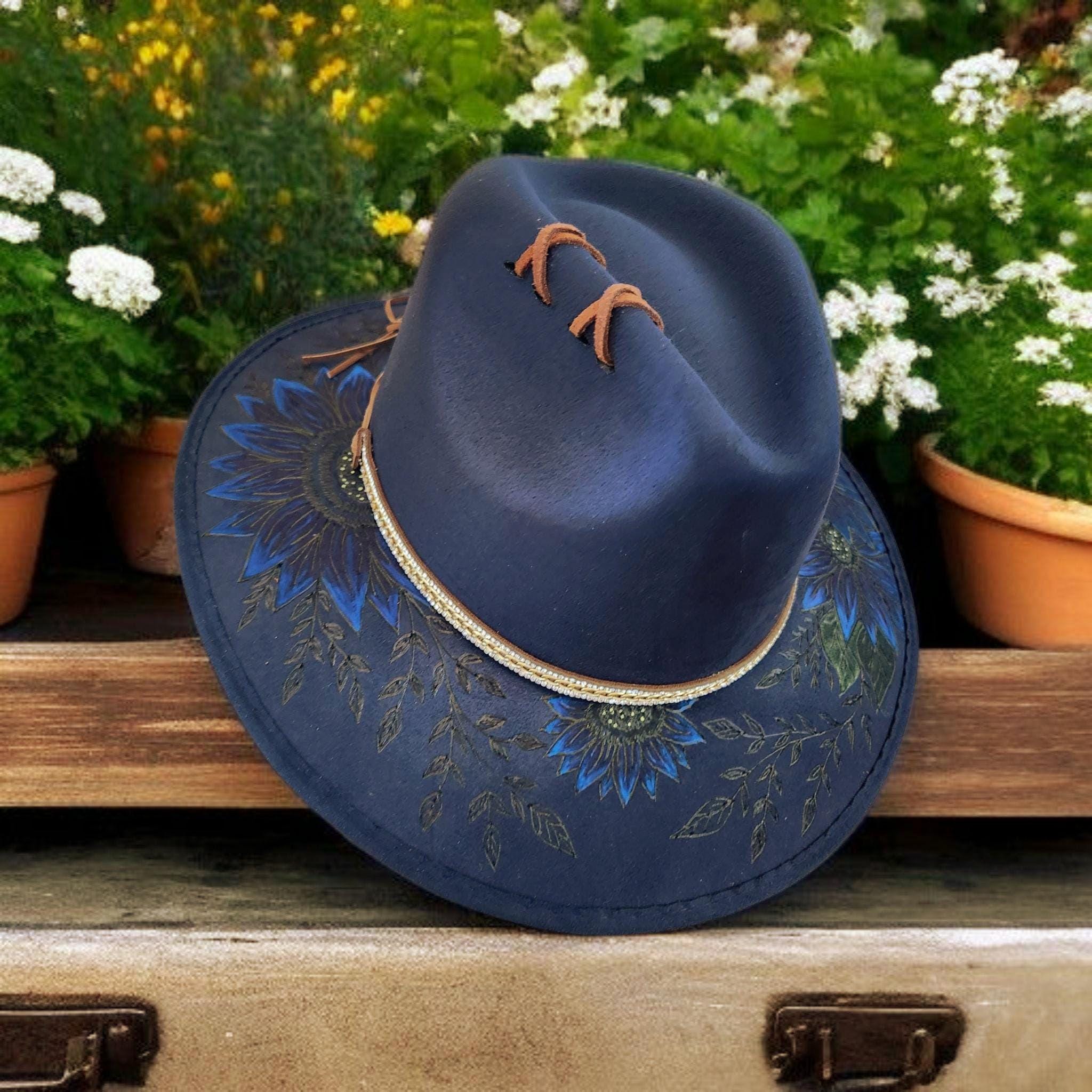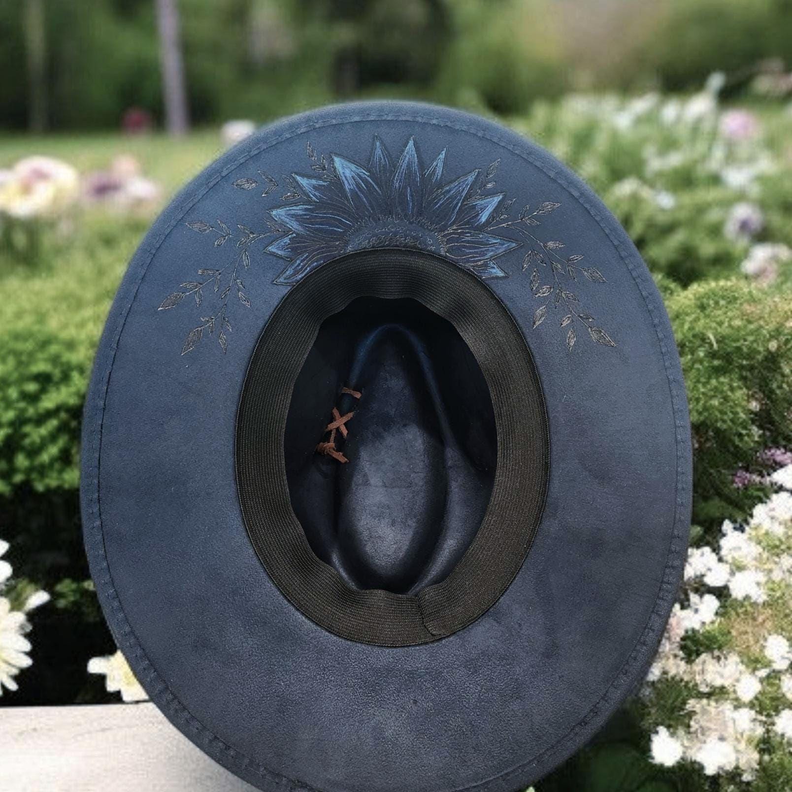 Very pretty blue colored cowboy - rancher hat. Engraved with pretty flowers and vines on top and underneath the brim.