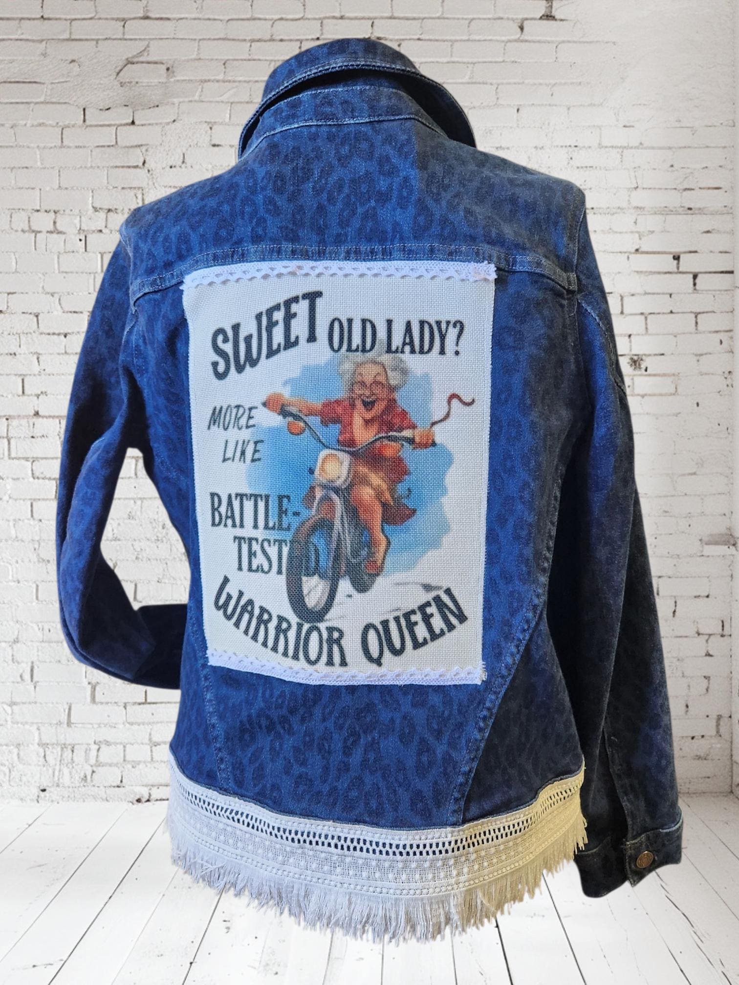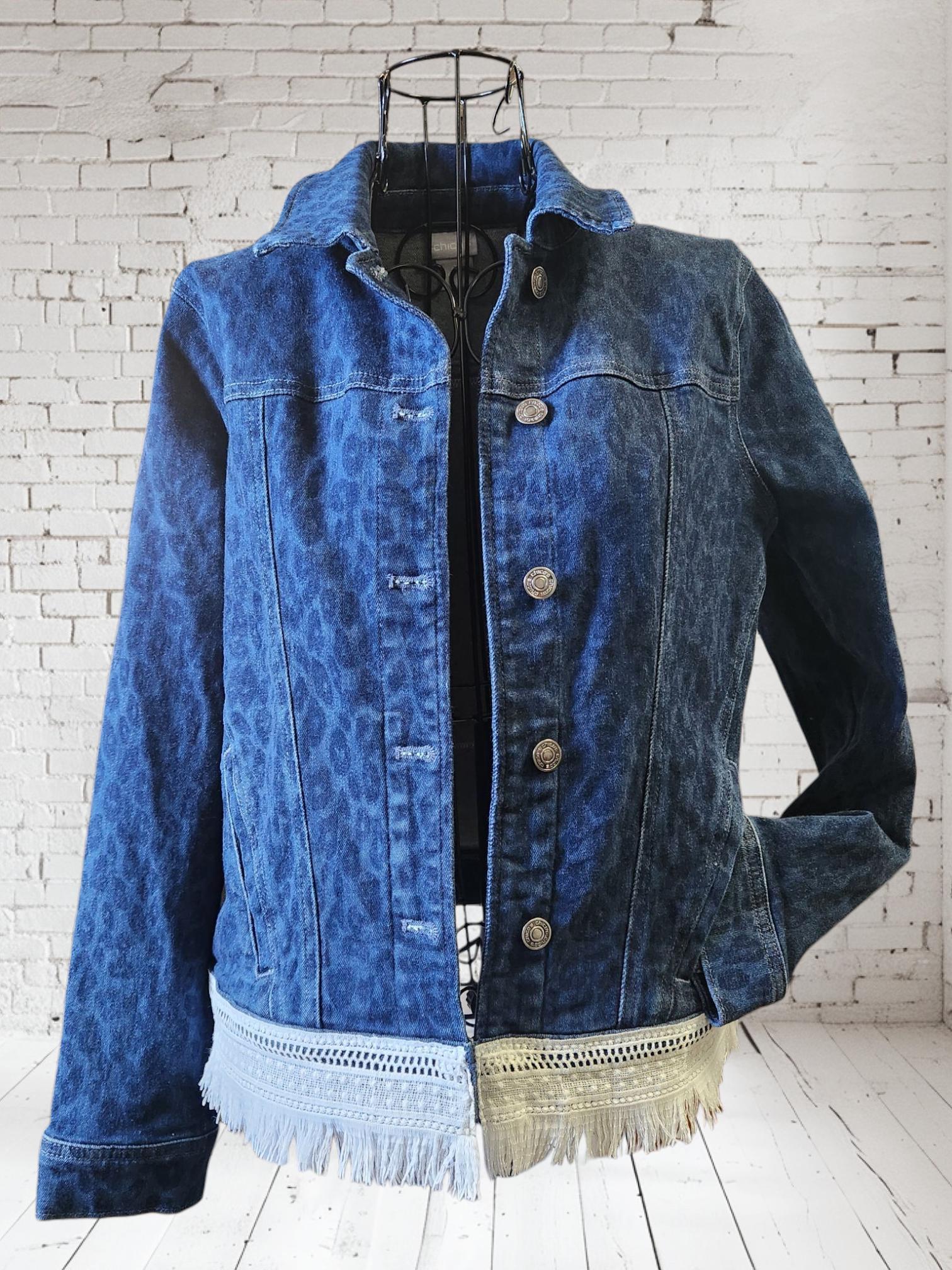 Upcycled blue denim - animal print - jacket using a really cool laces and fabrics.