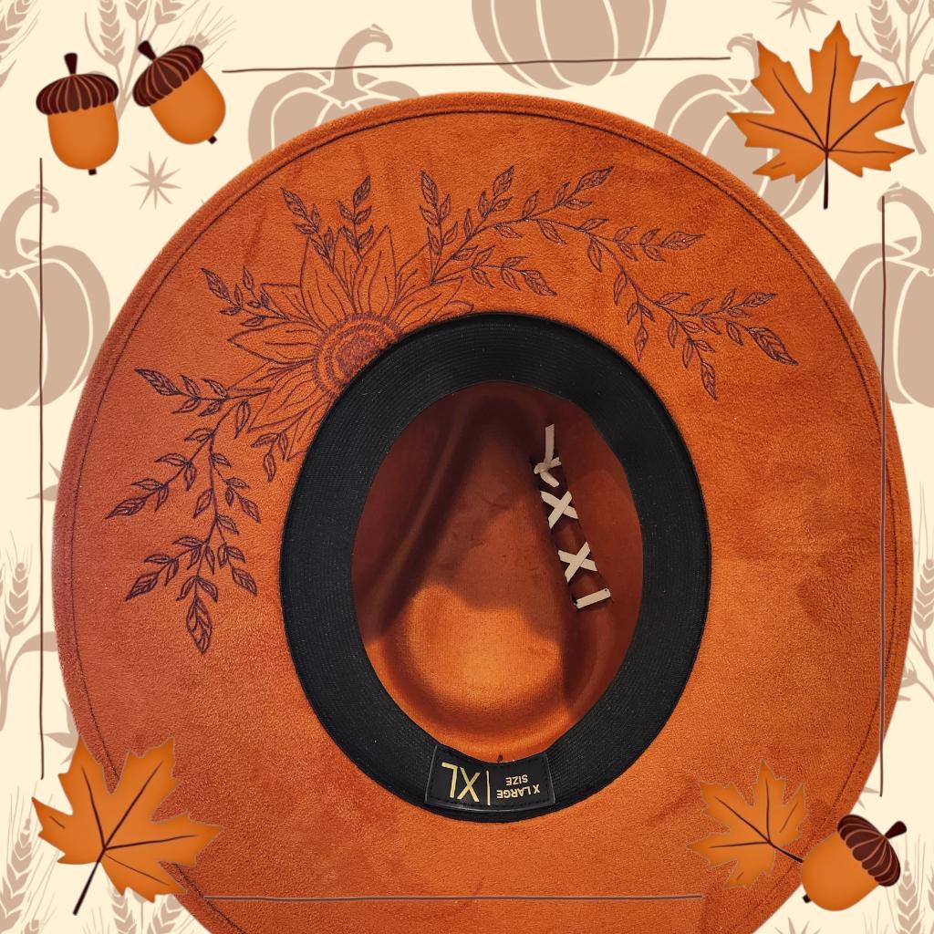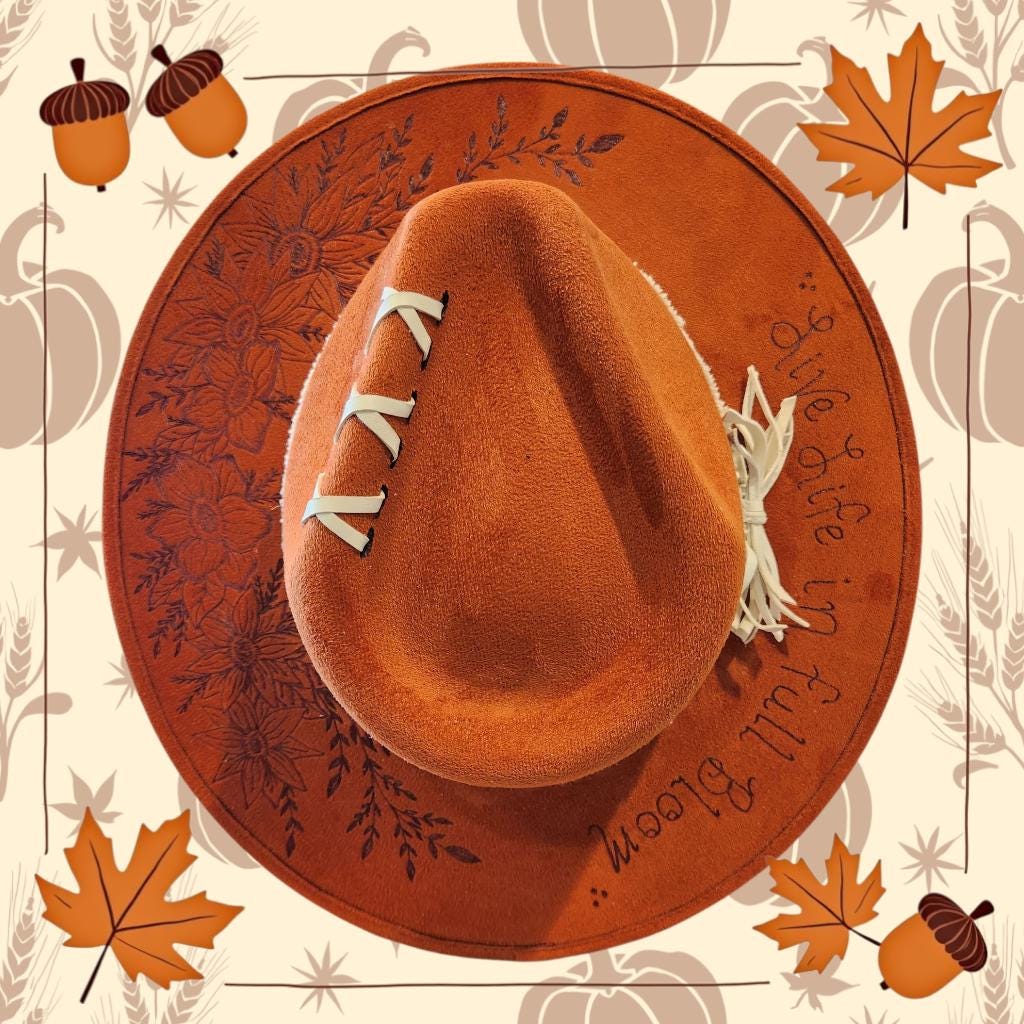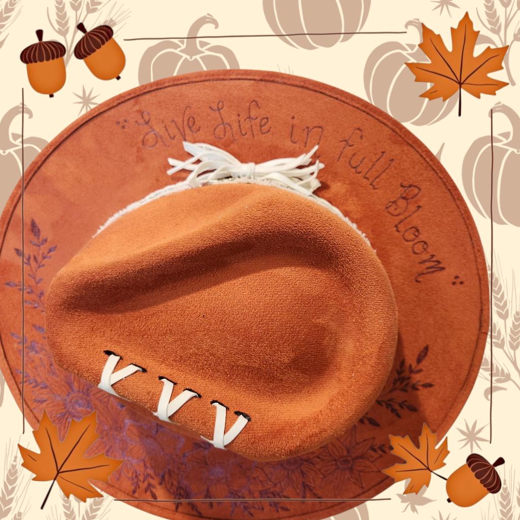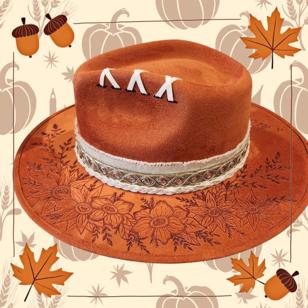 Really pretty rust colored "faux"suede Panama - Fedora - Western style hat. Hand burned to the brim with pretty flowers and vines on top and underneath the brim.