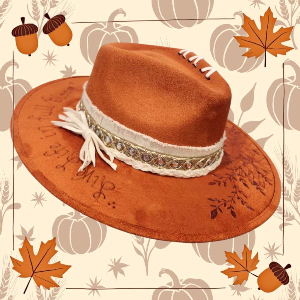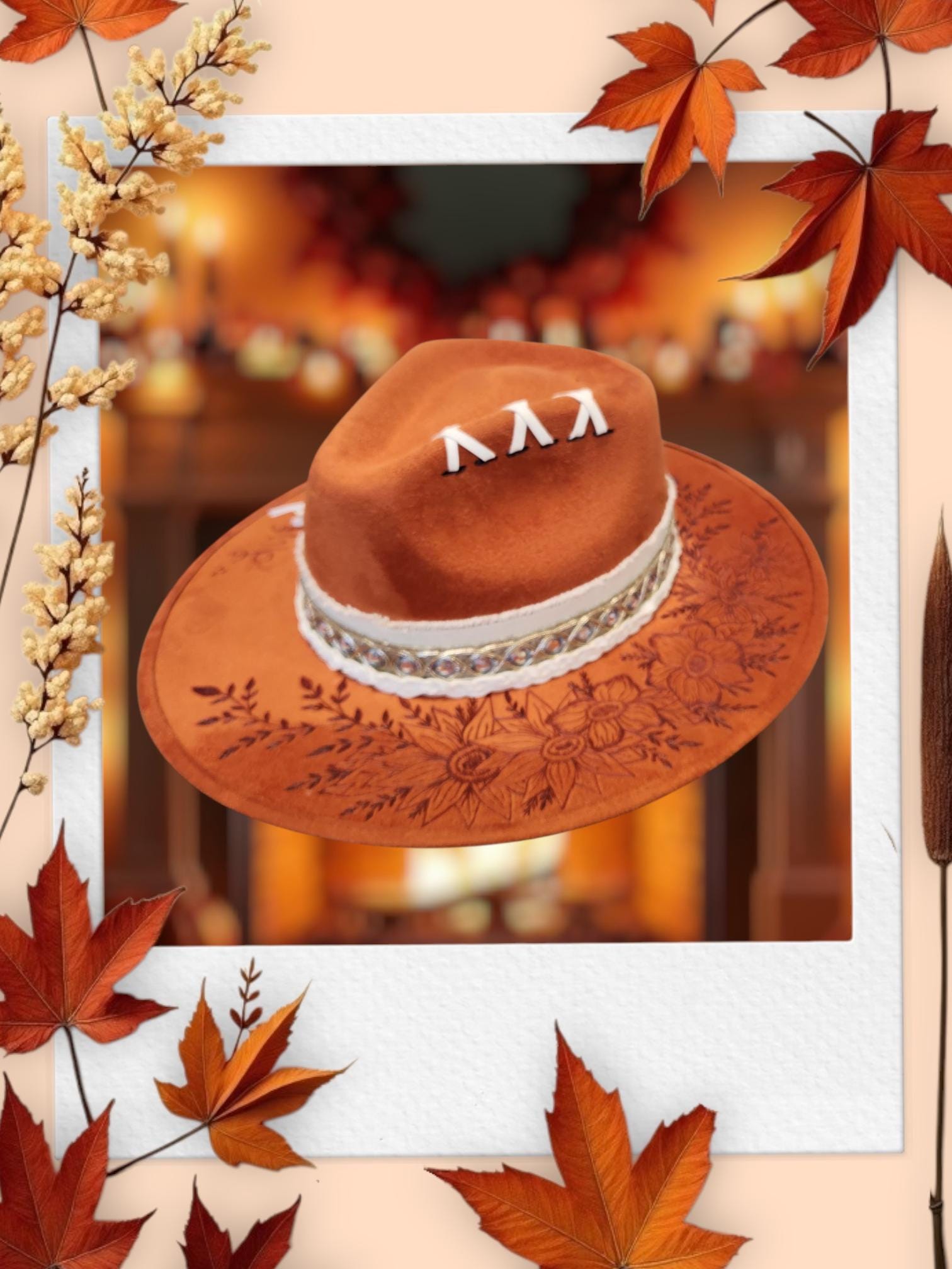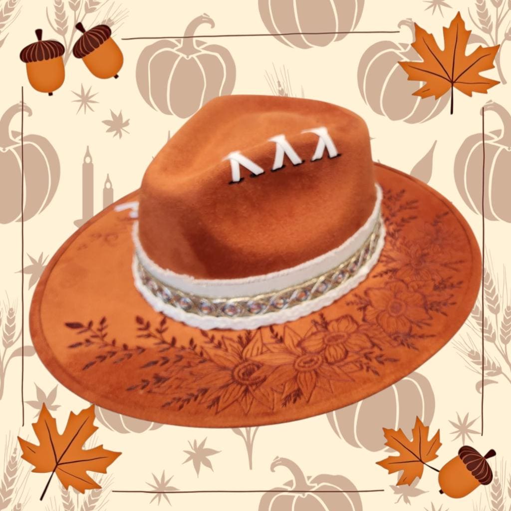 Really pretty rust colored "faux"suede Panama - Fedora - Western style hat. Hand burned to the brim with pretty flowers and vines on top and underneath the brim.