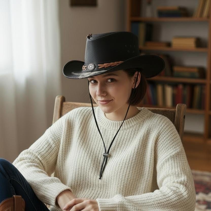 Very nice, high quality, black Genuine Leather cowboy - rancher hat.