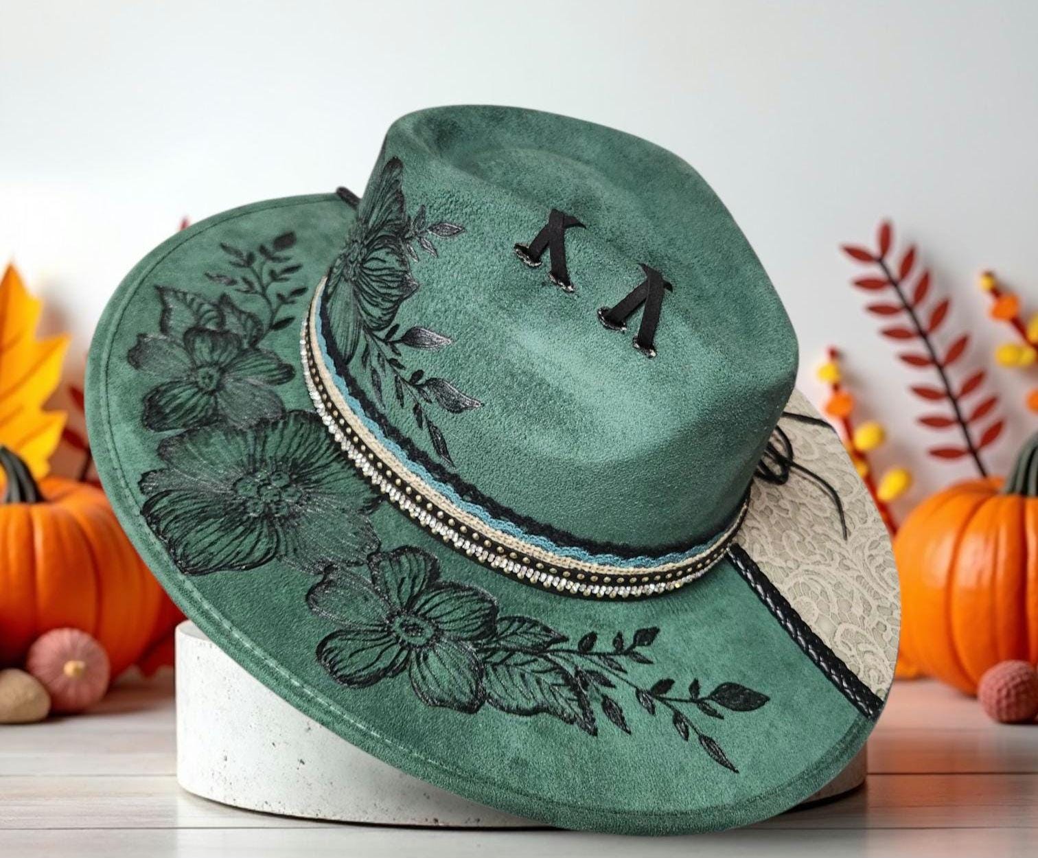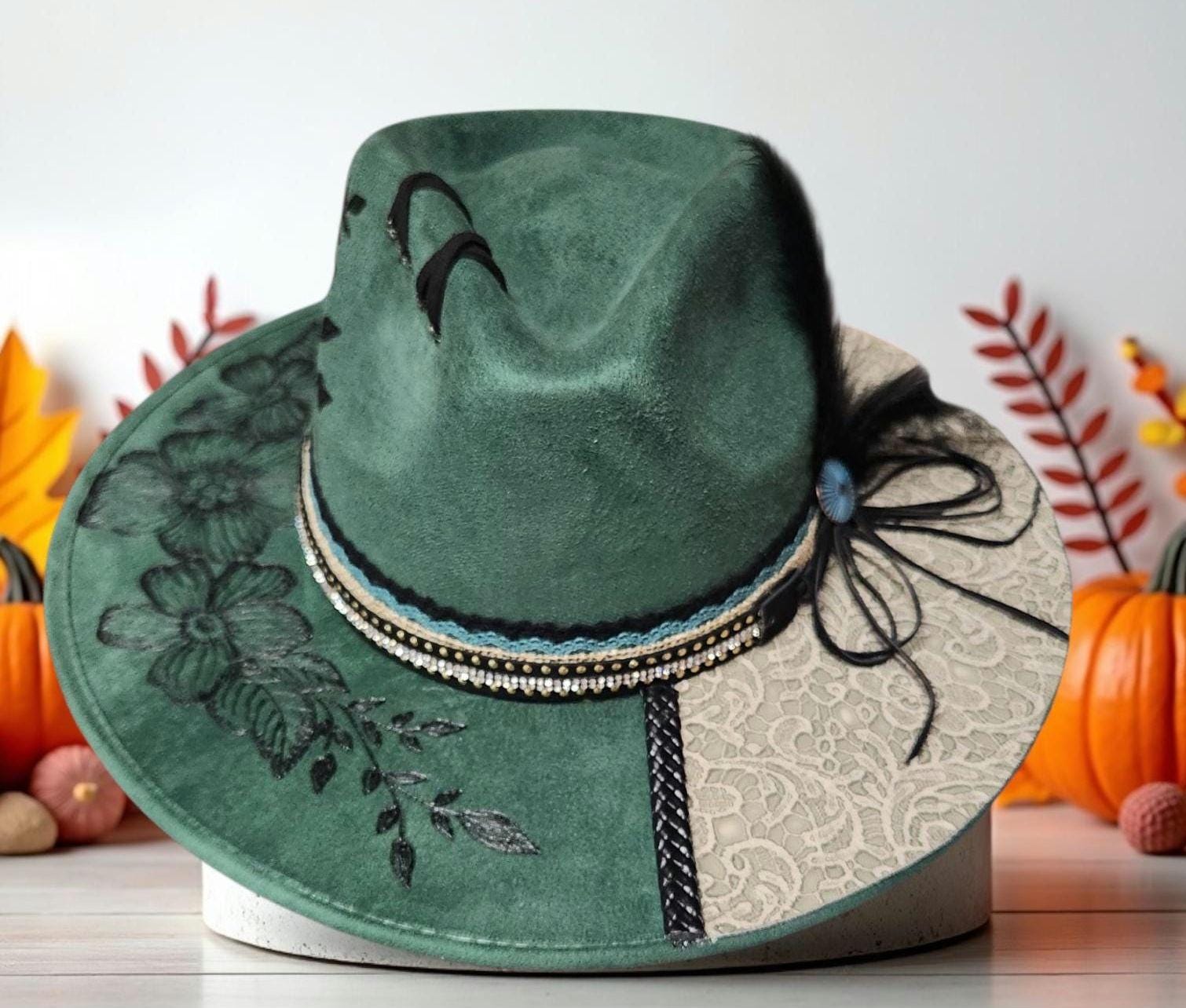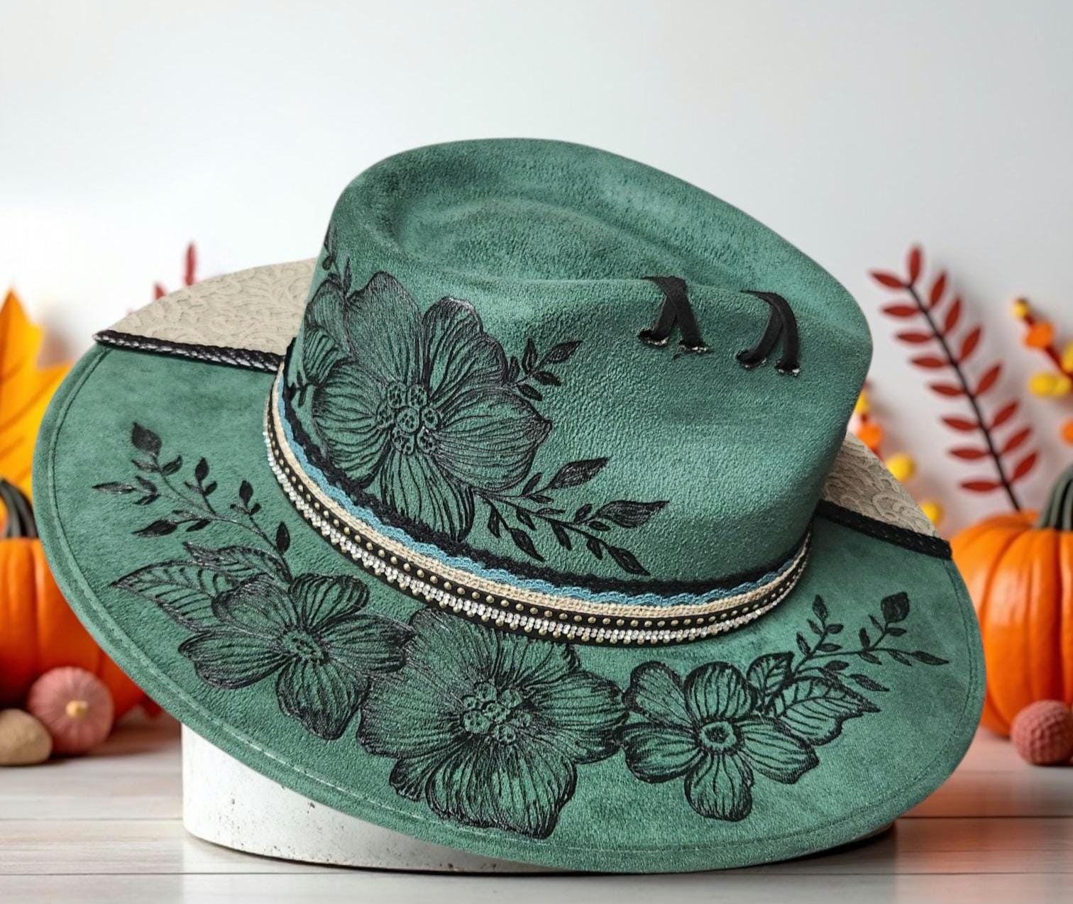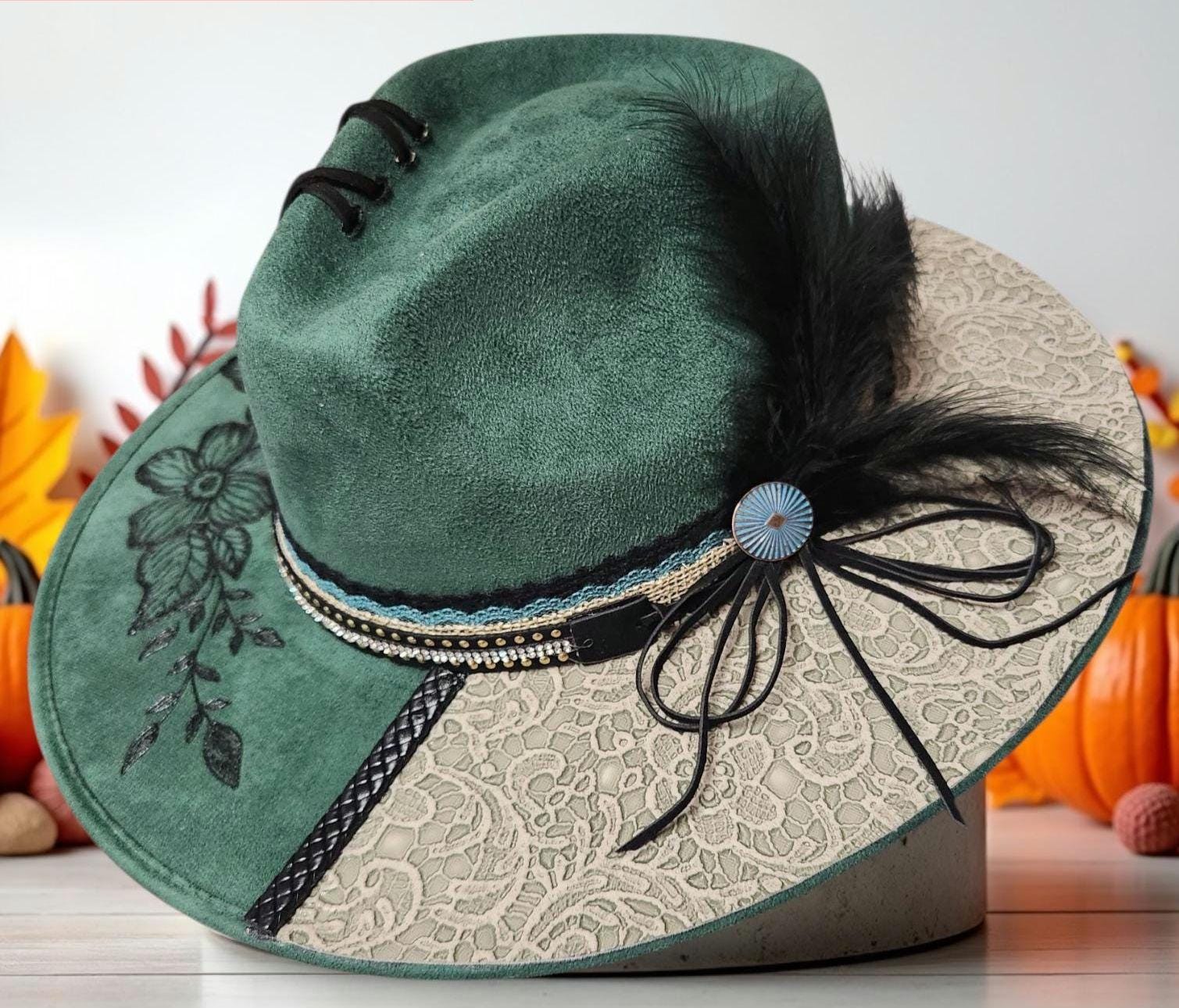 Hand Burned pretty green colored faux suede cowboy style hat. Two toned with beautiful leathers and embellishments.
