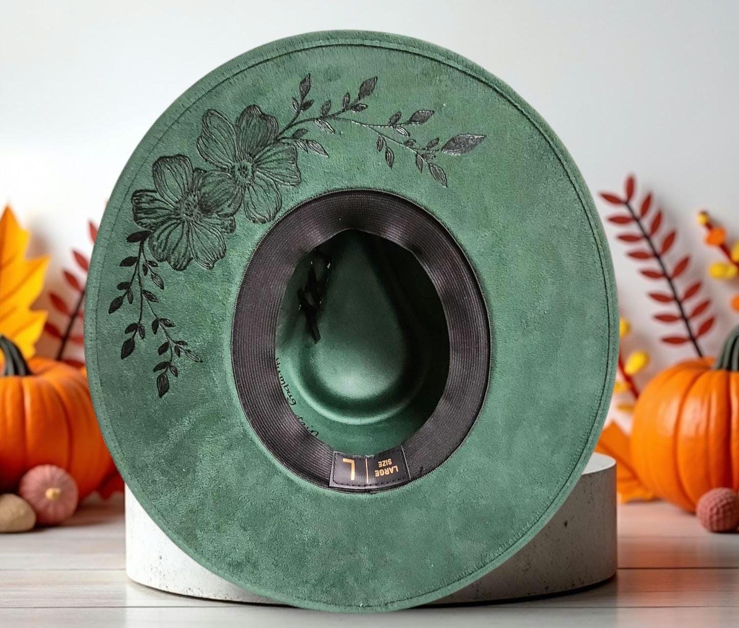 Has flowers and vines hand burned, not lasered, around brim and on crown.