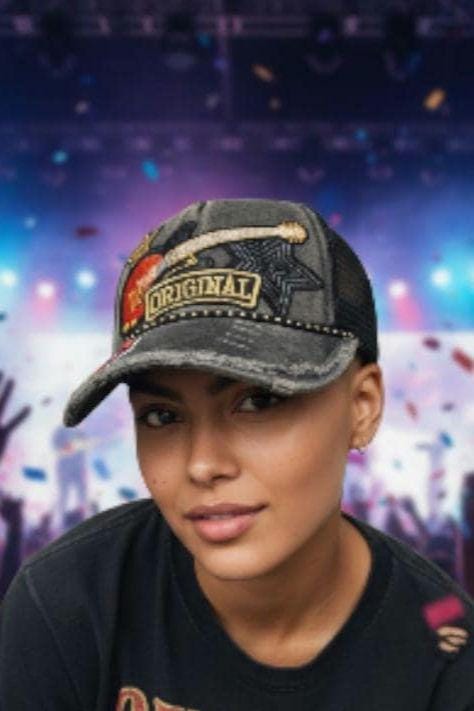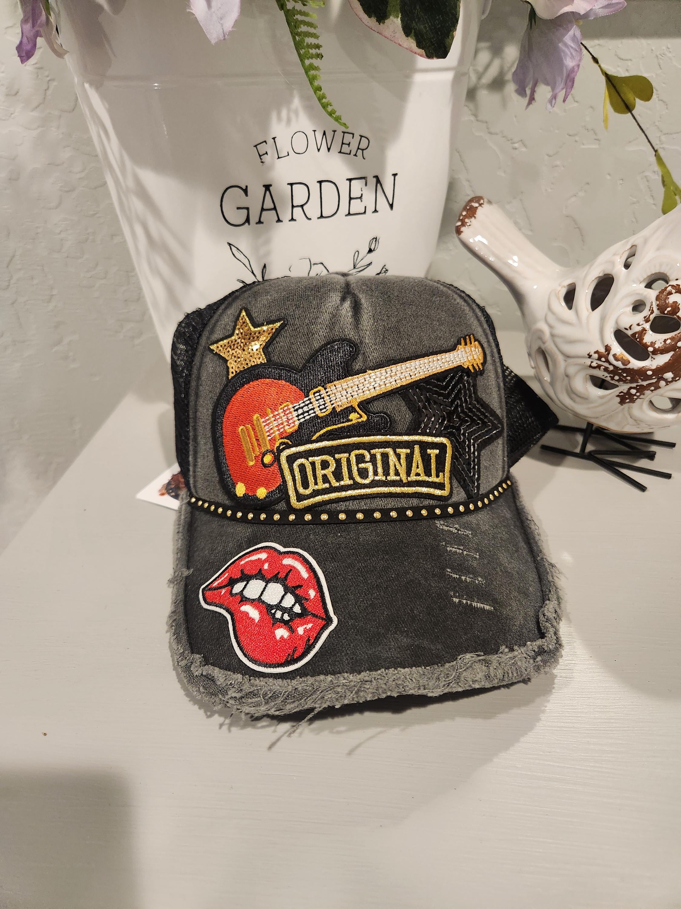 Really cute baseball cap with bling. Hand crafted with patches, paint and chains. Super cute hat