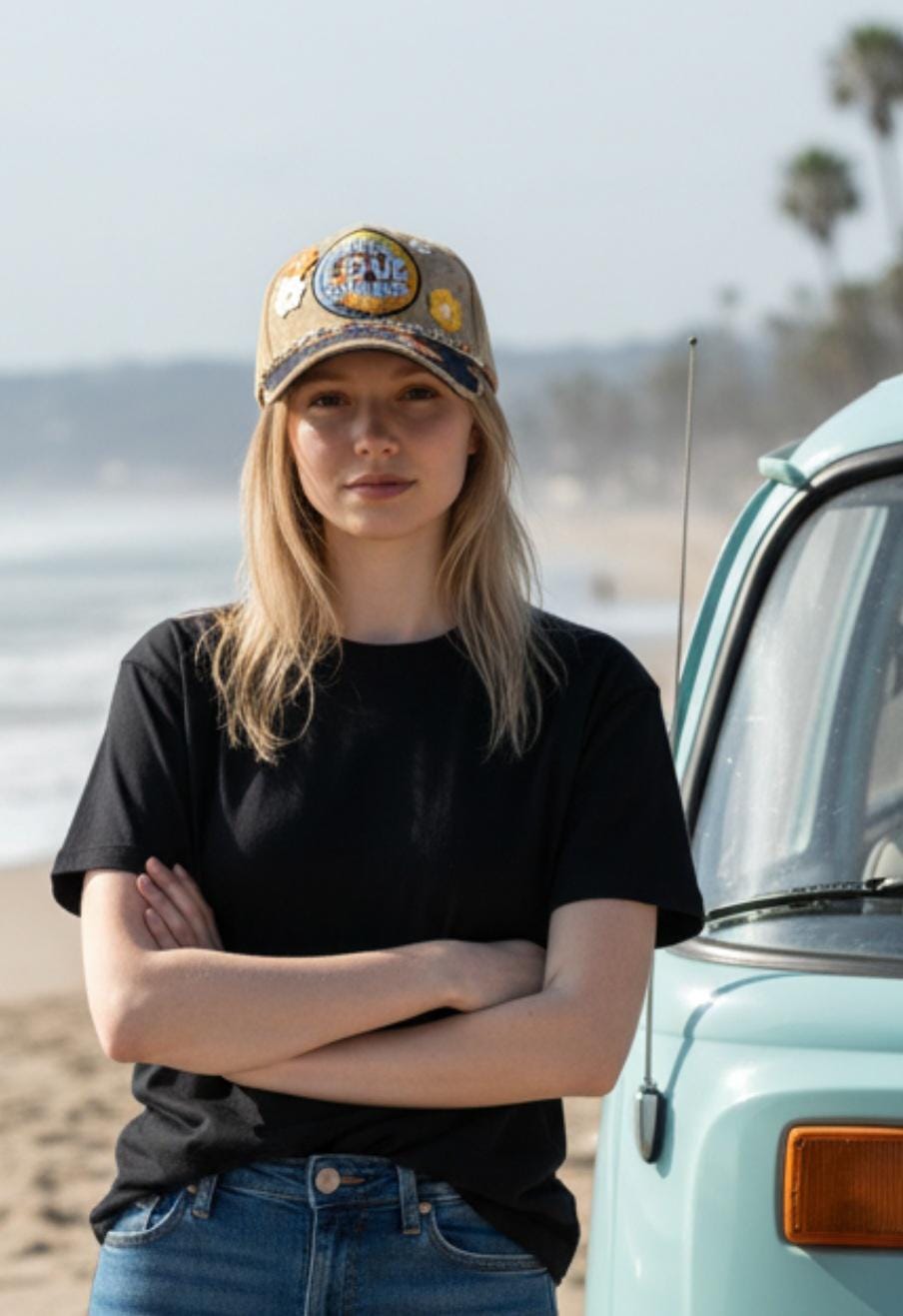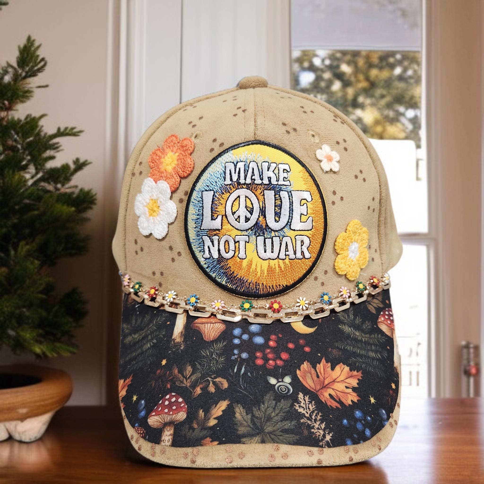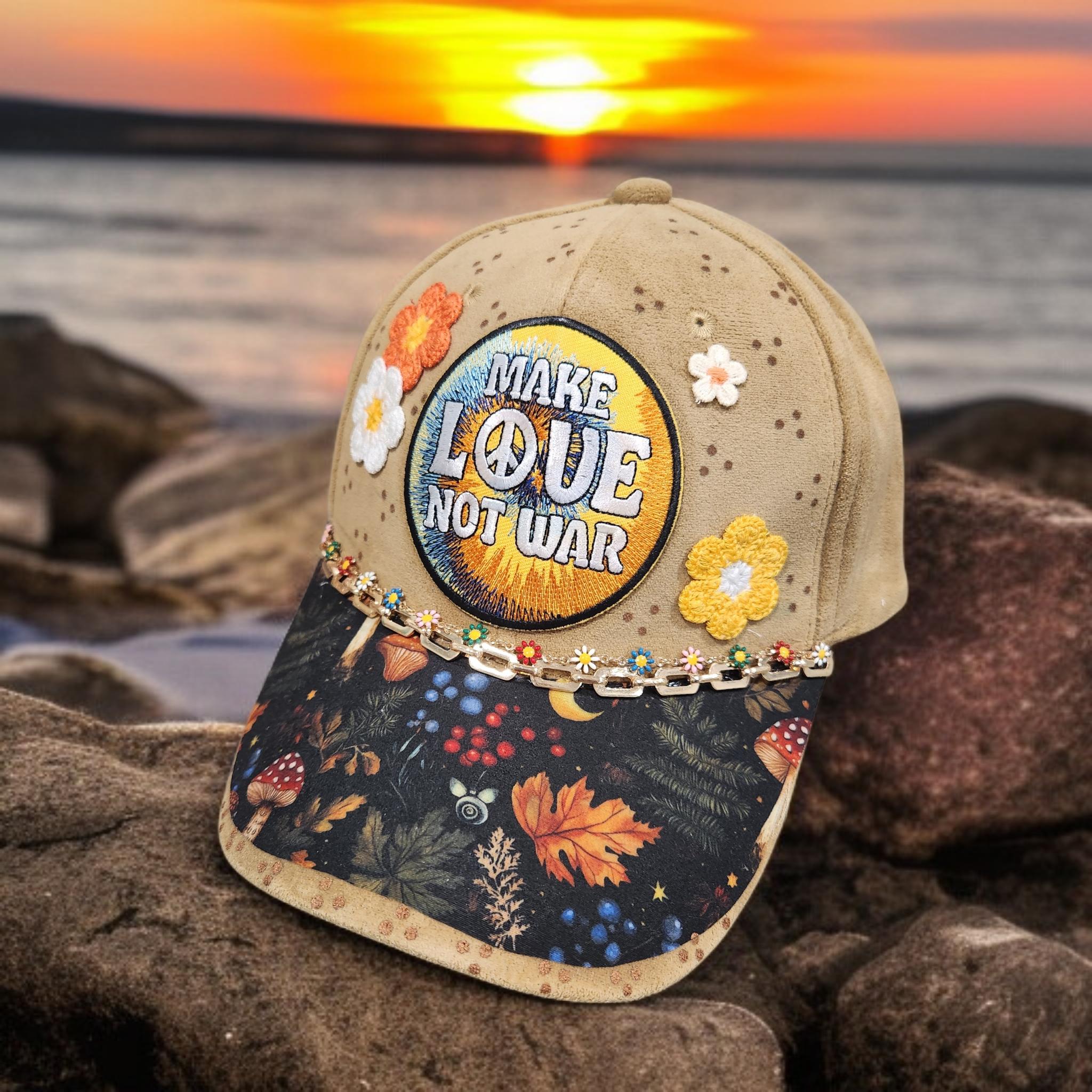 Really cute faux suede baseball cap with bling. Hand crafted with patches, paint and chains. Super cute hat for your outdoor hippie gal !