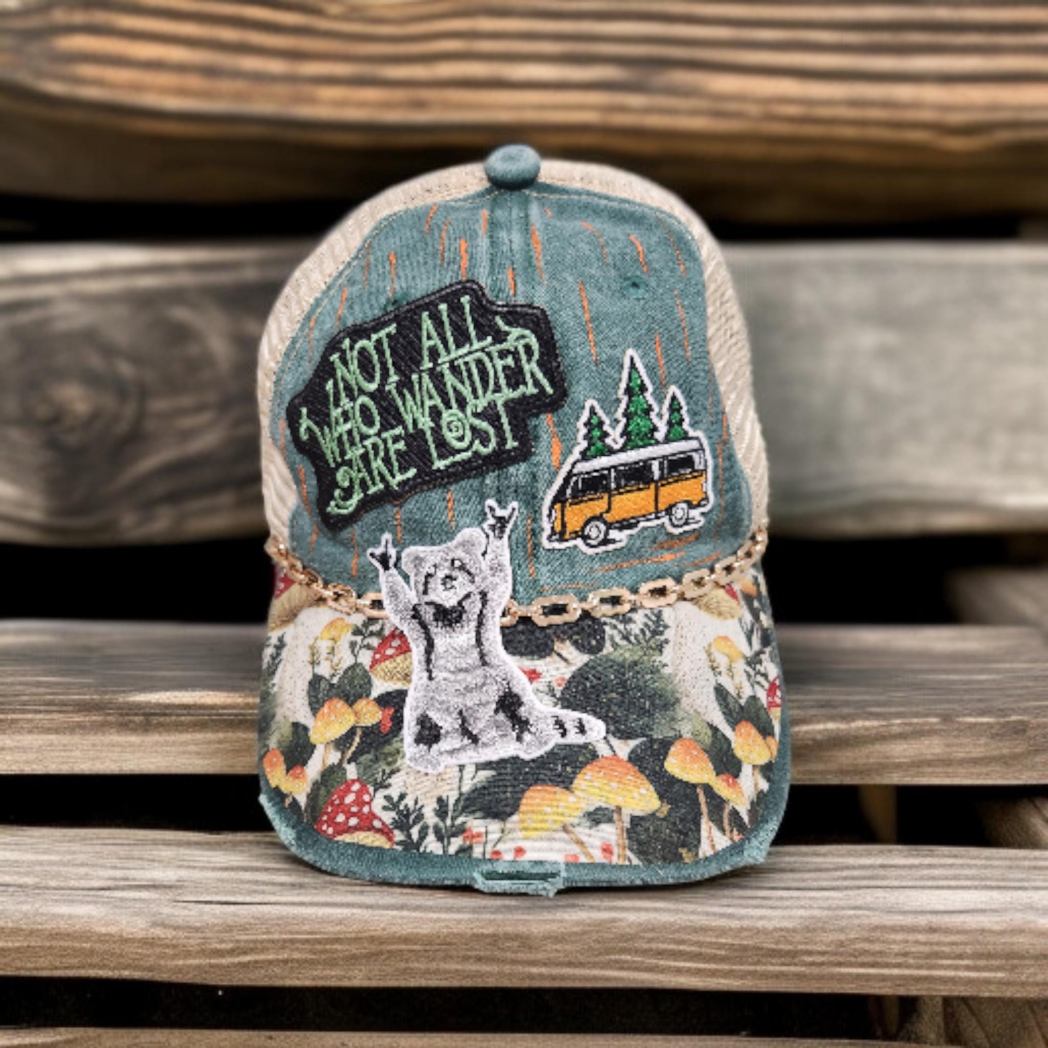 Really cute baseball cap with bling. Hand crafted with patches, paint and chains. Super cute distressed look, lightweight hat for your outdoor gal !