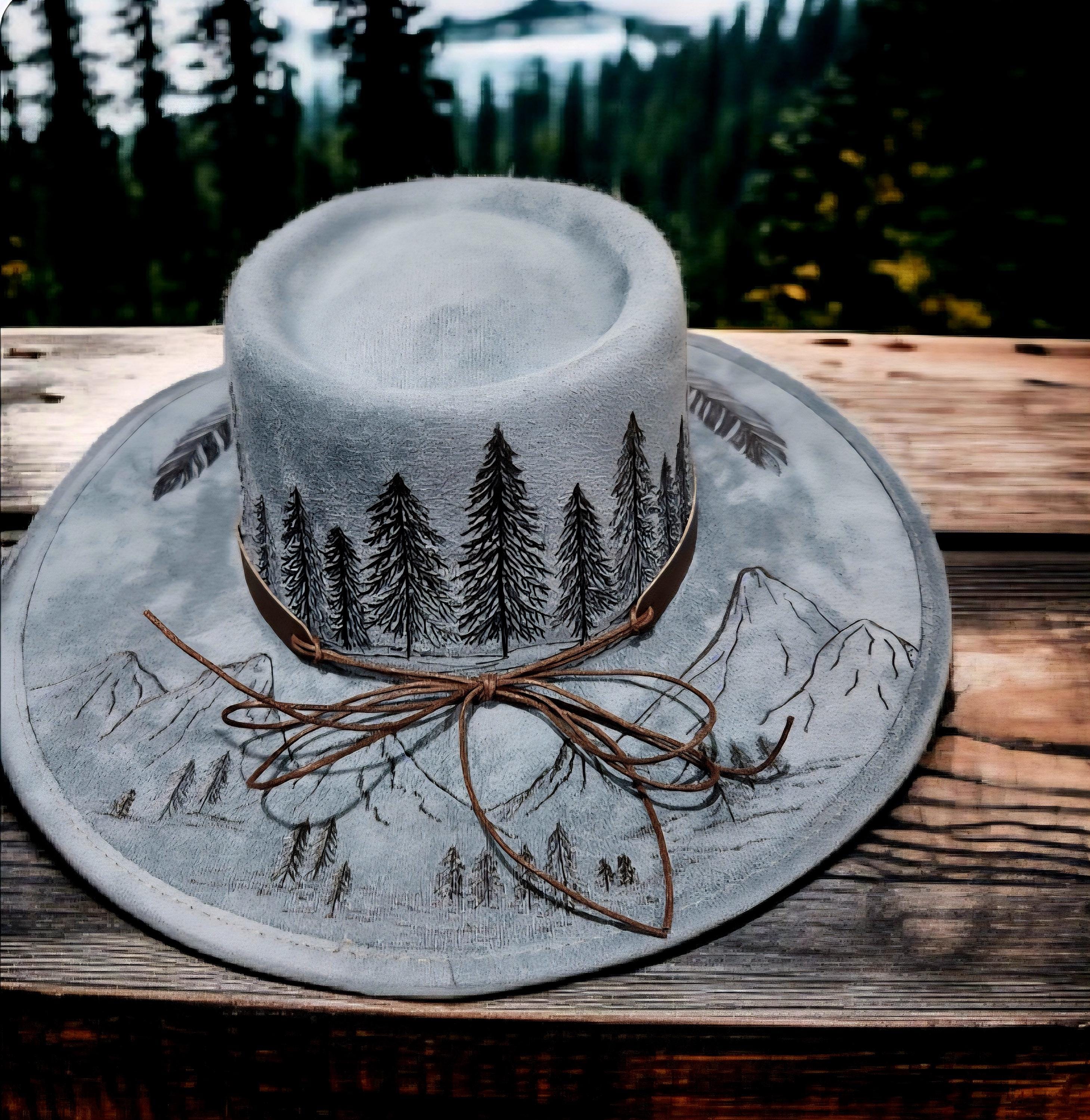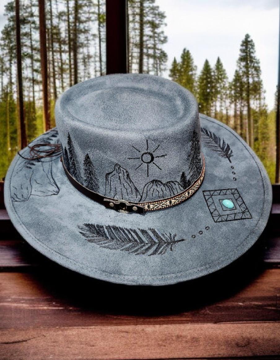 Pretty teal blue colored cowboy - rancher hat. Engraved with pretty trees, mountains and feathers with turquoise stone embellishments.