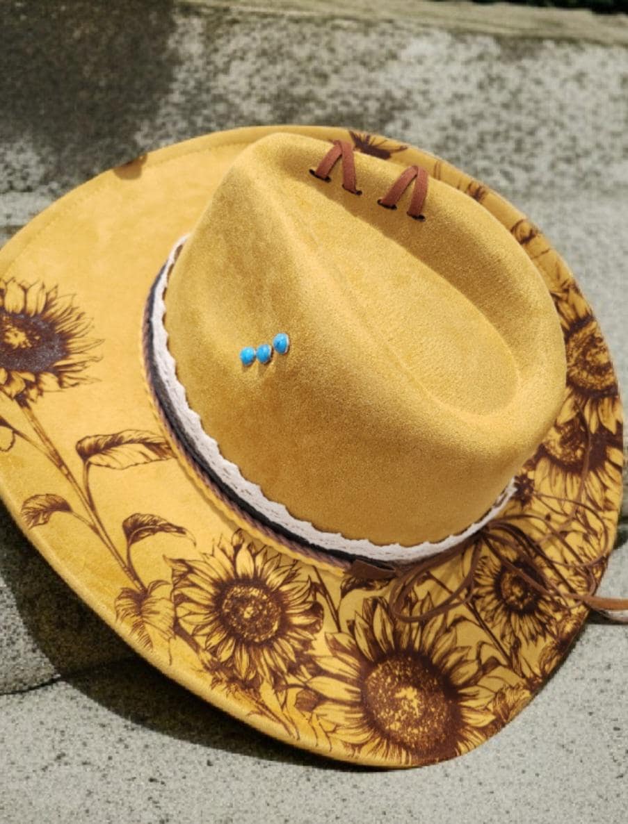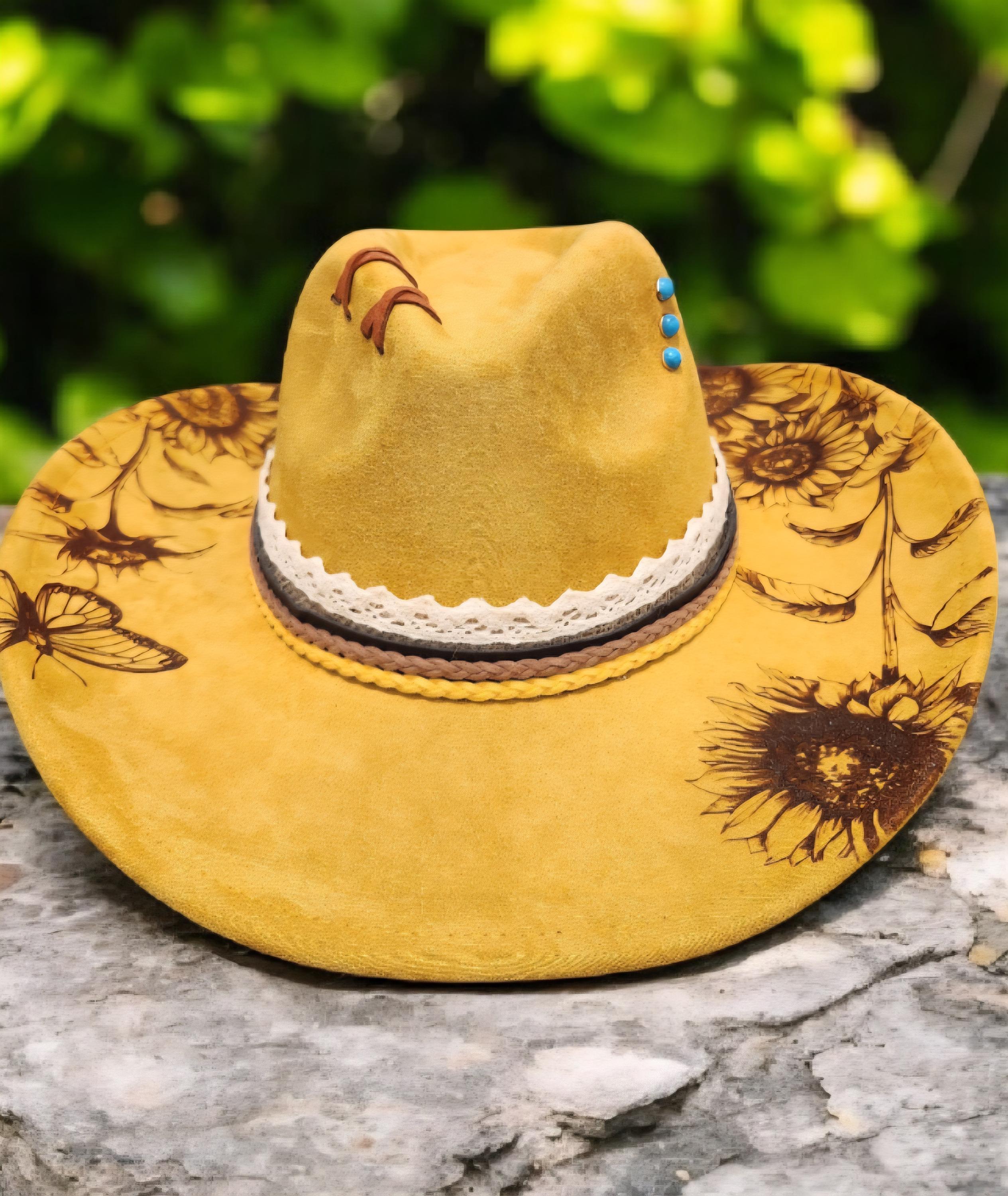 Pretty flowers, butterflies and feathers throughout brim and underneath. Also has turquoise embellishments on crown and underneath.