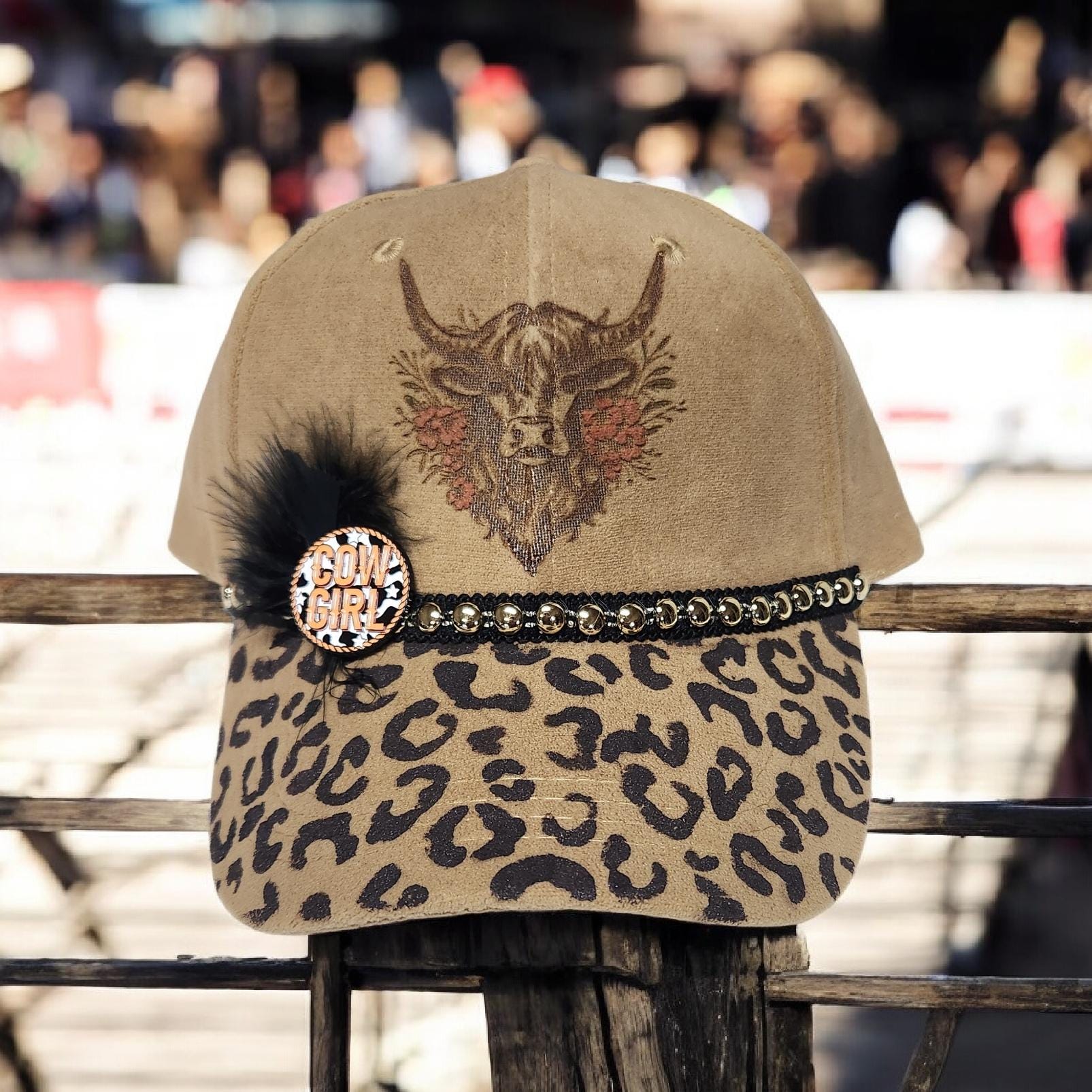 Really cute faux suede baseball cap. Highland cow engraved on front and animal print painted on brim. Super cute hat for your rodeo cowgirl.