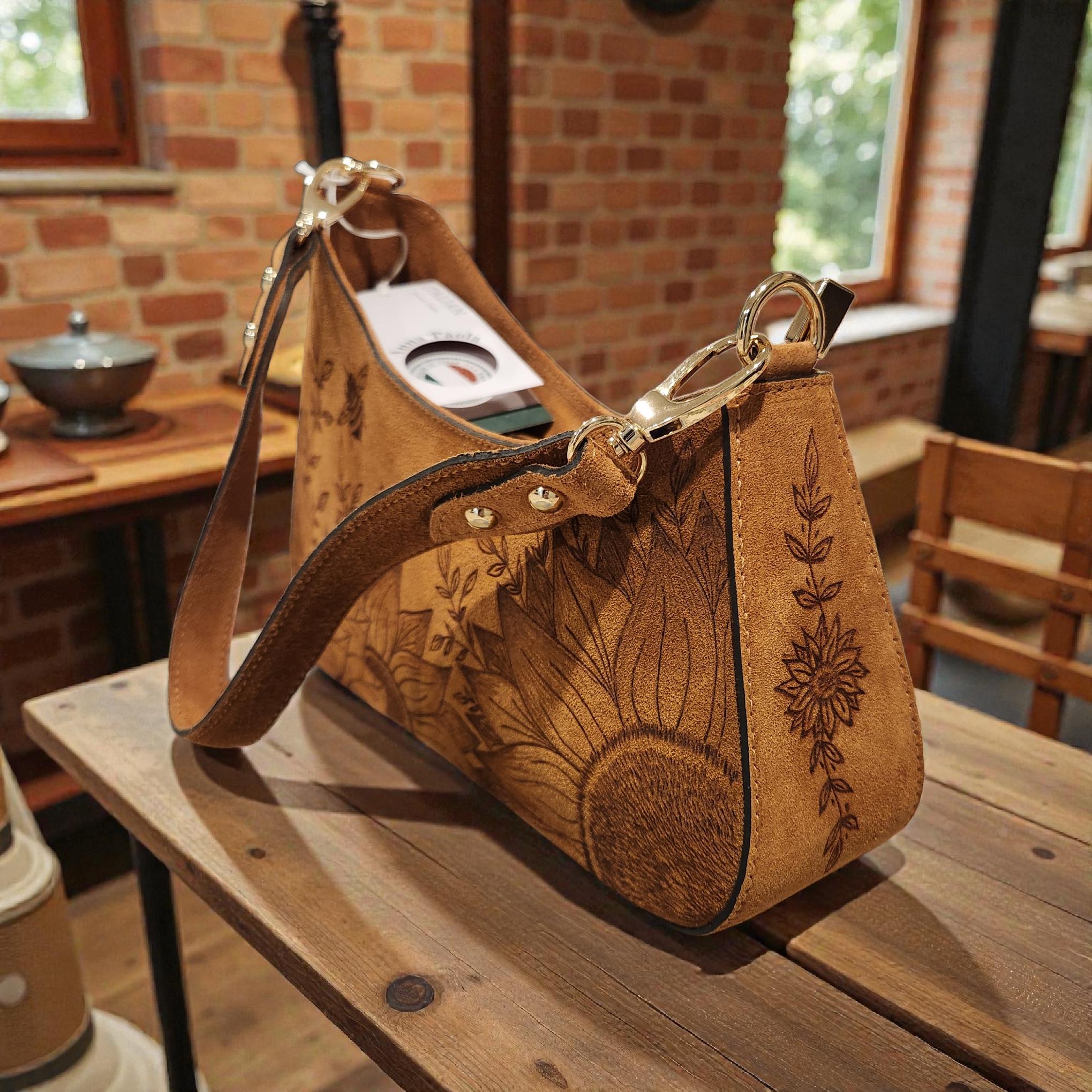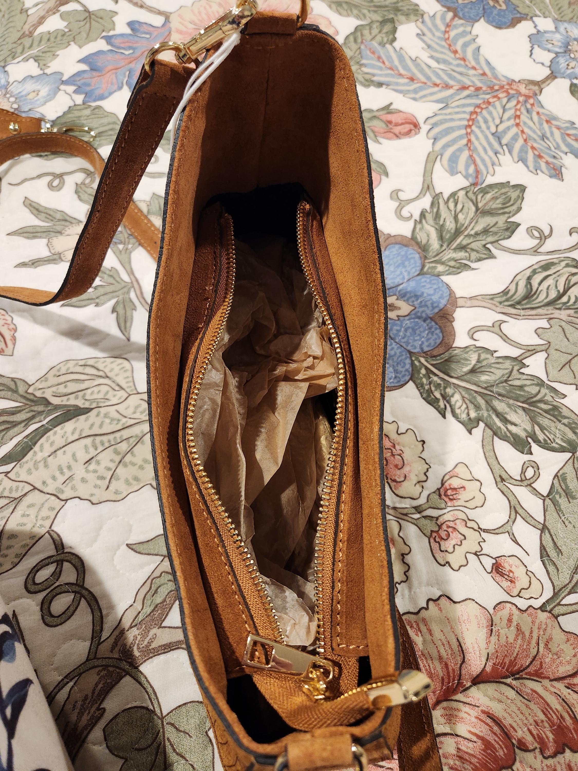 Beautiful hand burned Camel brown colored handbag. Fully lined with nice fabric. Has a zippered inner pocket.