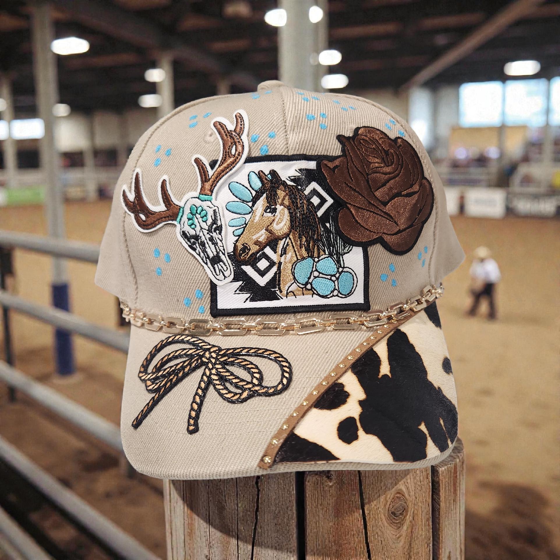 Really cute faux suede - trucker style baseball cap. Hand crafted with patches, paint and genuine cowhide.