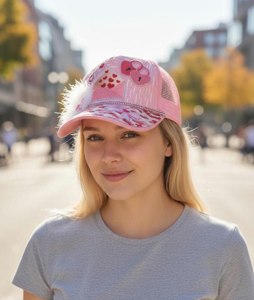 Really cute pink colored - valentines day heart - handcrafted with pretty patches and paint - embellished with bling - adjustable baseball cap