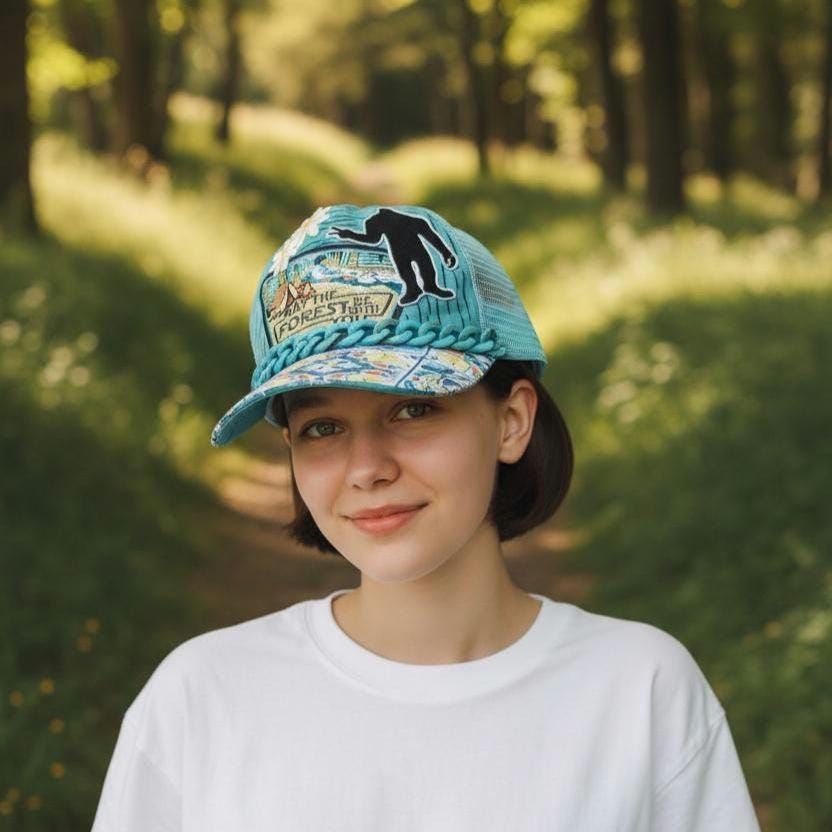 Really cute baseball cap with bling. Hand crafted with patches, paint and chains. Super cute distressed look and lightweight hat for your bigfoot loving outdoor gal !