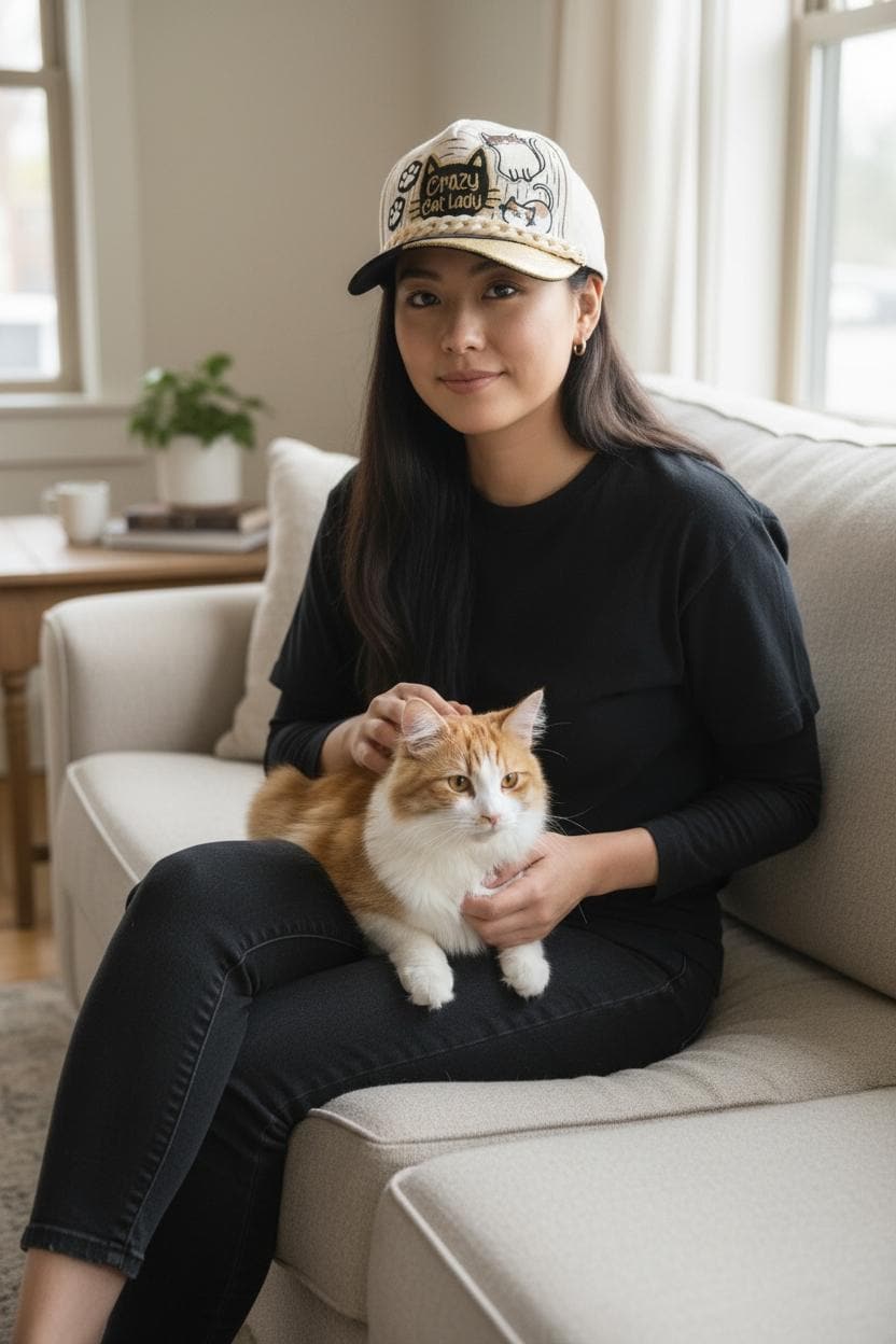 Really cute faux suede - trucker style baseball cap. Hand crafted with patches and paint. Super cute hat for your favoritecat lover .