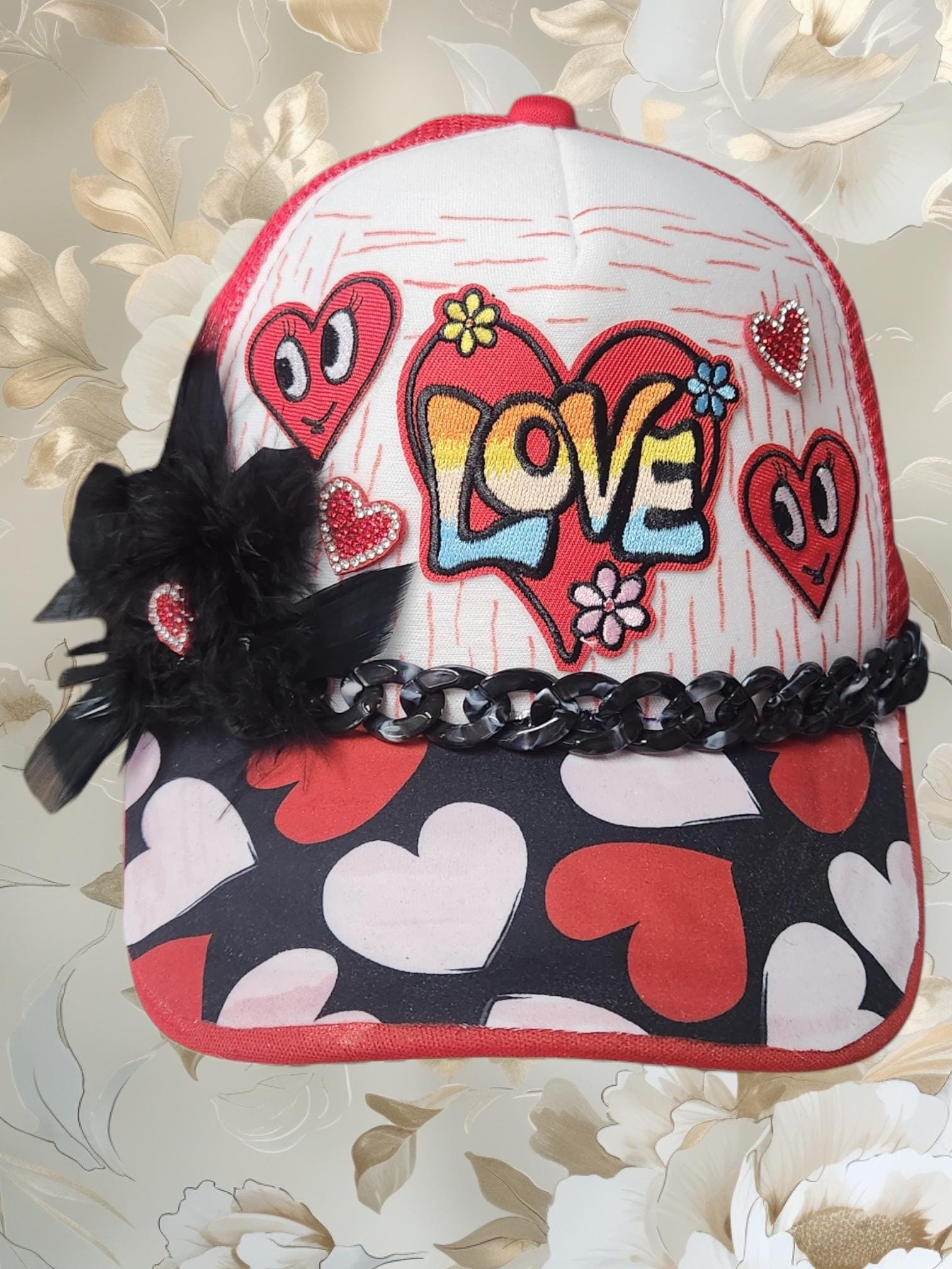 Really cute baseball cap with bling. Hand crafted with patches, paint and chains. Super cute distressed look and lightweight hat for your favorite valentine!