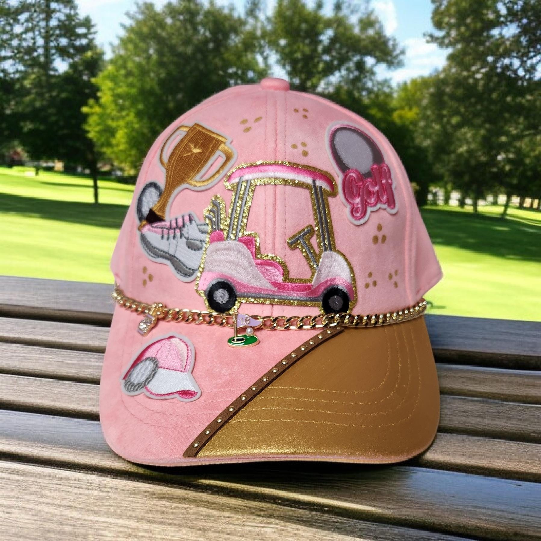 Really trucker style baseball cap. Hand crafted with patches, paint and bling. Super cute hat for your lady golfer.