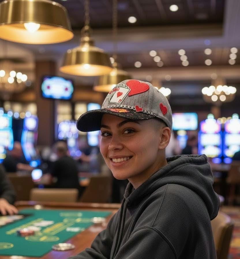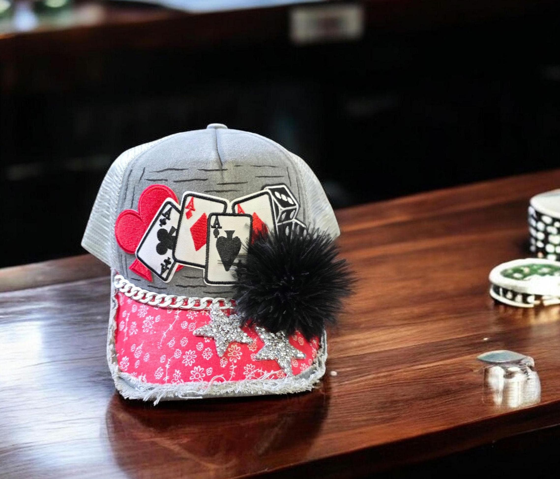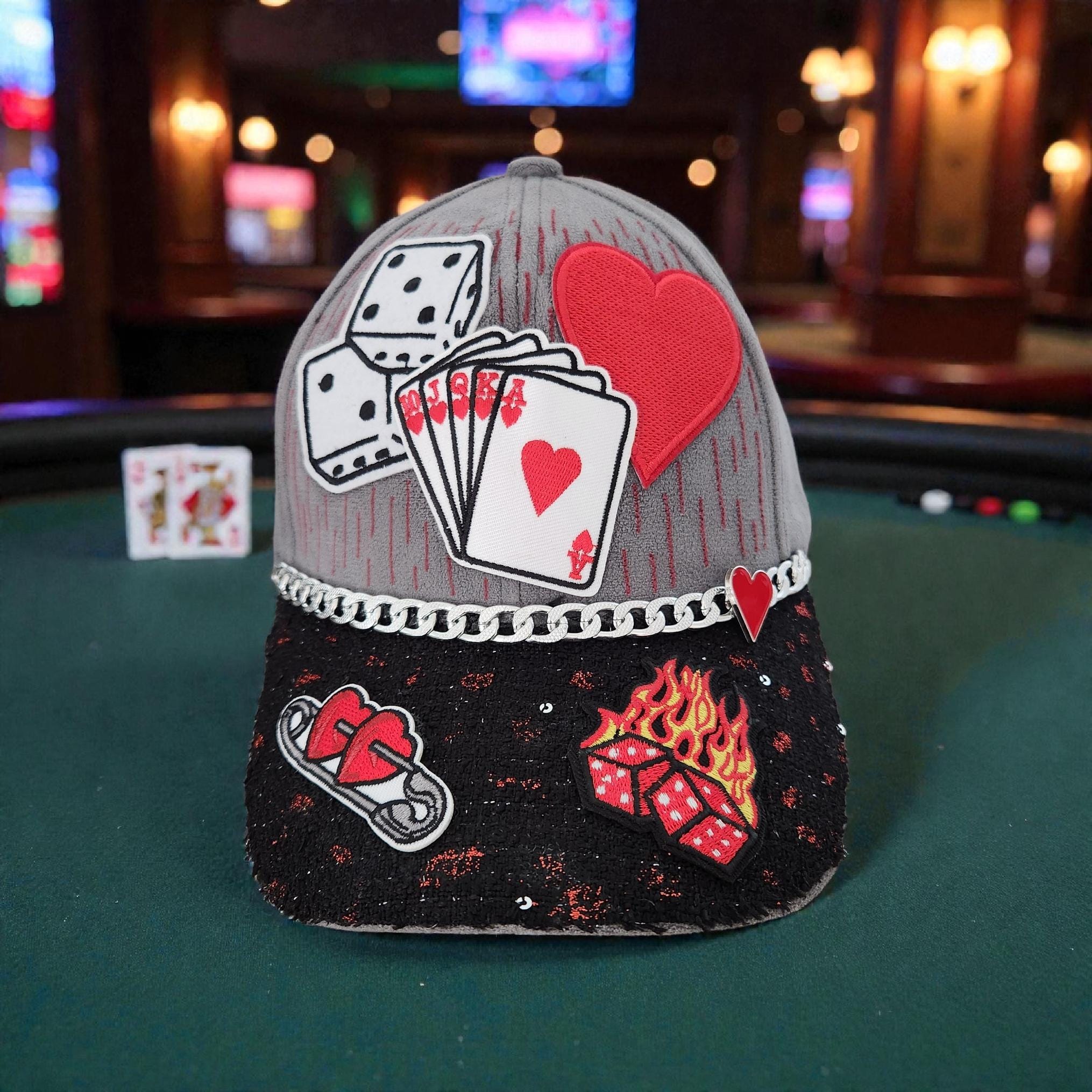 Really cute baseball cap with bling. Hand crafted with patches, chains and bling. Super cute slightly distressed look cap for your favorite card player.