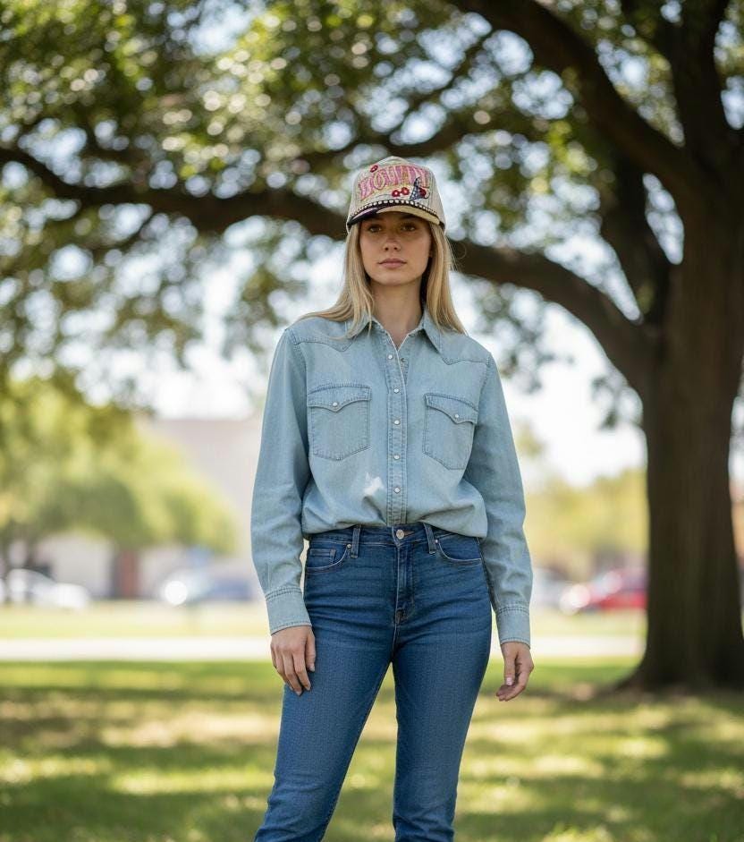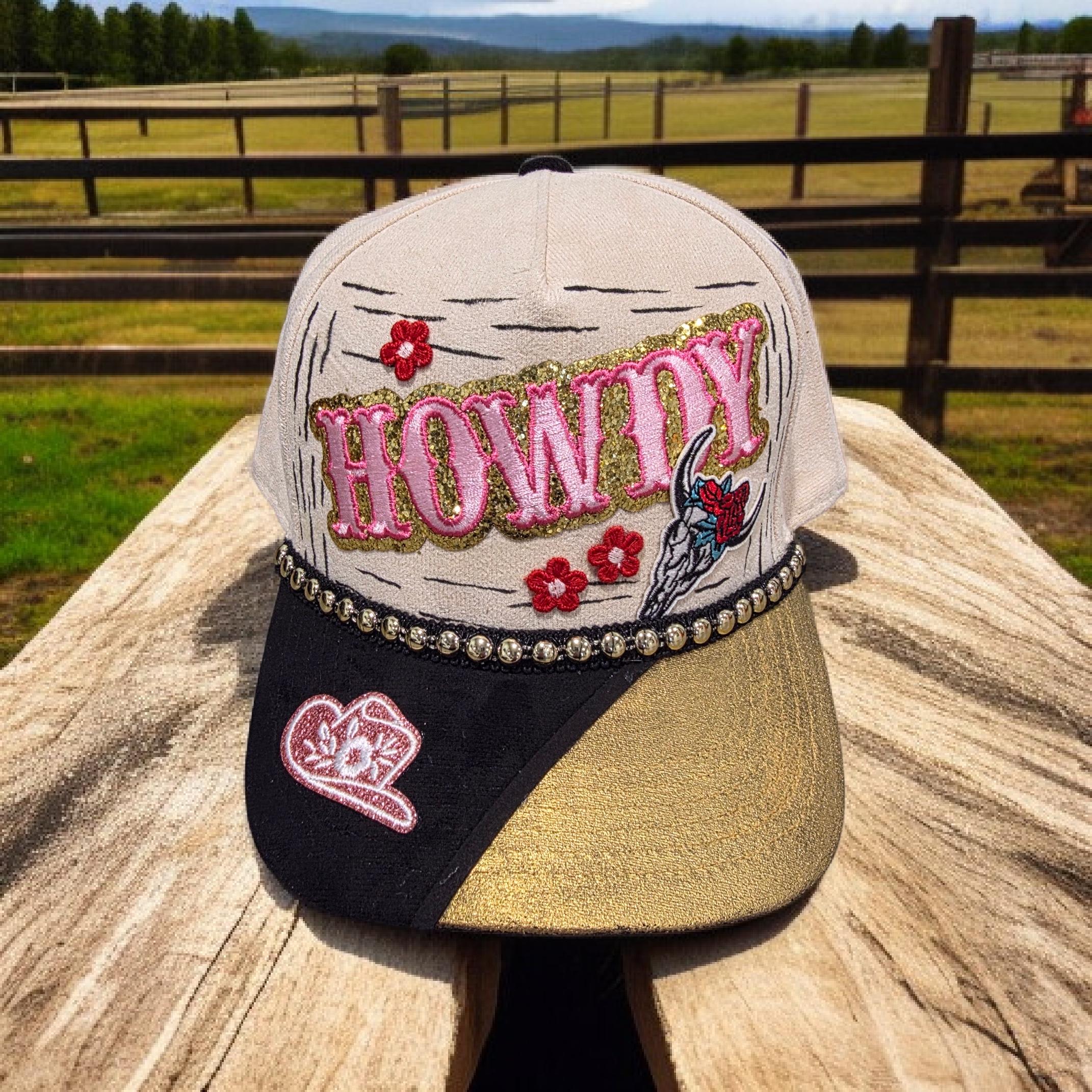 Really cute faux suede - trucker style baseball cap. Hand crafted with patches and paint. Super cute hat for your outdoor cowgirl.
