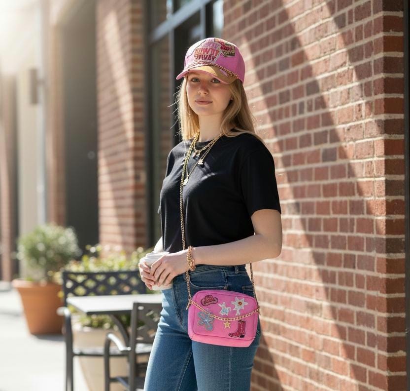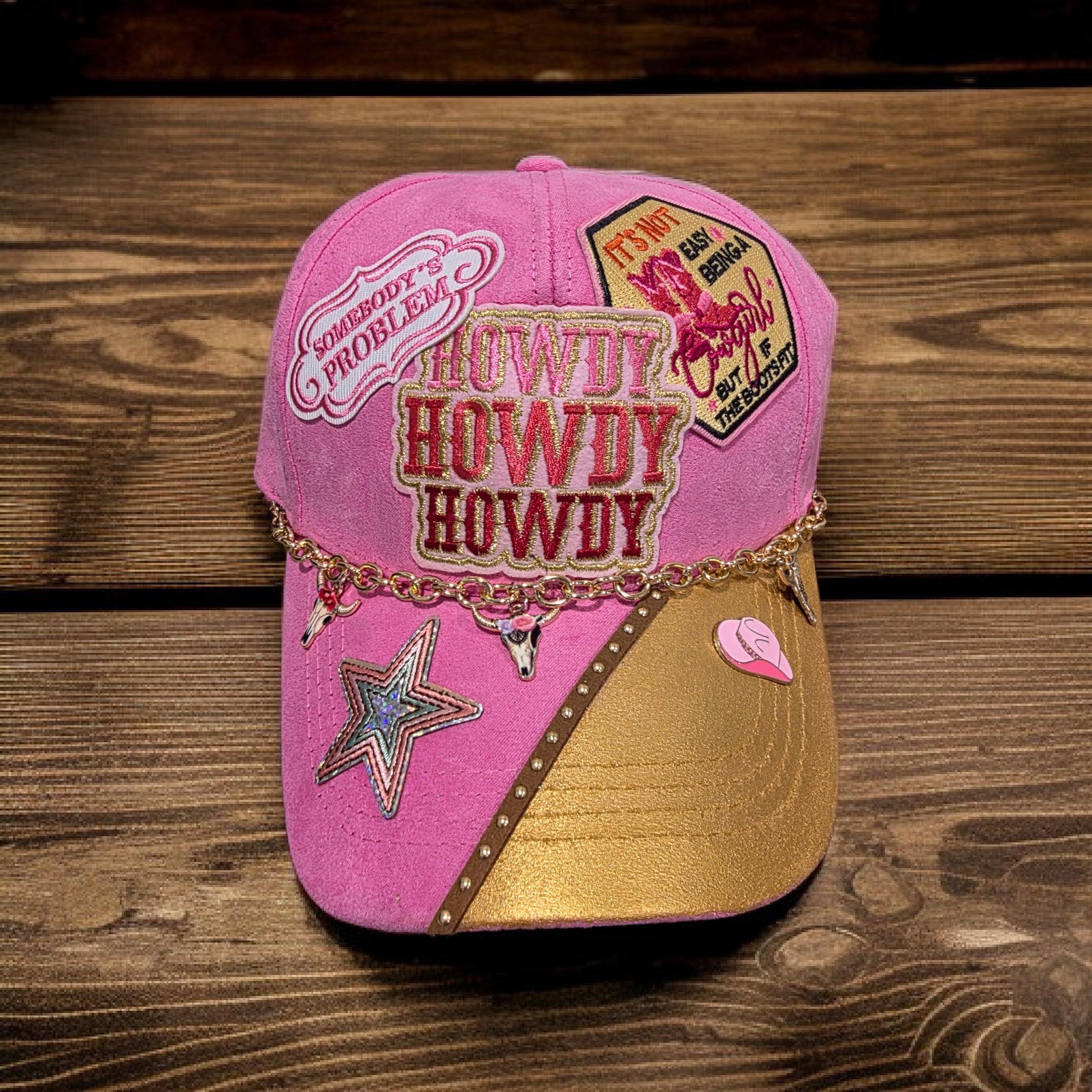 Really cute faux suede - trucker style baseball cap. Hand crafted with patches, paint and bling. Super cute hat for your outdoor cowgirl.