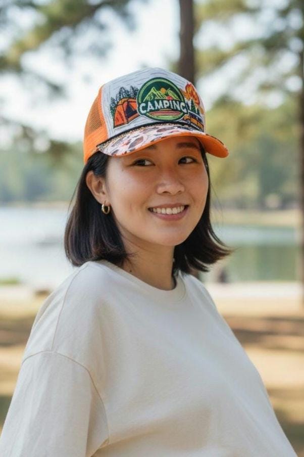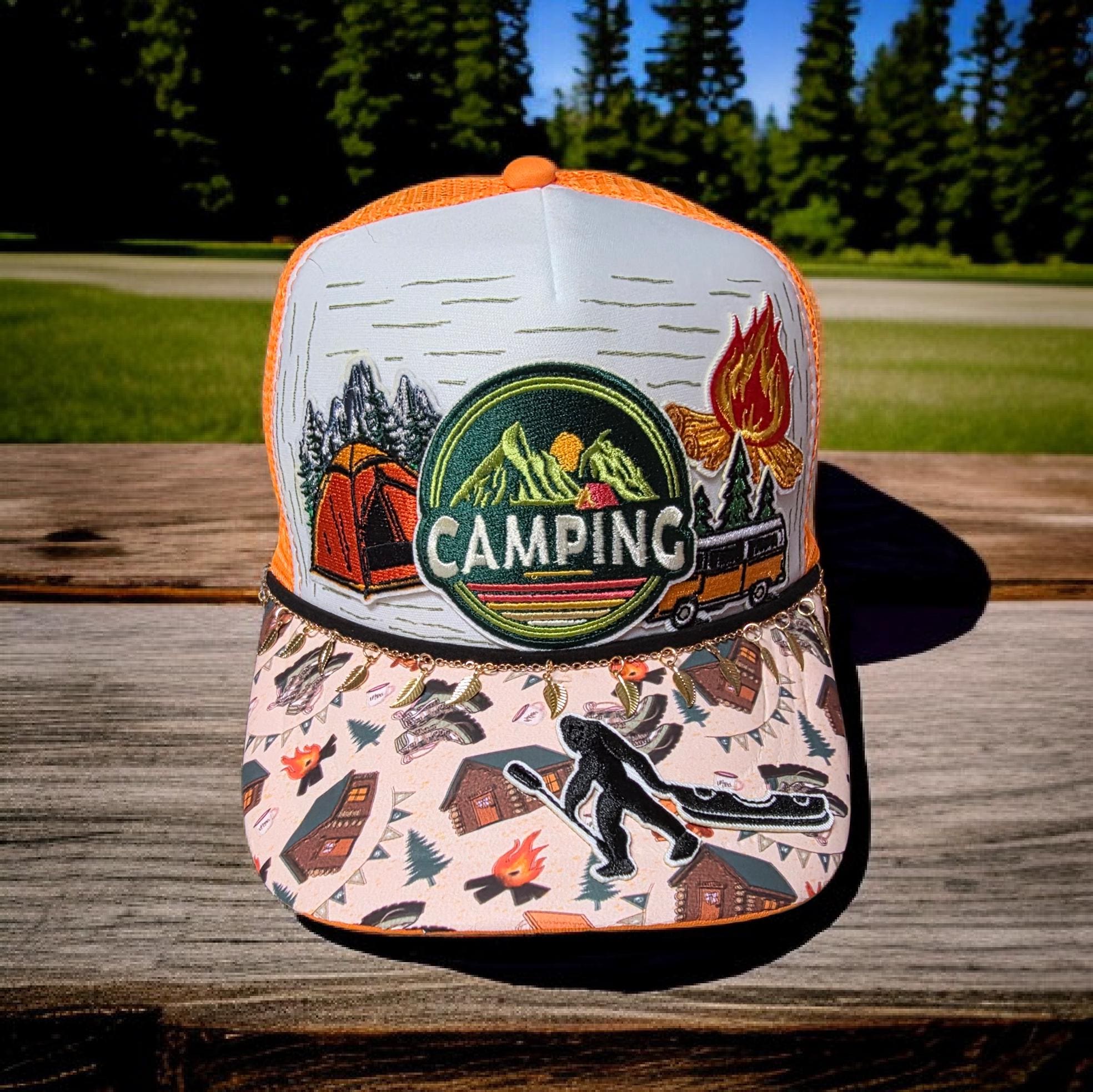 Really cute baseball cap with bling. Hand crafted with patches, paint and chains. Super cute handcrafted hat for your outdoor camper gal !