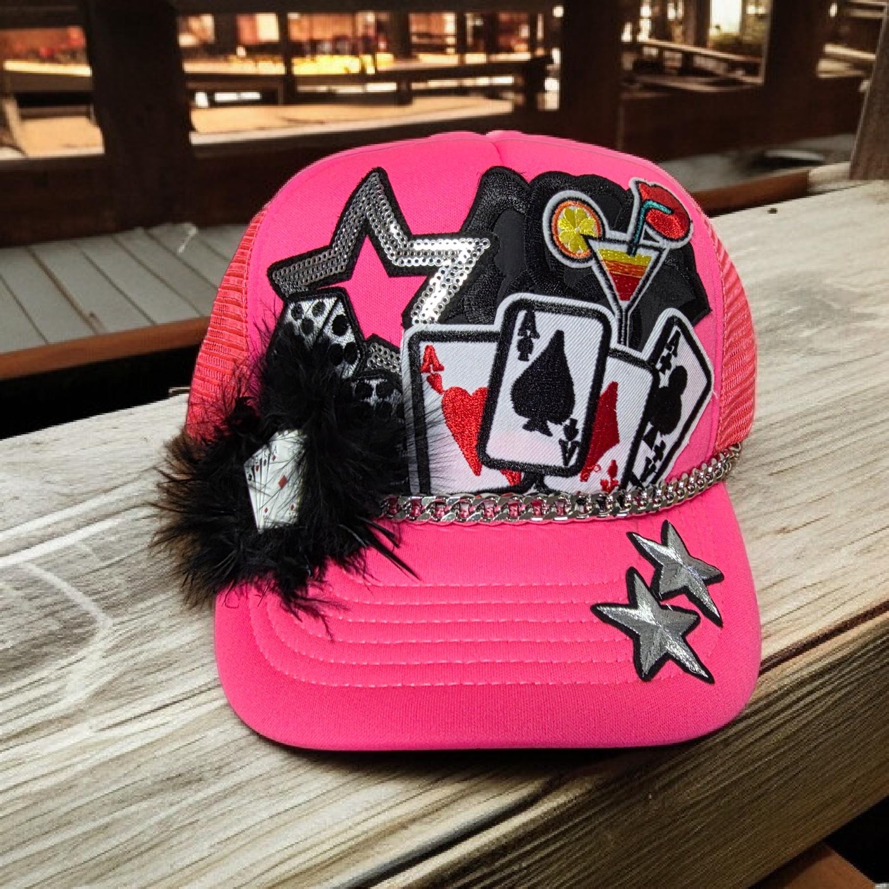 Really cute baseball cap with bling. Hand crafted with patches, chains and bling. Super cute slightly distressed look cap for your favorite card player.