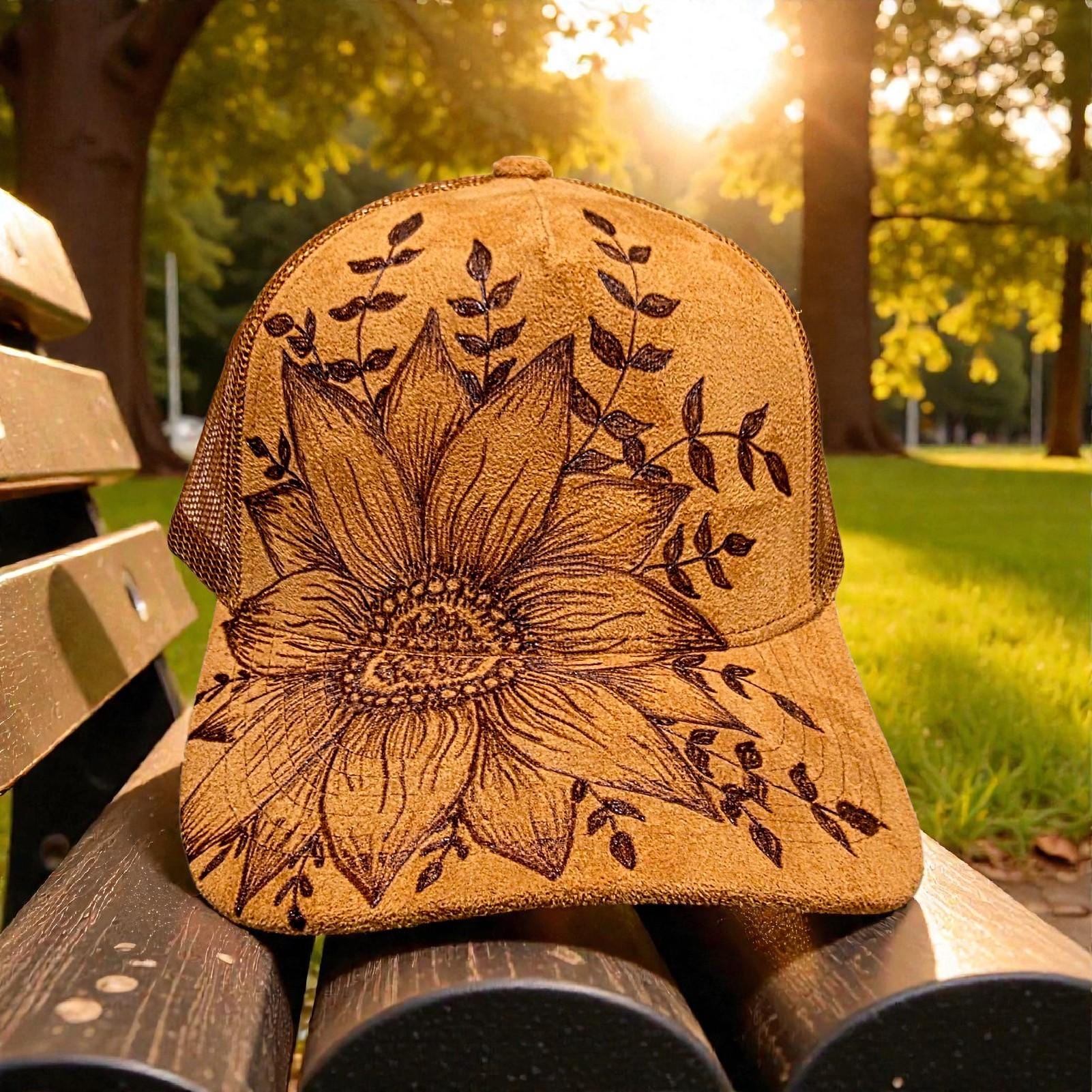Hand Burned - Camel Brown - faux suede - Sunflower Baseball Hat
