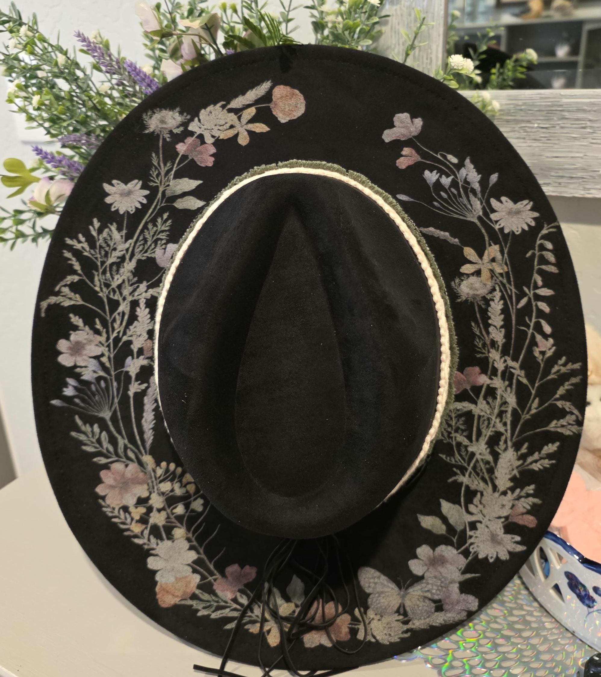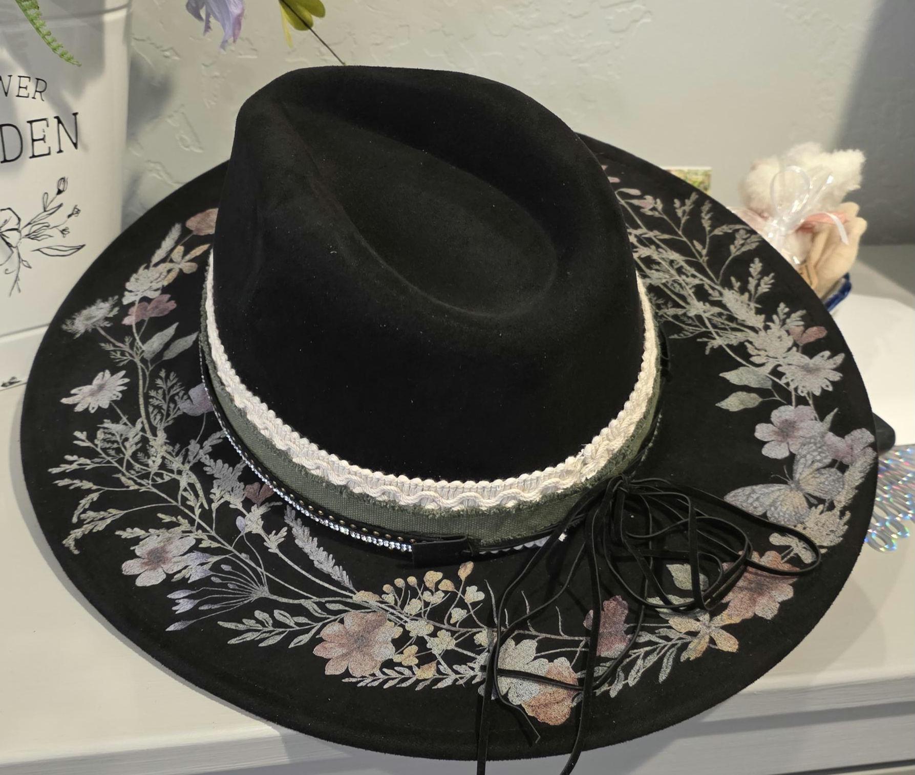 Pretty flowers, leaves and vines throughout brim and underneath.