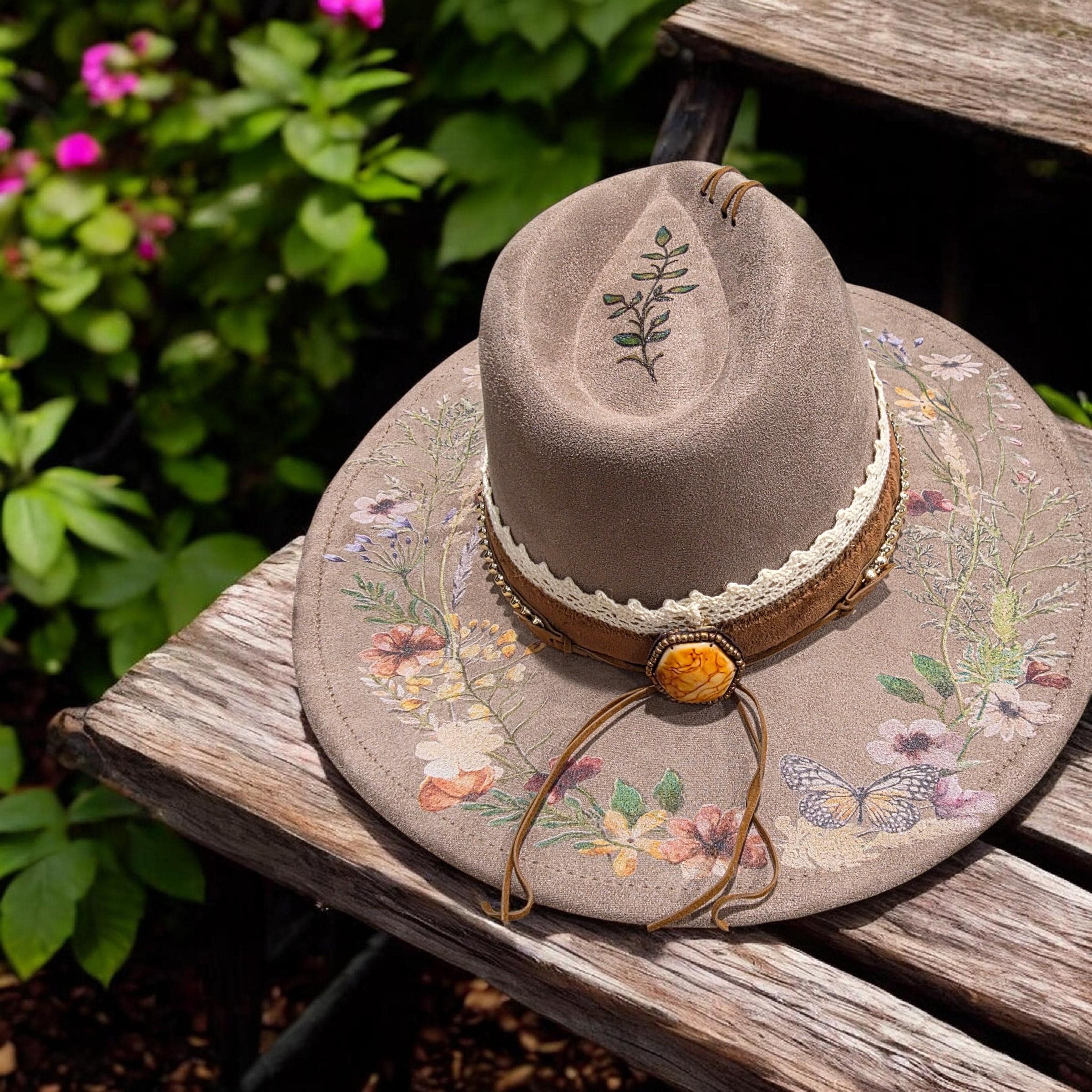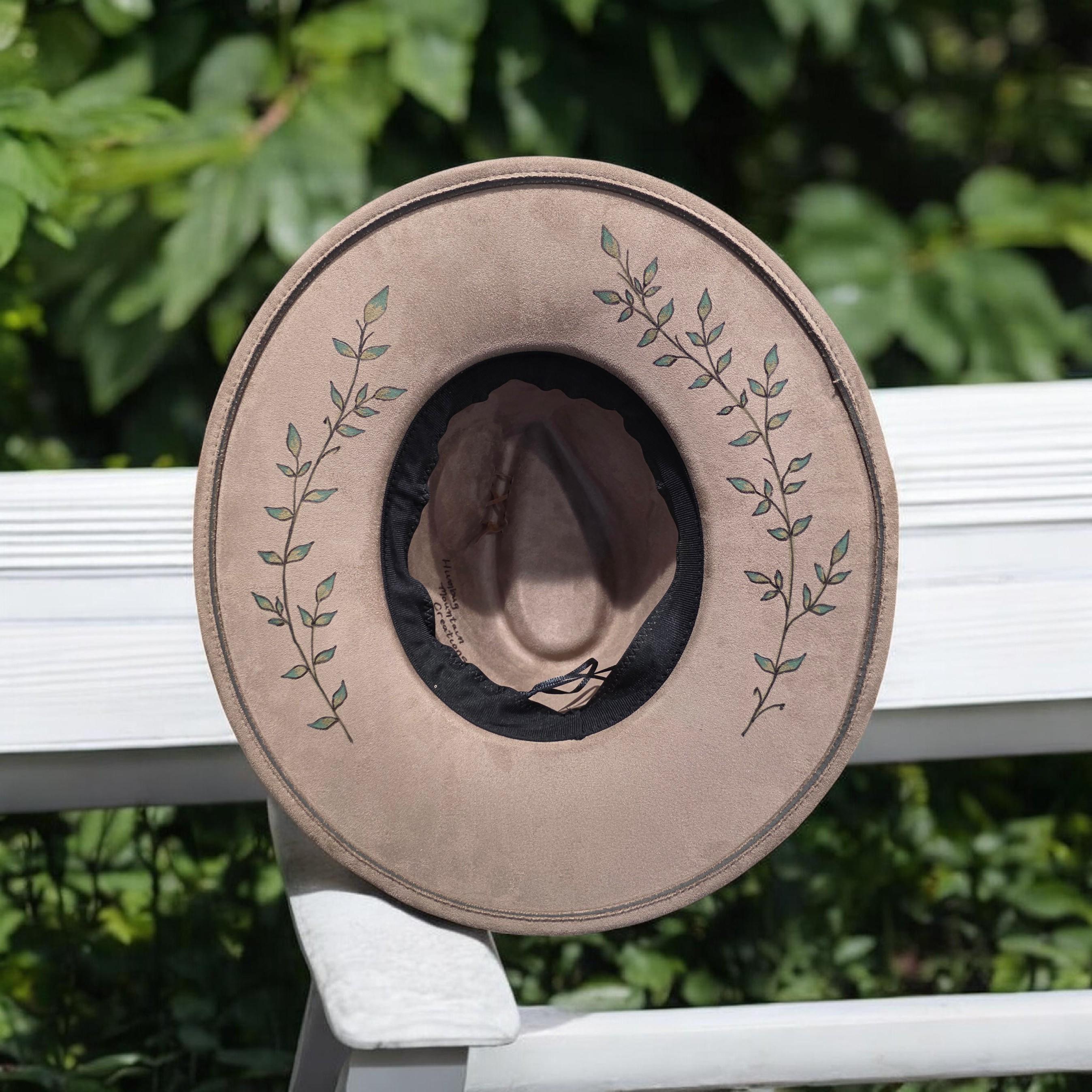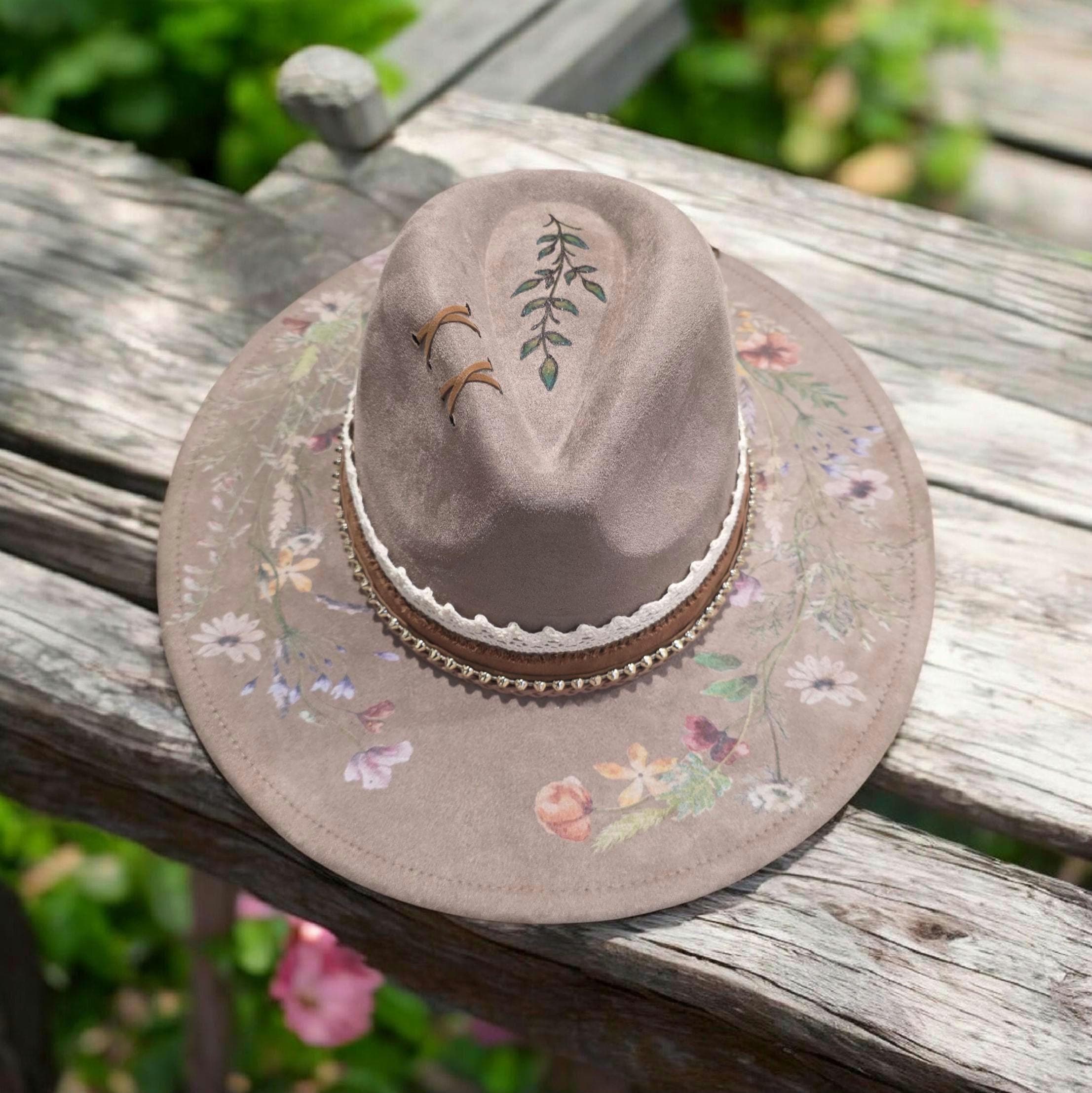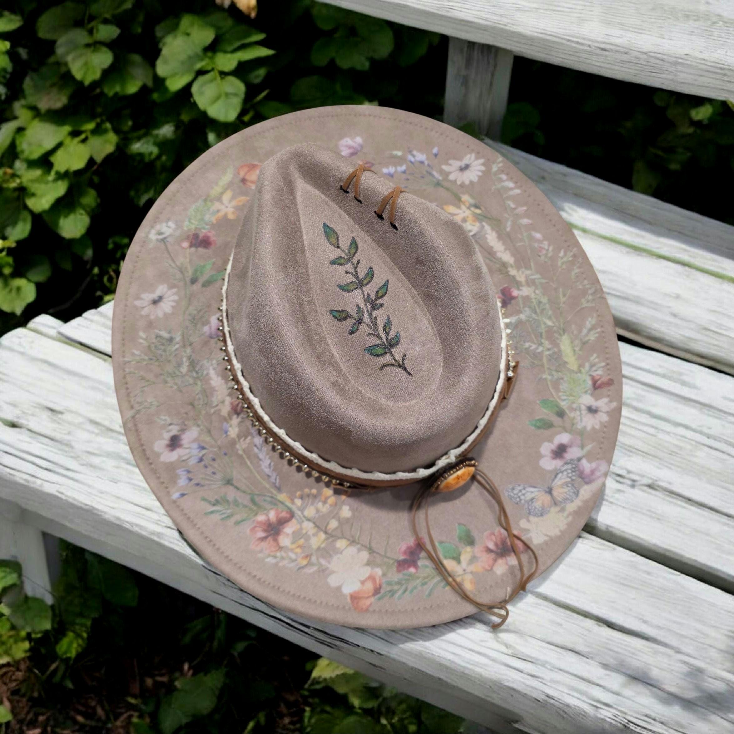 Pretty flowers, leaves and vines throughout brim and underneath.