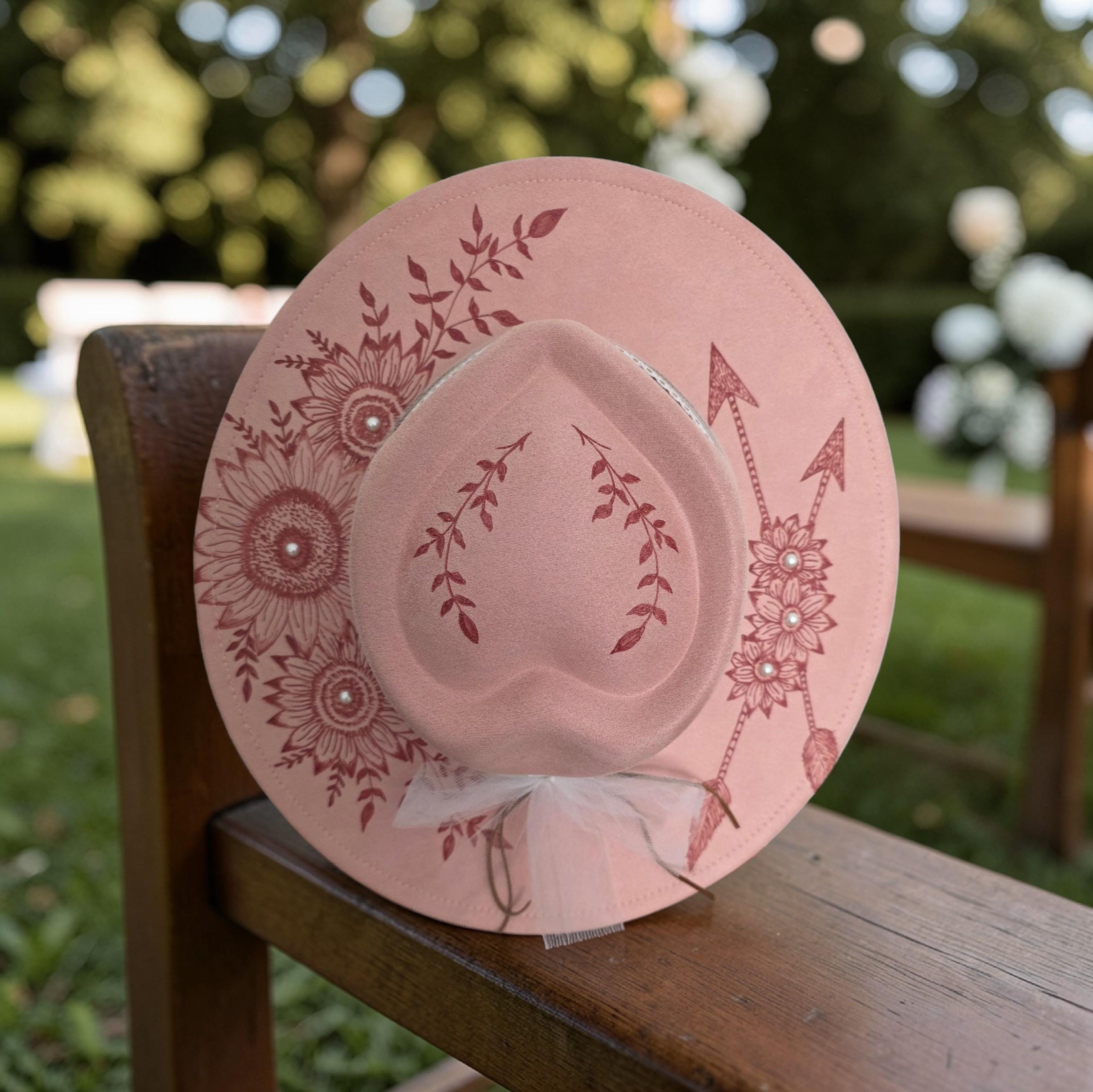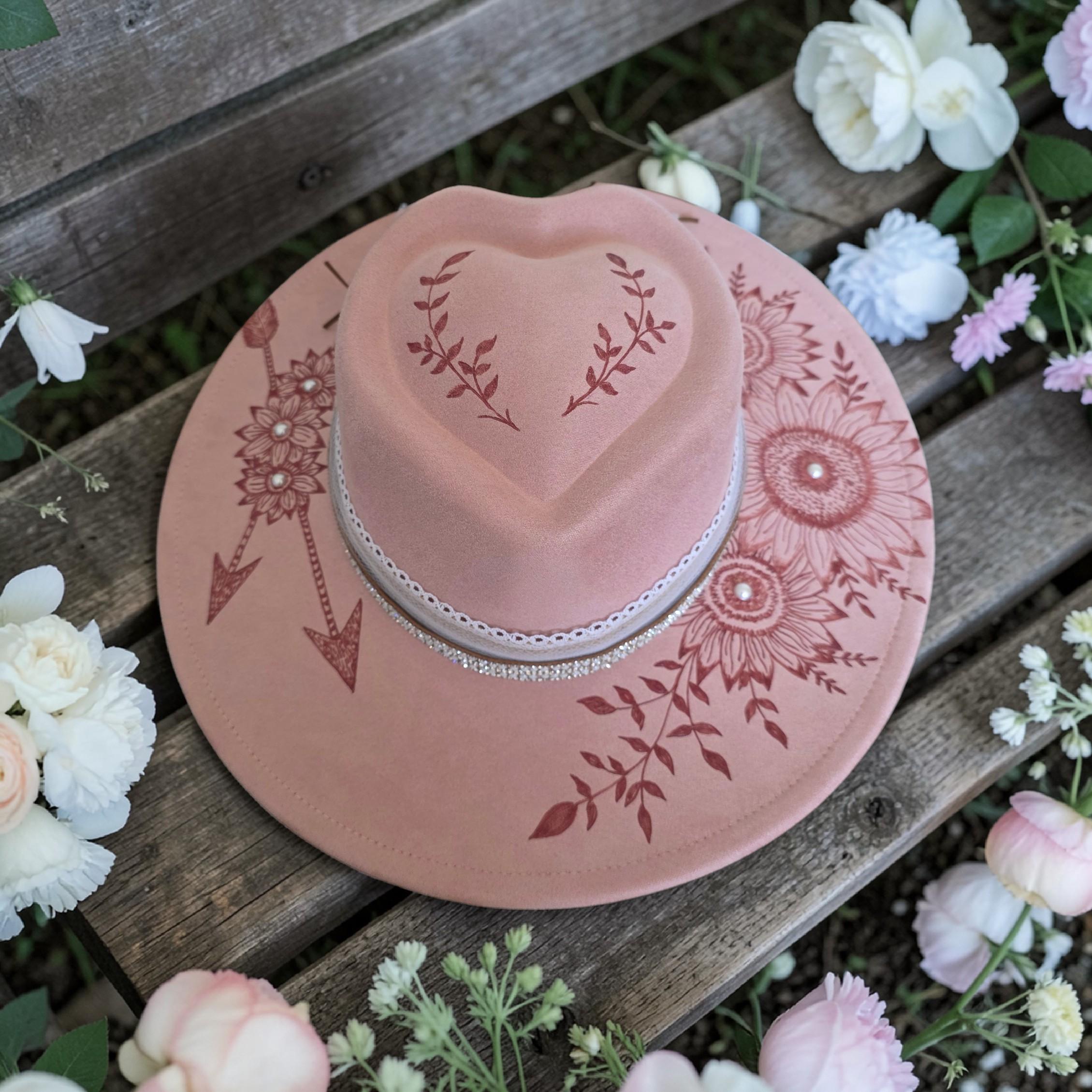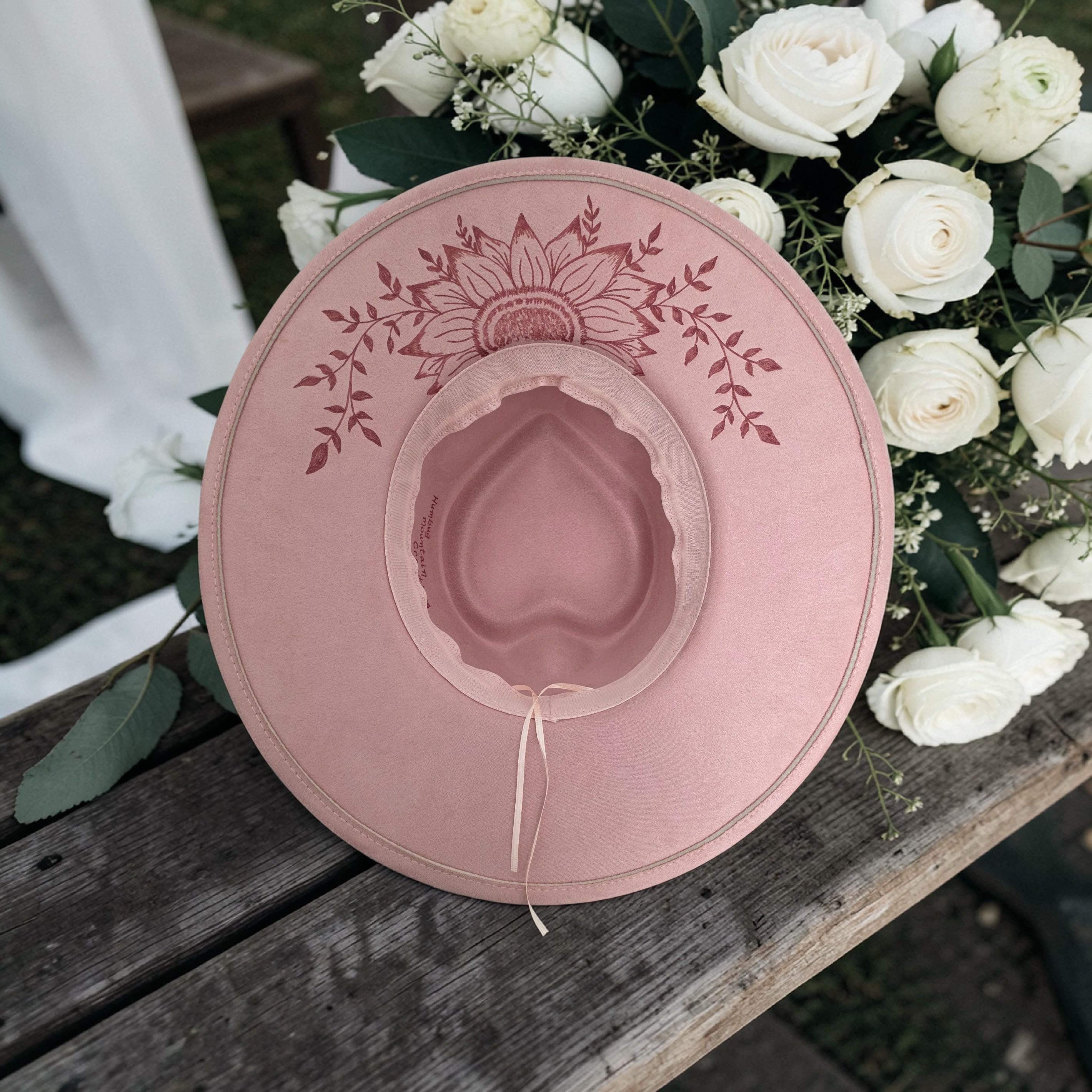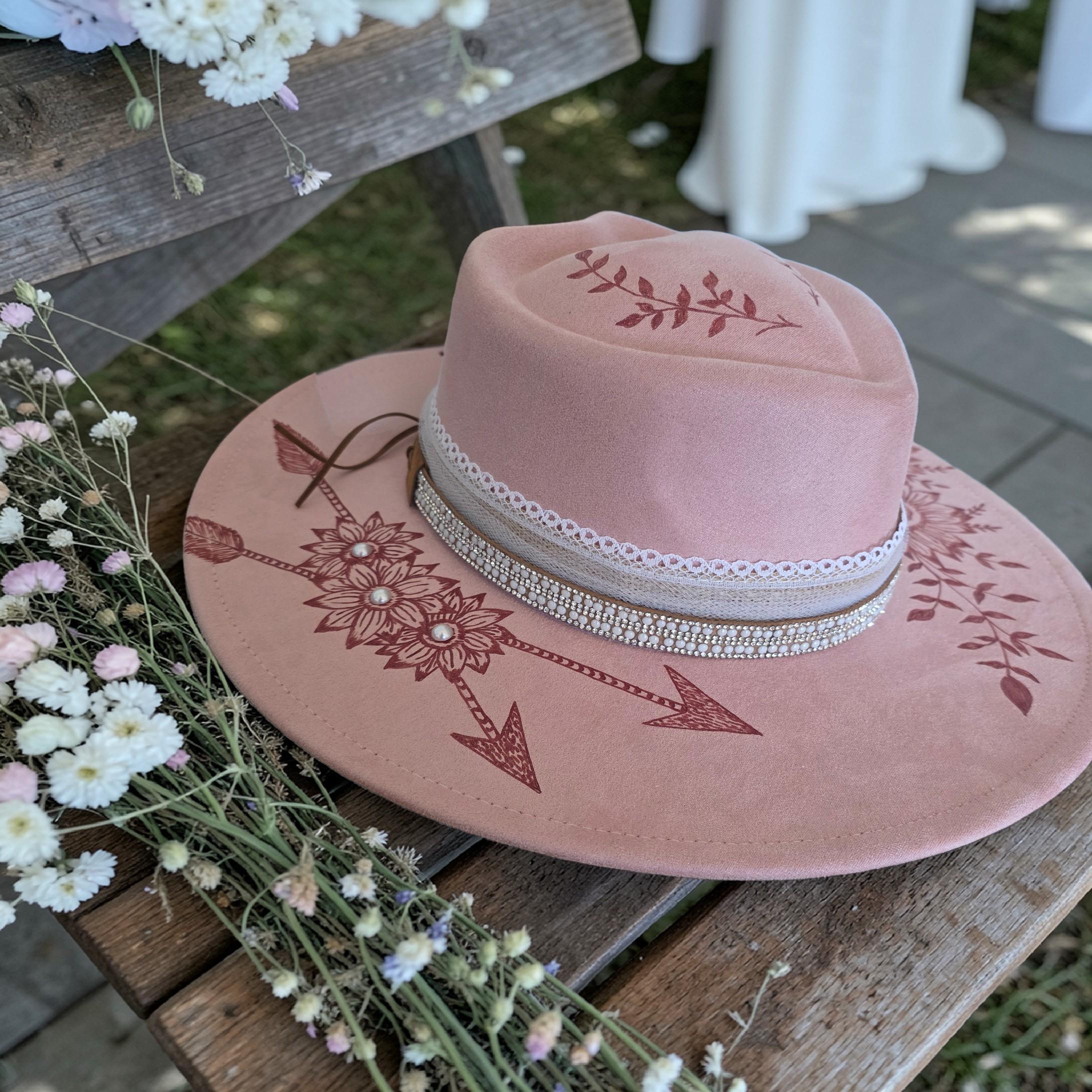 Simple and elegant - Really pretty pink colored "faux"suede Panama - Fedora - Western style hat. Hand burned, no laser used in the making of this hat.