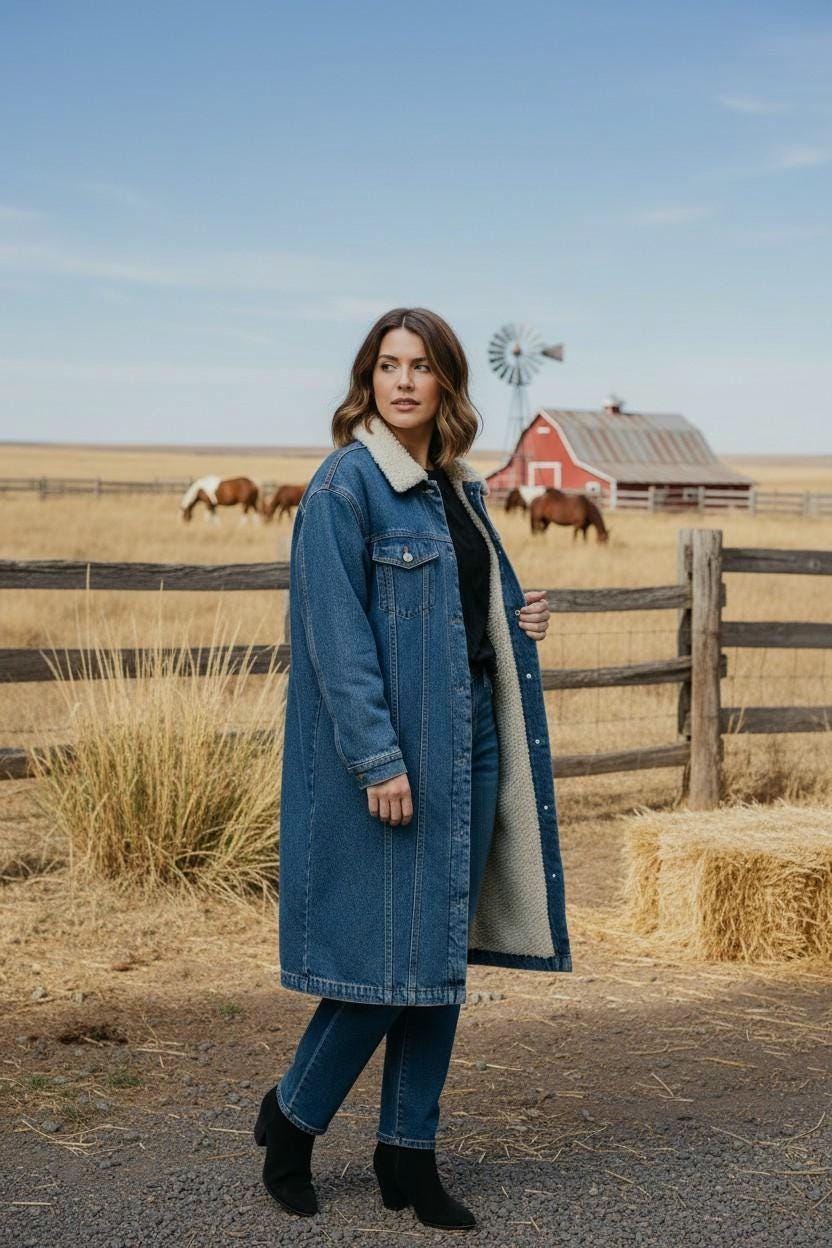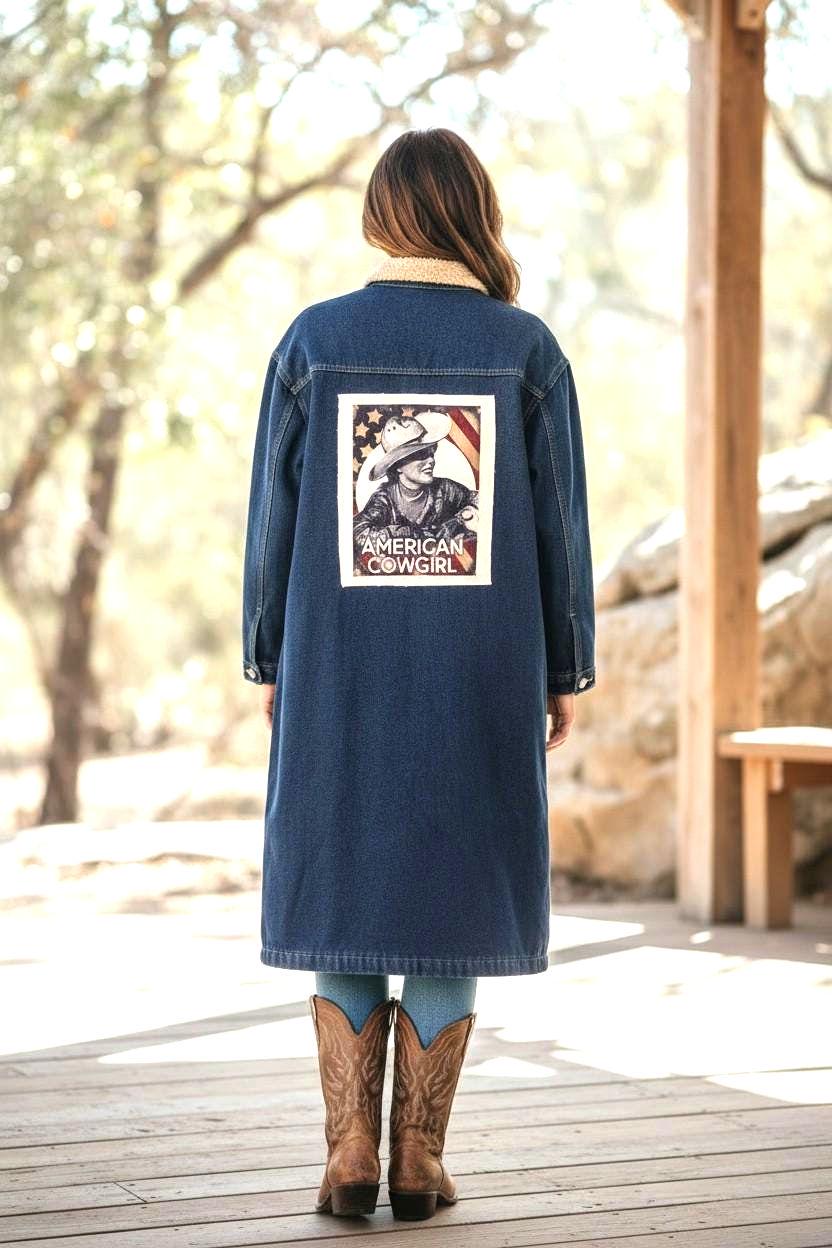 Blue denim fleece lined - warm - Rancher coat with cool cowgirl on back.