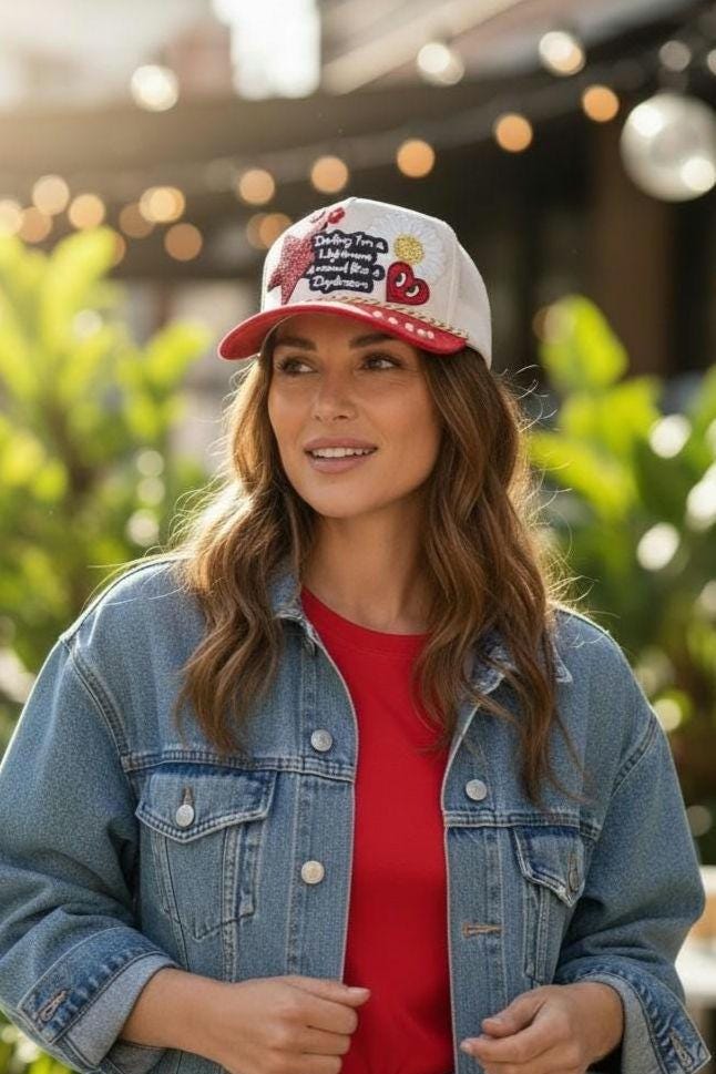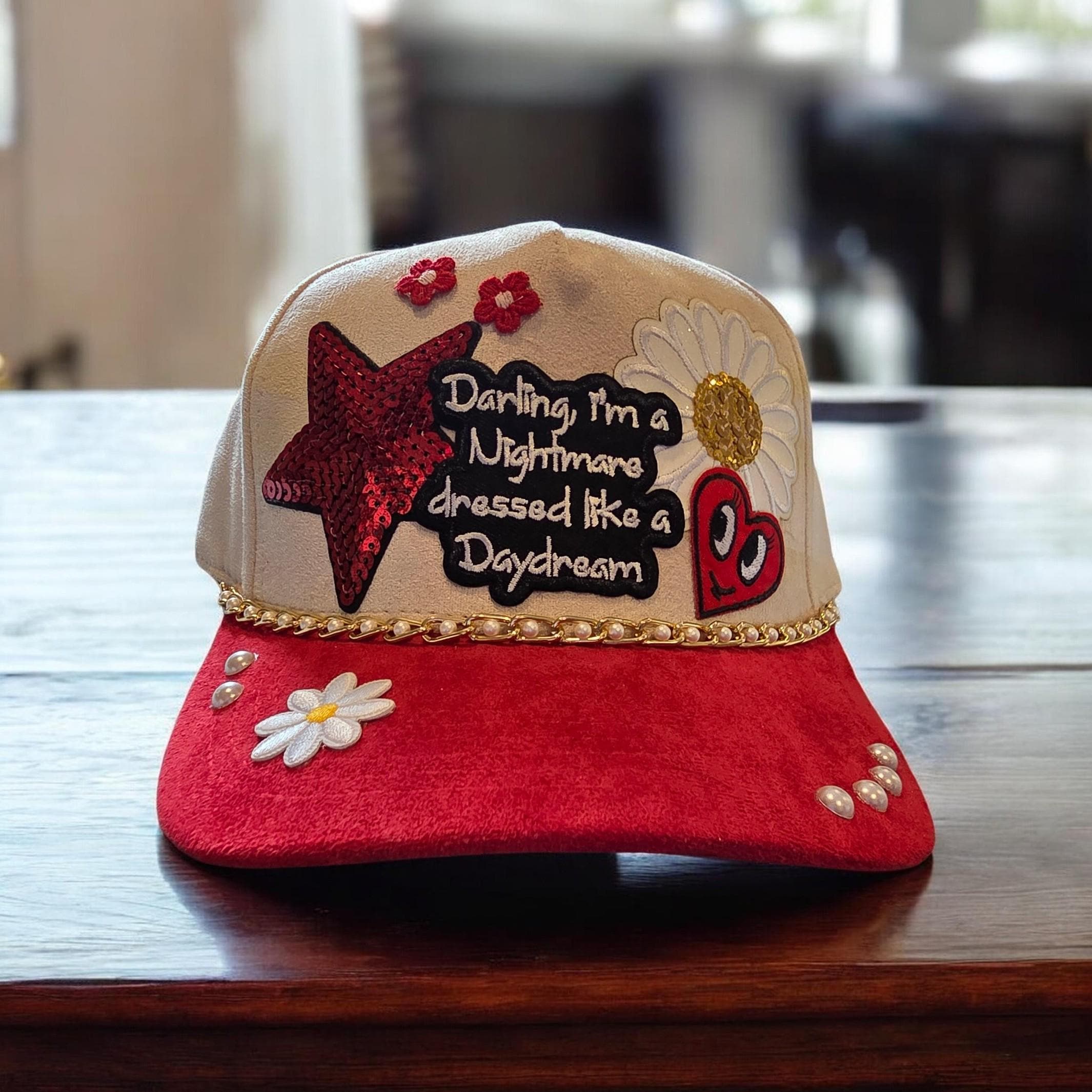 Really cute faux suede baseball cap with bling. Hand crafted with patches and chains. Super cute and lightweight hat for your favorite gal !